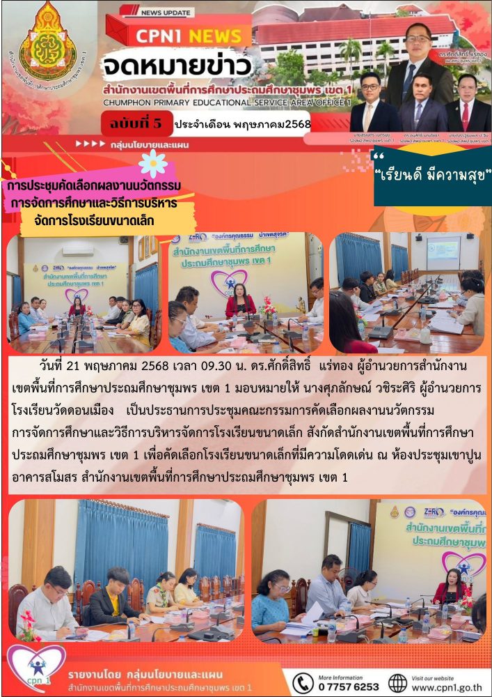 วันที่ 21 พฤษภาคม 2568 เวลา 09.30 น. ดร.ศักดิ์สิทธิ์ แร่ทอง ผู้อำนวยการสำนักงาน เขตพื้นที่การศึกษาประถมศึกษาชุมพร เขต 1 มอบหมายให้ นางศุภลักษณ์ วชิระศิริ ผู้อำนวยการโรงเรียนวัดดอนเมือง เป็นประธานการประชุมคณะกรรมการคัดเลือกผลงานนวัตกรรม การจัดการศึกษาและวิธีการบริหารจัดการโรงเรียนขนาดเล็ก สังกัดสำนักงานเขตพื้นที่การศึกษาประถมศึกษาชุมพร เขต 1 เพื่อคัดเลือกโรงเรียนขนาดเล็กที่มีความโดดเด่น ณ ห้องประชุมเขาปูน อาคารสโมสร สำนักงานเขตพื้นที่การศึกษาประถมศึกษาชุมพร เขต 1