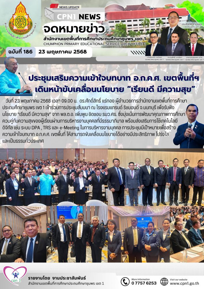 วันที่ 23 พฤษภาคม 2568 เวลา 09.00 น. ดร.ศักดิ์สิทธิ์ แร่ทอง ผู้อำนวยการสำนักงานเขตพื้นที่การศึกษาประถมศึกษาชุมพร เขต 1 เข้าร่วมการประชุมสัมมนา ณ โรงแรมแกรนด์ ริชมอนด์ จ.นนทบุรี เพื่อรับฟังนโยบาย "เรียนดี มีความสุข" จาก พล.ต.อ. เพิ่มพูน ชิดชอบ รมว.ศธ. ซึ่งมุ่งเน้นการพัฒนาคุณภาพการศึกษา ควบคู่กับความสุขของผู้เรียนผ่านการบริหารงานบุคคลที่มีธรรมาภิบาล พร้อมส่งเสริมการใช้เทคโนโลยีดิจิทัล เช่น ระบบ DPA , TRS และ e-Meeting ในการบริหารงานบุคคล การประชุมมีเป้าหมายเพื่อสร้าง ความเข้าใจบทบาท อ.ก.ค.ศ. เขตพื้นที่ ให้สามารถขับเคลื่อนนโยบายได้อย่างมีประสิทธิภาพ โปร่งใส และเป็นธรรมทั่วประเทศ
