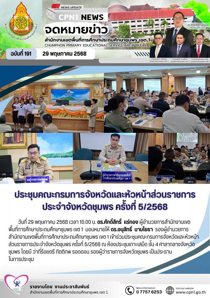 วันที่ 29 พฤษภาคม 2568 เวลา 10.00 น. ดร.ศักดิ์สิทธิ์ แร่ทอง ผู้อำนวยการสำนักงานเขต พื้นที่การศึกษาประถมศึกษาชุมพร เขต 1 มอบหมายให้ ดร.อนุสิทธิ์ นามโยธา รองผู้อำนวยการสำนักงานเขตพื้นที่การศึกษาประถมศึกษาชุมพร เขต 1 เข้าร่วมประชุมคณะกรมการจังหวัดและหัวหน้าส่วนราชการประจำจังหวัดชุมพร ครั้งที่ 5/2568 ณ ห้องประชุมเกาะเสม็ด ชั้น 4 ศาลากลางจังหวัดชุมพร โดยมี ว่าที่ร้อยตรี กิตติภพ รอดดอน รองผู้ว่าราชการจังหวัดชุมพร เป็นประธานในการประชุม