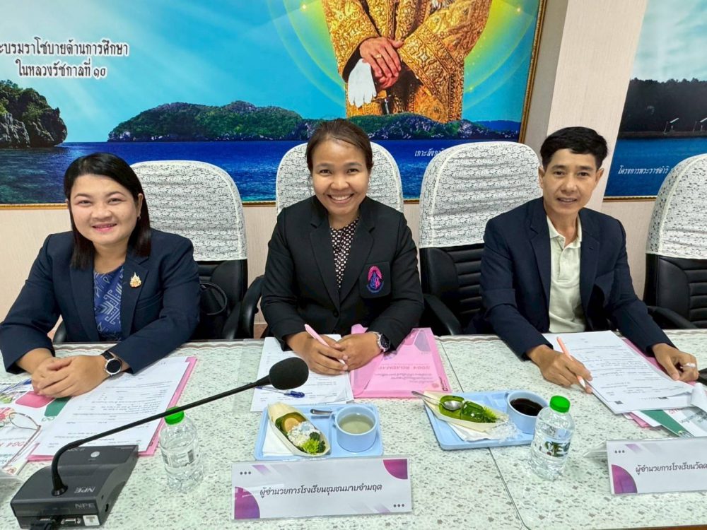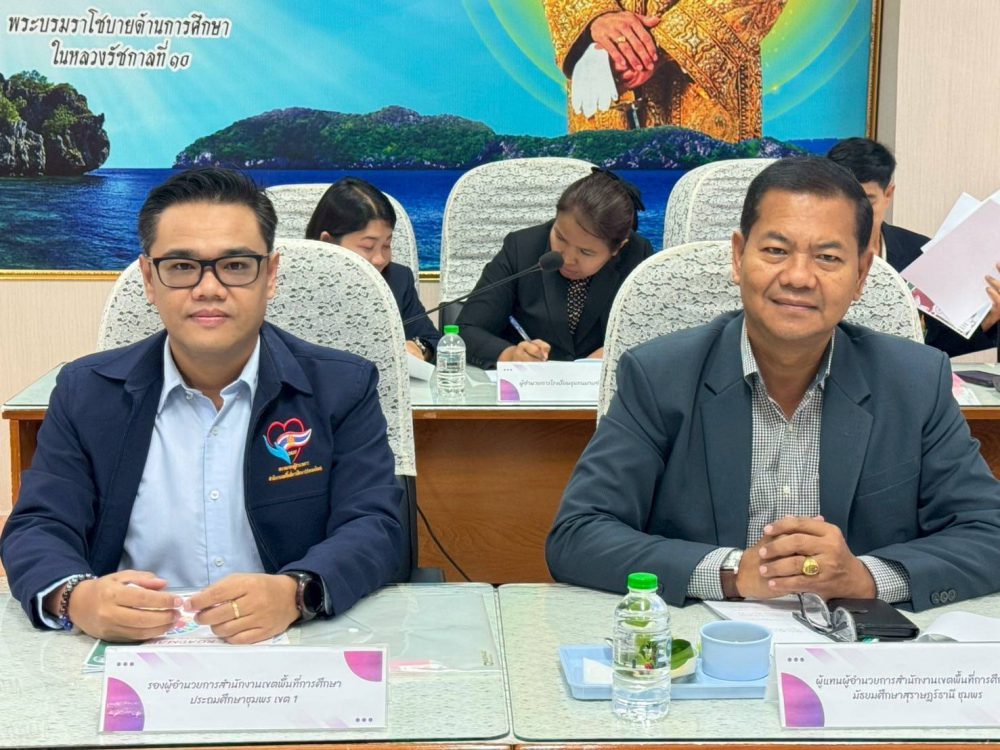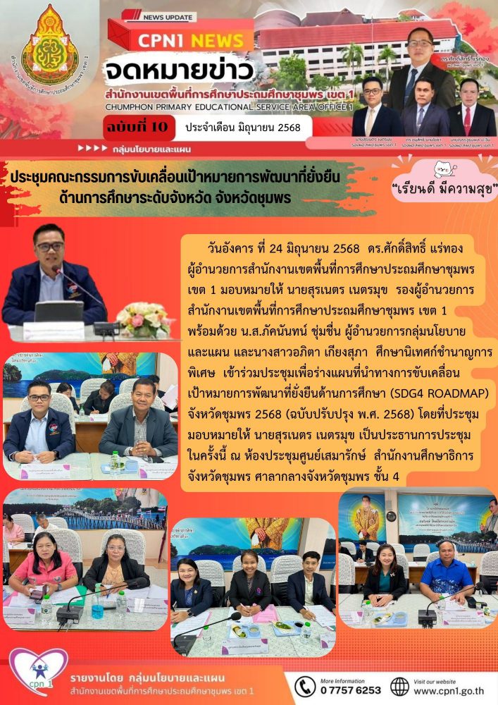 วันอังคาร ที่ 24 มิถุนายน 2568 ดร.ศักดิ์สิทธิ์ แร่ทองผู้อำนวยการสำนักงานเขตพื้นที่การศึกษาประถมศึกษาชุมพรเขต 1 มอบหมายให้ นายสุรเนตร เนตรมุข รองผู้อำนวยการสำนักงานเขตพื้นที่การศึกษาประถมศึกษาชุมพร เขต 1พร้อมด้วย น.ส.ภัคนันทน์ ชุ่มชื่น ผู้อำนวยการกลุ่มนโยบายและแผน และนางสาวอภิตา เกียงสุภา ศึกษานิเทศก์ชำนาญการพิเศษ เข้าร่วมประชุมเพื่อร่างแผนที่นำทางการขับเคลื่อนเป้าหมายการพัฒนาที่ยั่งยืนด้านการศึกษา (SDG4 ROADMAP) จังหวัดชุมพร 2568 (ฉบับปรับปรุง พ.ศ. 2568) โดยที่ประชุมมอบหมายให้ นายสุรเนตรเนตรมุข เป็นประธานการประชุมในครั้งนี้ ณ ห้องประชุมศูนย์เสมารักษ์ สำนักงานศึกษาธิการจังหวัดชุมพร ศาลากลางจังหวัดชุมพร ชั้น 4