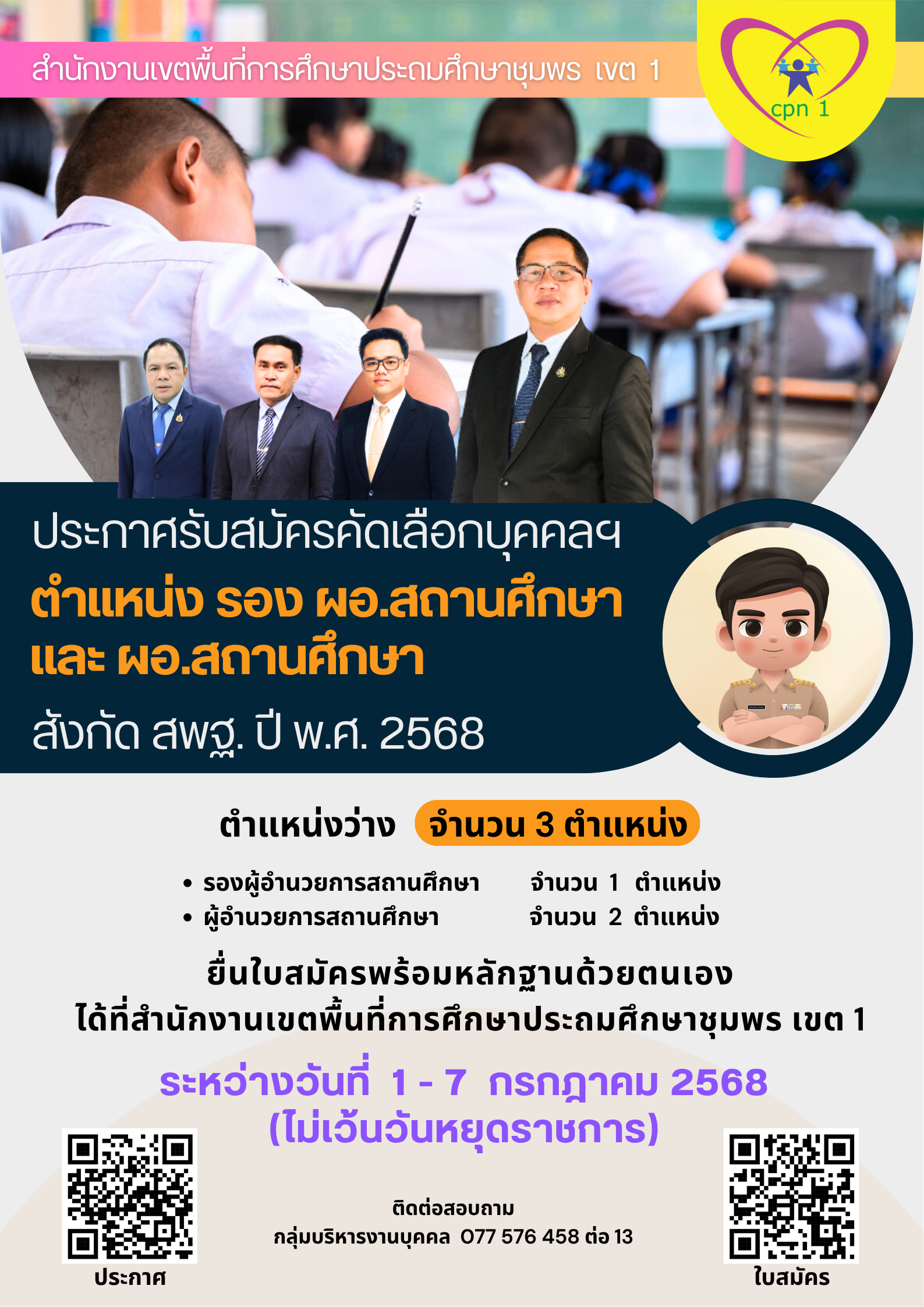 ประกาศรับสมัครคัดเลือกบุคคลเพื่อบรรจุและแต่งตั้งให้ดำรงตำแหน่งรองผู้อำนวยการสถานศึกษาและผู้อำนวยการสถานศึกษา สังกัด สพฐ. ปี พ.ศ.2568 24 มิถุนายน 256824 มิถุนายน 2025 กลุ่มบริหารงานบุคคล สพป.ชพ.1 การสรรหาและคัคเลือกบุคลากร, ข่าวและกิจกรรม สพป.ชพ.1, ข่าวและกิจกรรมกลุ่มบริหารงานบุคคล, ประกาศรับสมัครงาน FacebookFacebookXXLINELine กลุ่มบริหารงานบุคคล สพป.ชพ.1
