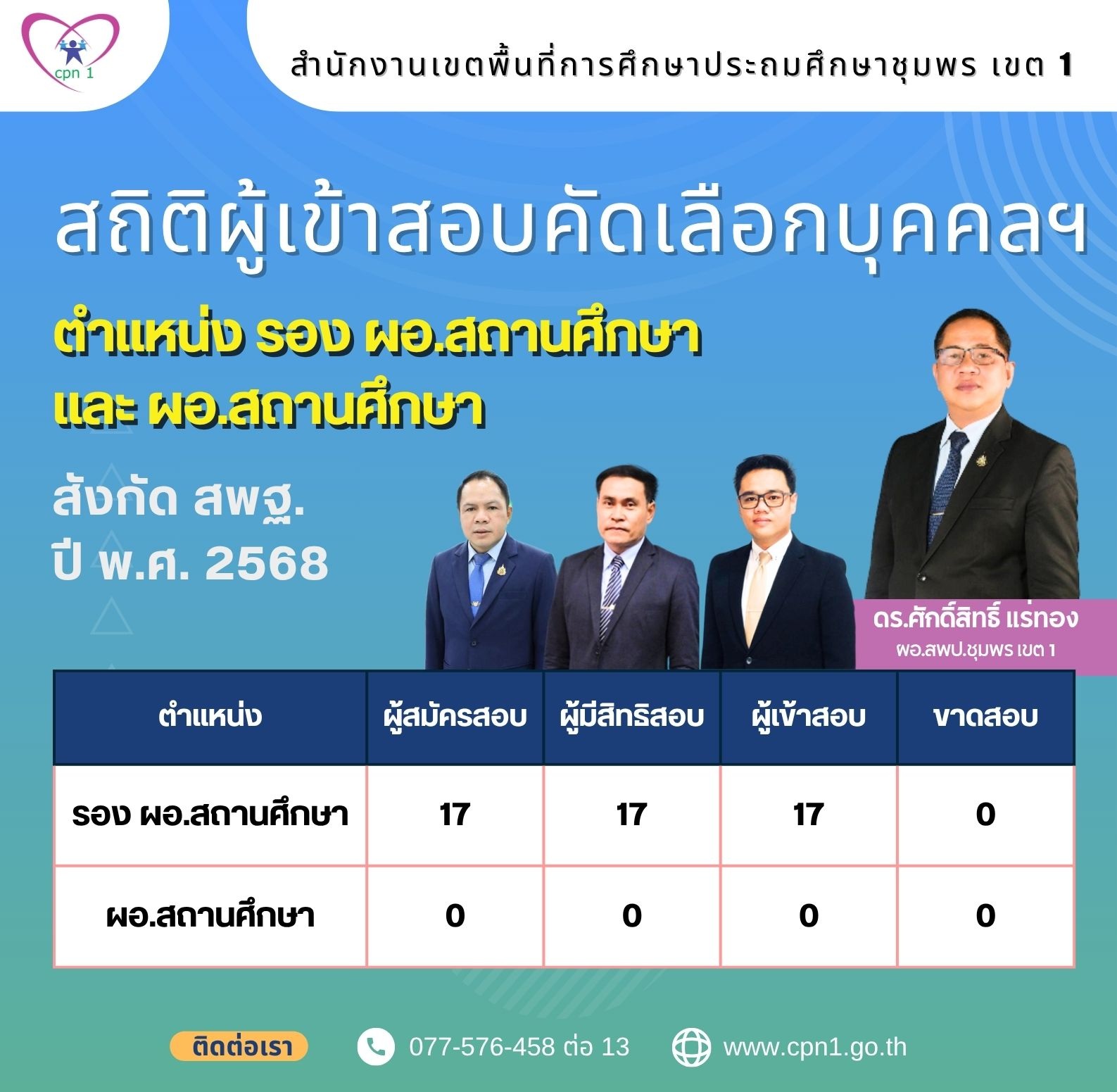 สถิติผู้เข้ารับการคัดเลือก ภาค ก ในการคัดเลือกบุคคลเพื่อบรรจุและแต่งตั้งให้ดำรงตำแหน่ง รองผู้อำนวยการสถานศึกษา และผู้อำนวยการสถานศึกษา สังกัด สพฐ.ปี พ.ศ.2568 26 กรกฎาคม 256826 กรกฎาคม 2025 กลุ่มบริหารงานบุคคล สพป.ชพ.1 ข่าวและกิจกรรม สพป.ชพ.1, ข่าวและกิจกรรมกลุ่มบริหารงานบุคคล FacebookFacebookXXLINELine กลุ่มบริหารงานบุคคล สพป.ชพ.1