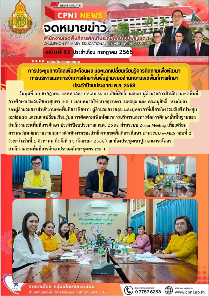 วันพุธที่ 30 กรกฎาคม 2568 เวลา 08.30 น. …. ดร.ศักดิ์สิทธิ์ แร่ทอง ผู้อำนวยการสำนักงานเขตพื้นที่การศึกษาประถมศึกษาชุมพร เขต 1 มอบหมายให้ นายสุรเนตร เนตรมุข และ ดร.อนุสิทธิ์ นามโยธา รองผู้อำนวยการสำนักงานเขตพื้นที่การศึกษาประถมศึกษาชุมพร เขต 1 ผู้อำนวยการกลุ่ม และบุคลากรที่เกี่ยวข้องเข้าร่วมรับฟังประชุมสะท้อนผล และแลกเปลี่ยนเรียนรู้ผลการติดตามเพื่อพัฒนาการบริหารและการจัดการศึกษาขั้นพื้นฐานของสำนักงานเขตพื้นที่การศึกษา ประจำปีงบประมาณ พ.ศ. 2568 ผ่านระบบ Zoom Meeting เพื่อเตรียมความพร้อมก่อนรายงานผลการดำเนินงานของสำนักงานเขตพื้นที่การศึกษา ผ่านระบบ e-MES รอบที่ 2 (ระหว่างวันที่ 1 สิงหาคม ถึงวันที่ 15 กันยายน 2568) ณ ห้องประชุมเขาปูน อาคารสโมสร สำนักงานเขตพื้นที่การศึกษาประถมศึกษาชุมพร เขต 1