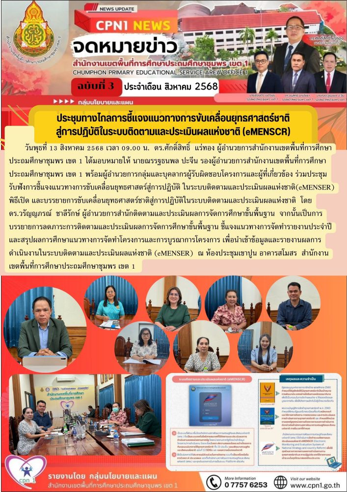 วันพุธที่ 13 สิงหาคม 2568 เวลา 09.00 น. ดร.ศักดิ์สิทธิ์ แร่ทอง ผู้อำนวยการสำนักงานเขตพื้นที่การศึกษาประถมศึกษาชุมพร เขต 1 ได้มอบหมายให้ นายณรรฐธนพล ปะจีน รองผู้อำนวยการสำนักงานเขตพื้นที่การศึกษาประถมศึกษาชุมพร เขต 1 พร้อมผู้อำนวยการกลุ่มและบุคลากรผู้รับผิดชอบโครงการและผู้ที่เกี่ยวข้อง ร่วมประชุมรับฟังการชี้แจงแนวทางการขับเคลื่อนยุทธศาสตร์สู่การปฏิบัติ ในระบบติดตามและประเมินผลแห่งชาติ(eMENSER) พิธีเปิด และบรรยายการขับเคลื่อนยุทธศาสตร์ชาติสู่การปฏิบัติในระบบติดตามและประเมินผลแห่งชาติ โดย ดร.วรัญญภรณ์ ชาลีรักษ์ ผู้อํานวยการสํานักติดตามและประเมินผลการจัดการศึกษาขั้นพื้นฐาน จากนั้นเป็นการ บรรยายการลดภาระการติดตามและประเมินผลการจัดการศึกษาขั้นพื้นฐาน ชี้แจงแนวทางการจัดทำรายงานประจำปี และสรุปผลการศึกษาแนวทางการจัดทำโครงการและการบูรณาการโครงการ เพื่อนำเข้าข้อมูลและรายงานผลการดำเนินงานในระบบติดตามและประเมินผลแห่งชาติ (eMENSER) ณ ห้องประชุมเขาปูน อาคารสโมสร สำนักงานเขตพื้นที่การศึกษาประถมศึกษาชุมพร เขต 1