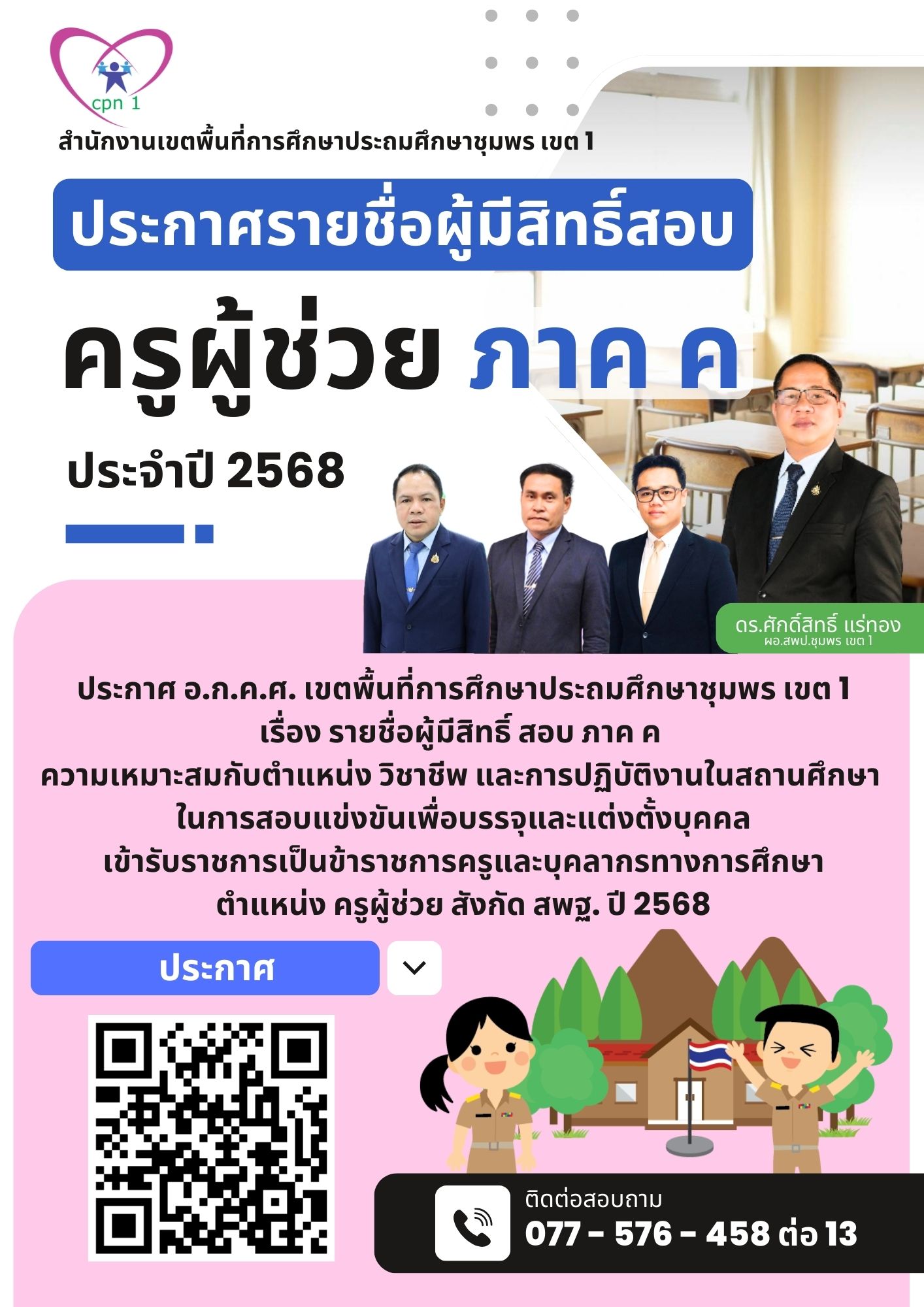 ประกาศ อ.ก.ค.ศ.เขตพื้นที่การศึกษาประถมศึกษาชุมพร เขต 1 เรื่อง รายชื่อผู้ผ่าน ภาค ก และภาค ข มีสิทธิเข้ารับการประเมิน ภาค ค ในการสอบแข่งขันเพื่อบรรจุและแต่งตั้งบุคคลเข้ารับราชการเป็นข้าราชการครูและบุคลากรทางการศึกษา ตำแหน่งครูผู้ช่วย สังกัด สพฐ. ปี พ.ศ.2568