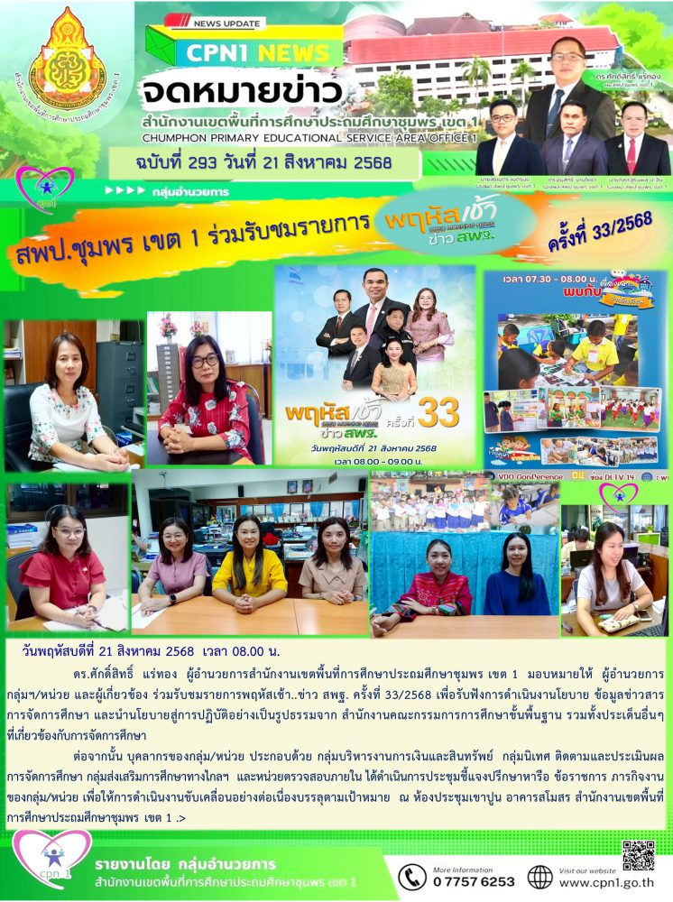 ดร.ศักดิ์สิทธิ์ แร่ทอง ผู้อำนวยการสำนักงานเขตพื้นที่การศึกษาประถมศึกษาชุมพร เขต 1 มอบหมายให้ ผู้อำนวยการกลุ่มฯ/หน่วย และผู้เกี่ยวข้อง ร่วมรับชมรายการพฤหัสเช้า..ข่าว สพฐ. ครั้งที่ 33/2568 เพื่อรับฟังการดำเนินงานโยบาย ข้อมูลข่าวสาร การจัดการศึกษา และนำนโยบายสู่การปฏิบัติอย่างเป็นรูปธรรมจาก สำนักงานคณะกรรมการการศึกษาขั้นพื้นฐาน รวมทั้งประเด็นอื่นๆ ที่เกี่ยวข้องกับการจัดการศึกษา