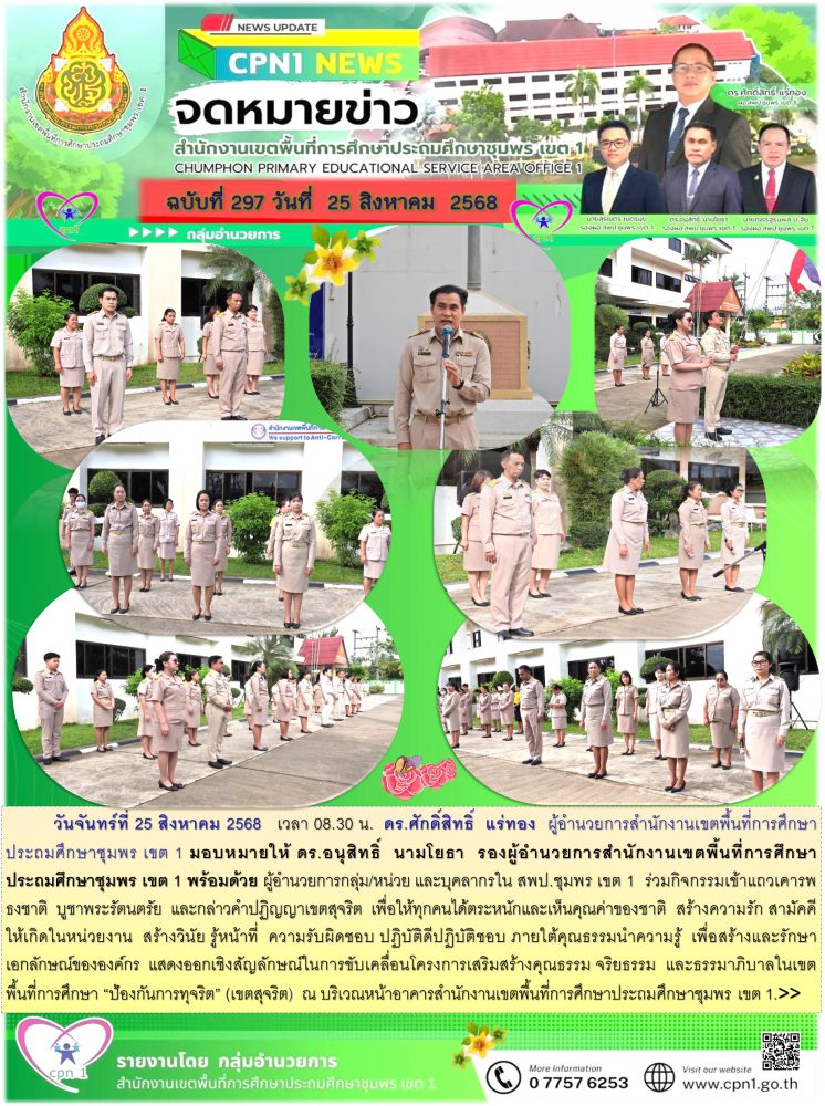 วันจันทร์ที่ 25 สิงหาคม 2568 เวลา 08.30 น. ดร.ศักดิ์สิทธิ์ แร่ทอง ผู้อำนวยการสำนักงานเขตพื้นที่การศึกษาประถมศึกษาชุมพร เขต 1 มอบหมายให้ ดร.อนุสิทธิ์ นามโยธา รองผู้อำนวยการสำนักงานเขตพื้นที่การศึกษาประถมศึกษาชุมพร เขต 1 พร้อมด้วย ผู้อำนวยการกลุ่ม/หน่วย และบุคลากรใน สพป.ชุมพร เขต 1 ร่วมกิจกรรมเข้าแถวเคารพธงชาติ บูชาพระรัตนตรัย และกล่าวคำปฏิญญาเขตสุจริต เพื่อให้ทุกคนได้ตระหนักและเห็นคุณค่าของชาติ สร้างความรัก สามัคคีให้เกิดในหน่วยงาน สร้างวินัย รู้หน้าที่ ความรับผิดชอบ ปฏิบัติดีปฏิบัติชอบ ภายใต้คุณธรรมนำความรู้ เพื่อสร้างและรักษาเอกลักษณ์ขององค์กร แสดงออกเชิงสัญลักษณ์ในการขับเคลื่อนโครงการเสริมสร้างคุณธรรม จริยธรรม และธรรมาภิบาลในเขตพื้นที่การศึกษา "ป้องกันการทุจริต" (เขตสุจริต) ณ บริเวณหน้าอาคารสำนักงานเขตพื้นที่การศึกษาประถมศึกษาชุมพร เขต 1.>>