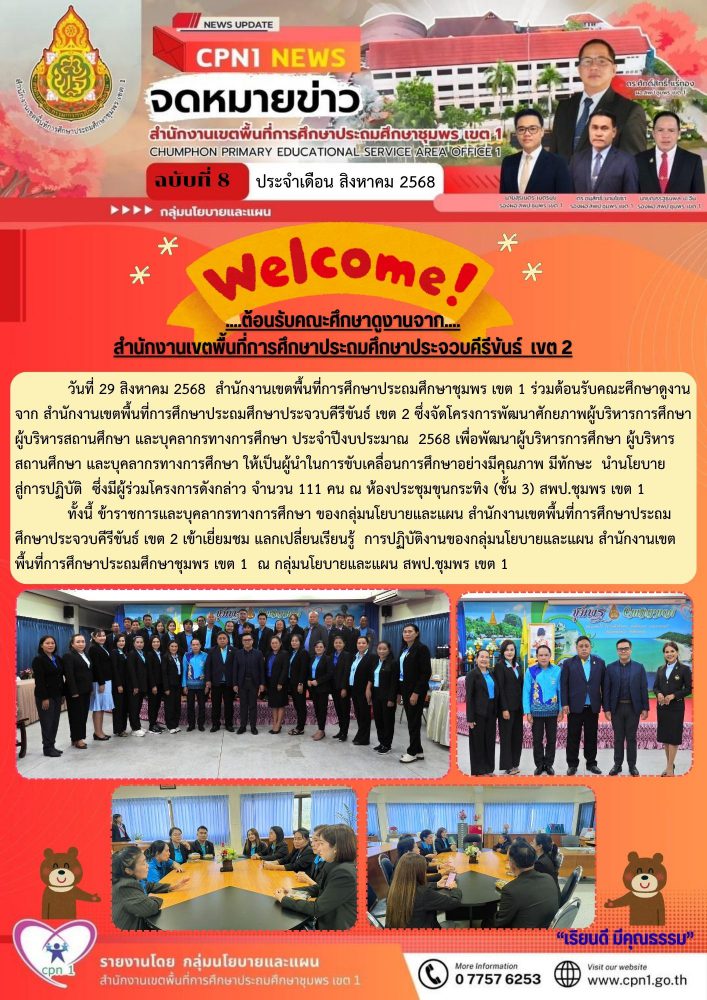 วันที่ 29 สิงหาคม 2568 สำนักงานเขตพื้นที่การศึกษาประถมศึกษาชุมพร เขต 1 ร่วมต้อนรับคณะศึกษาดูงานจาก สำนักงานเขตพื้นที่การศึกษาประถมศึกษาประจวบคีรีขันธ์ เขต 2 ซึ่งจัดโครงการพัฒนาศักยภาพผู้บริหารการศึกษา ผู้บริหารสถานศึกษา และบุคลากรทางการศึกษา ประจำปีงบประมาณ 2568 เพื่อพัฒนาผู้บริหารการศึกษา ผู้บริหารสถานศึกษา และบุคลากรทางการศึกษา ให้เป็นผู้นำในการขับเคลื่อนการศึกษาอย่างมีคุณภาพ มีทักษะ นำนโยบาย สู่การปฏิบัติ ซึ่งมีผู้ร่วมโครงการดังกล่าว จำนวน 111 คน ณ ห้องประชุมขุนกระทิง (ชั้น 3) สพป.ชุมพร เขต 1