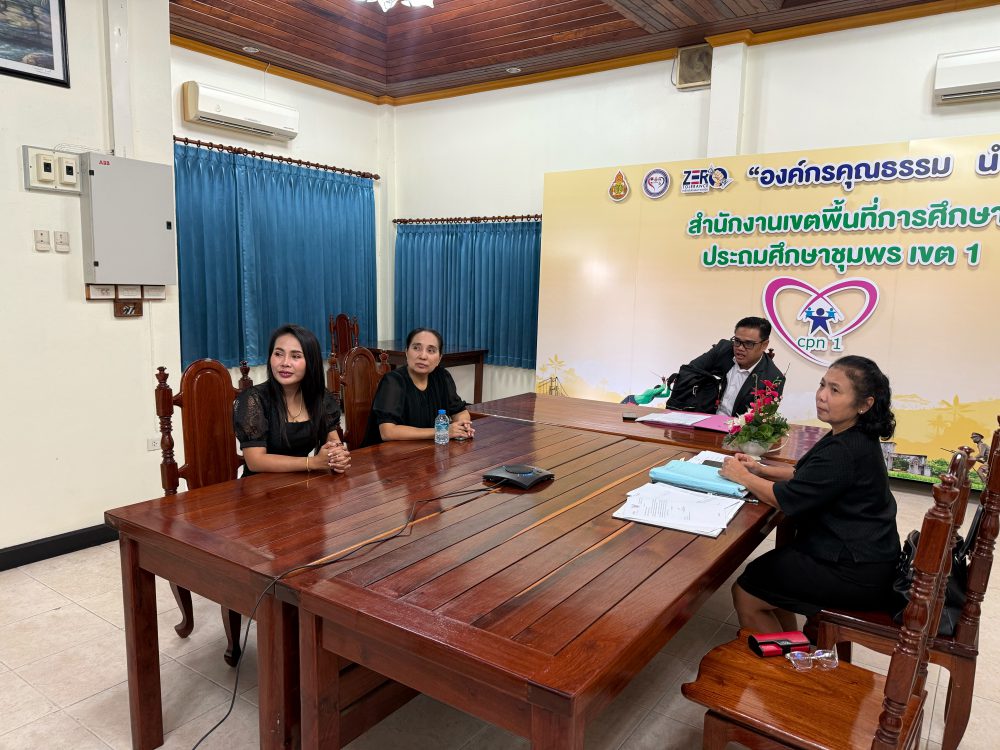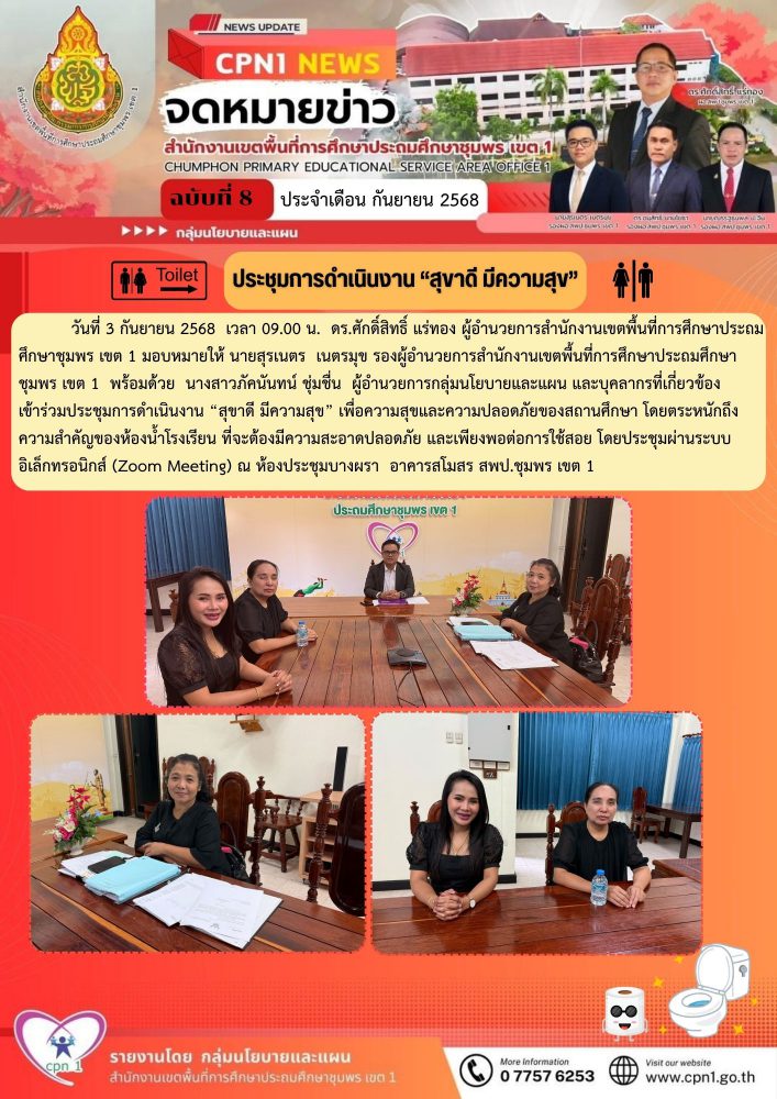 วันที่ 3 กันยายน 2568 เวลา 09.00 น. ดร.ศักดิ์สิทธิ์ แร่ทอง ผู้อำนวยการสำนักงานเขตพื้นที่การศึกษาประถมศึกษาชุมพร เขต 1 มอบหมายให้ นายสุรเนตร เนตรมุข รองผู้อำนวยการสำนักงานเขตพื้นที่การศึกษาประถมศึกษาชุมพร เขต 1 พร้อมด้วย นางสาวภัคนันทน์ ชุ่มชื่น ผู้อำนวยการกลุ่มนโยบายและแผน และบุคลากรที่เกี่ยวข้อง เข้าร่วมประชุมการดำเนินงาน "สุขาดี มีความสุข" เพื่อความสุขและความปลอดภัยของสถานศึกษา โดยตระหนักถึงความสำคัญของห้องน้ำโรงเรียน ที่จะต้องมีความสะอาดปลอดภัย และเพียงพอต่อการใช้สอย โดยประชุมผ่านระบบอิเล็กทรอนิกส์ (Zoom Meeting) ณ ห้องประชุมบางผรา อาคารสโมสร สพป.ชุมพร เขต 1