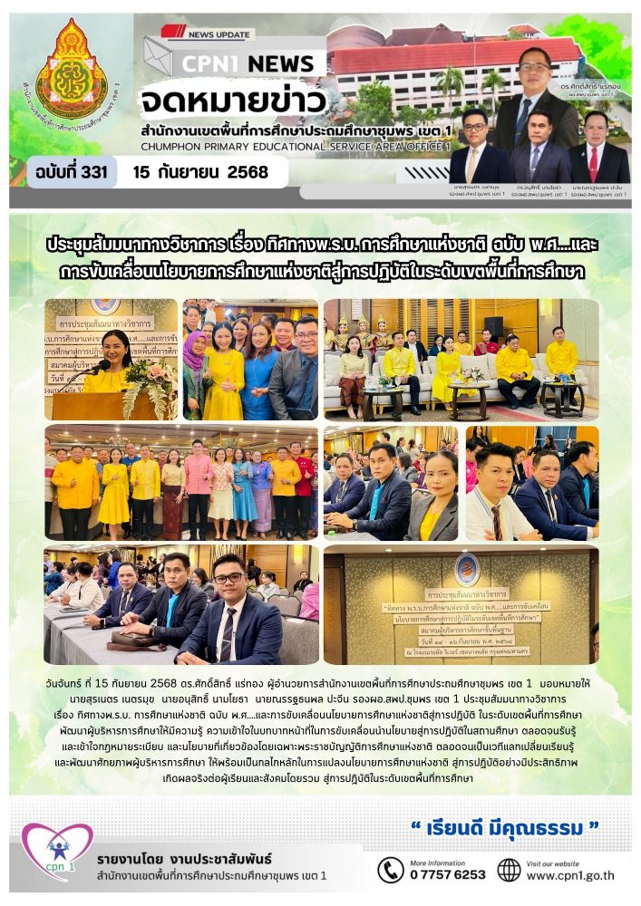 วันจันทร์ ที่ 15 กันยายน 2568 ดร.ศักดิ์สิทธิ์ แร่ทอง ผู้อำนวยการสำนักงานเขตพื้นที่การศึกษาประถมศึกษาชุมพร เขต 1 มอบหมายให้ นายสุรเนตร เนตรมุข นายอนุสิทธิ์ นามโยธา นายณรรฐธนพล ปะจีน รองผอ.สพป.ชุมพร เขต 1 ประชุมสัมมนาทางวิชาการเรื่อง ทิศทางพ.ร.บ. การศึกษาแห่งชาติ ฉบับ พ.ศ….และการขับเคลื่อนนโยบายการศึกษาแห่งชาติสู่การปฏิบัติ ในระดับเขตพื้นที่การศึกษา พัฒนาผู้บริหารการศึกษาให้มีความรู้ ความเข้าใจในบทบาทหน้าที่ในการขับเคลื่อนนำนโยบายสู่การปฏิบัติในสถานศึกษา ตลอดจนรับรู้และเข้าใจกฎหมายระเบียบ และนโยบายที่เกี่ยวข้องโดยเฉพาะพระราชบัญญัติการศึกษาแห่งชาติ ตลอดจนเป็นเวทีแลกเปลี่ยนเรียนรู้ และพัฒนาศักยภาพผู้บริหารการศึกษา ให้พร้อมเป็นกลไกหลักในการแปลงนโยบายการศึกษาแห่งชาติ สู่การปฏิบัติอย่างมีประสิทธิภาพเกิดผลจริงต่อผู้เรียนและสังคมโดยรวม สู่การปฏิบัติในระดับเขตพื้นที่การศึกษา