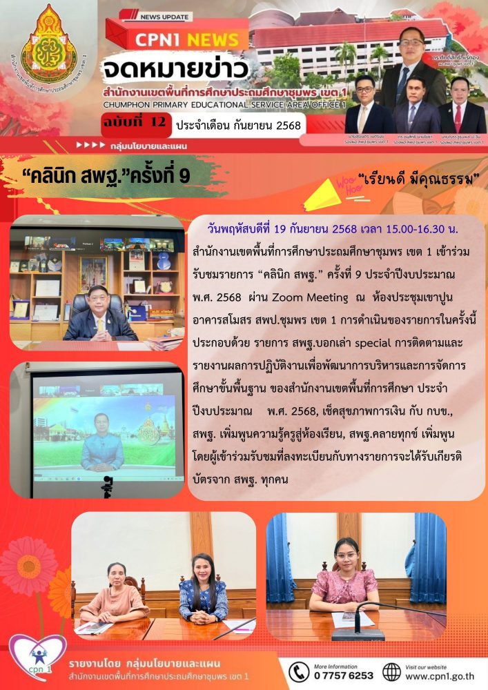 วันพฤหัสบดีที่ 19 กันยายน 2568 เวลา 15.00-16.30 น. สำนักงานเขตพื้นที่การศึกษาประถมศึกษาชุมพร เขต 1 เข้าร่วม รับชมรายการ "คลินิก สพฐ." ครั้งที่ 9 ประจำปีงบประมาณ พ.ศ. 2568 ผ่าน Zoom Meeting ณ ห้องประชุมเขาปูน อาคารสโมสร สพป.ชุมพร เขต 1 การดำเนินของรายการในครั้งนี้ ประกอบด้วย รายการ สพฐ.บอกเล่า special การติดตามและรายงานผลการปฏิบัติงานเพื่อพัฒนาการบริหารและการจัดการศึกษาขั้นพื้นฐาน ของสำนักงานเขตพื้นที่การศึกษา ประจำปีงบประมาณ พ.ศ. 2568, เช็คสุขภาพการเงิน กับ กบข., สพฐ. เพิ่มพูนความรู้ครูสู่ห้องเรียน, สพฐ.คลายทุกข์ เพิ่มพูน โดยผู้เข้าร่วมรับชมที่ลงทะเบียนกับทางรายการจะได้รับเกียรติบัตรจาก สพฐ. ทุกคน