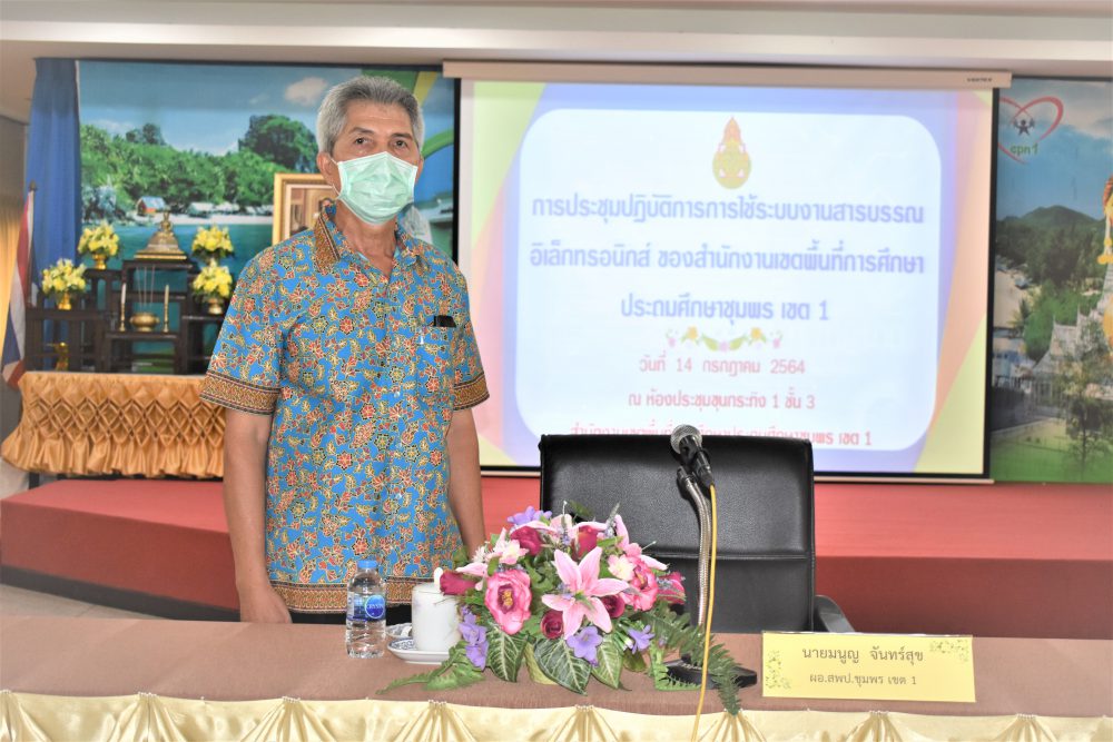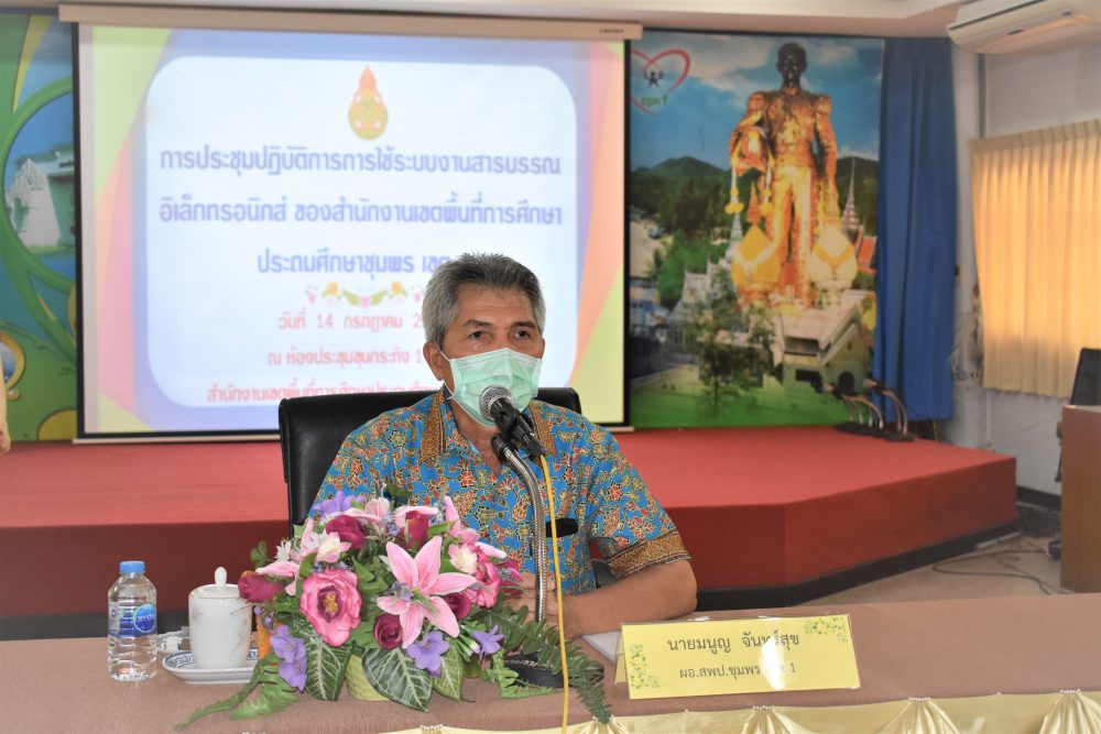 เมื่อวันที่ 14 กรกฎาคม 2564 เวลา 13.00 น. นายมนูญ จันทร์สุข ผู้อำนวยการสำนักงานเขตพื้นที่การศึกษาประถมศึกษาชุมพร เขต 1 เป็นประธานการประชุมเชิงปฏิบัติการการใช้โปรแกรมระบบงานสารบรรณอิเล็กทรอนิกส์ การจัดประชุมมีวัตถุประสงค์เพื่อให้บุคลากรของสำนักงานมีความรู้ความเข้าใจในระบบกระบวนงานของระบบสารบรรณอิเล็กทรอนิกส์และแนวปฏิบัติเกี่ยวกับงานสารบรรณ