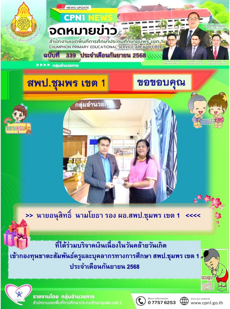 สพป.ชุมพร เขต 1 ขอขอบคุณบุคลากรในสังกัด ที่ได้ร่วมบริจาคเงินเนื่องในวันคล้ายวันเกิด เข้ากองทุนชาตะสัมพันธ์ครูและบุคลากรทางการศึกษา สพป.ชุมพร เขต 1 ประจำเดือนกันยายน 2568