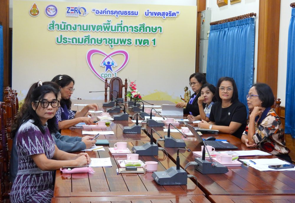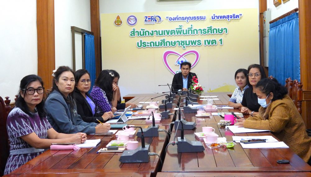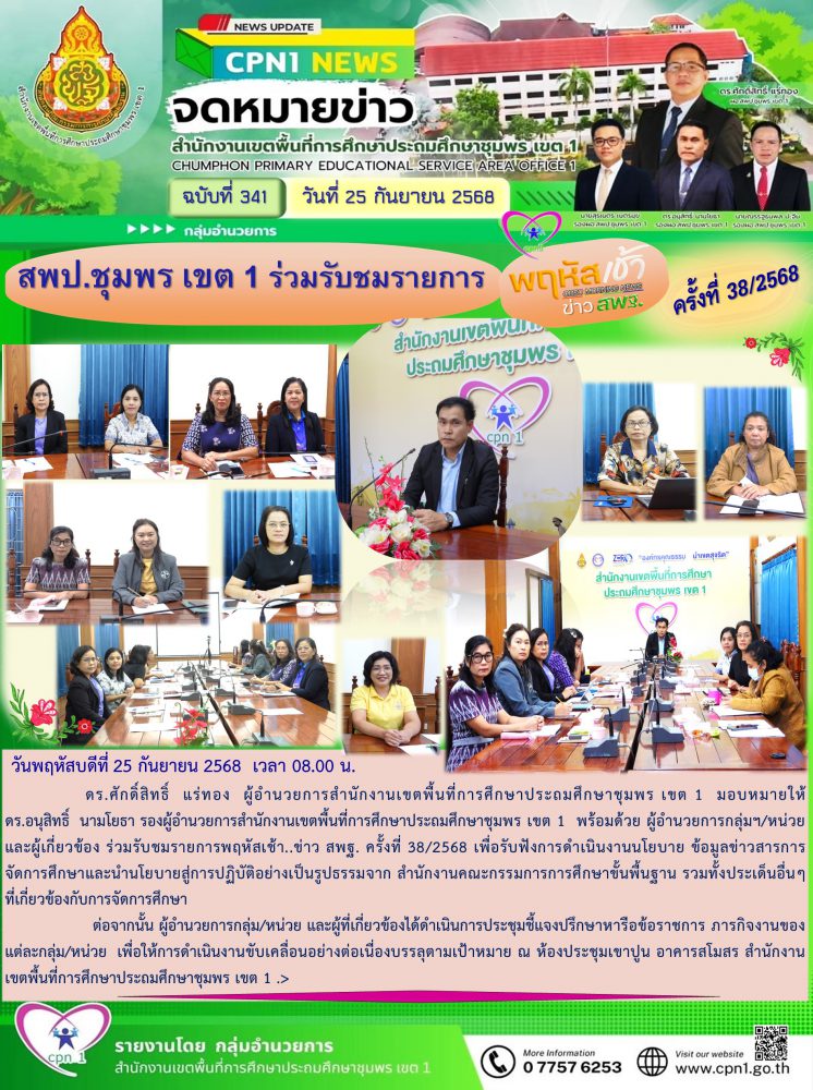 ดร.ศักดิ์สิทธิ์ แร่ทอง ผู้อำนวยการสำนักงานเขตพื้นที่การศึกษาประถมศึกษาชุมพร เขต 1 มอบหมายให้ ดร.อนุสิทธิ์ นามโยธา รองผู้อำนวยการสำนักงานเขตพื้นที่การศึกษาประถมศึกษาชุมพร เขต 1 พร้อมด้วย ผู้อำนวยการกลุ่มฯ/หน่วยและผู้เกี่ยวข้อง ร่วมรับชมรายการพฤหัสเช้า..ข่าว สพฐ. ครั้งที่ 38/2568 เพื่อรับฟังการดำเนินงานนโยบาย ข้อมูลข่าวสารการจัดการศึกษาและนำนโยบายสู่การปฏิบัติอย่างเป็นรูปธรรมจาก สำนักงานคณะกรรมการการศึกษาขั้นพื้นฐาน รวมทั้งประเด็นอื่นๆ ที่เกี่ยวข้องกับการจัดการศึกษา