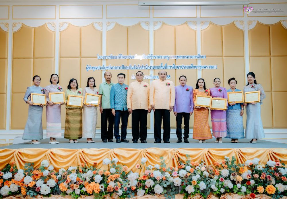 วันที่ 26 กันยายน 2568 เวลา 08.15 น. ดร.ศักดิ์สิทธิ์ แร่ทอง ผู้อำนวยการสำนักงานเขตพื้นที่การศึกษาประถมศึกษาชุมพร เขต 1 เป็นประธานจุดธูปเทียน บูชาพระรัตนตรัย ในพิธีเจริญพระพุทธมนต์ โดยมีพระสงฆ์ทรงสมณศักดิ์ จำนวน 9 รูปสวดเจริญพระพุทธมนต์ หลังพระสงฆ์อนุโมทนา ผู้เกษียณอายุราชการการ และแขกผู้มีเกียรติ ร่วมถวายปิ่นโตและจตุปัจจัยไทยธรรมแด่พระภิกษุสงฆ์ ต่อมาเวลา 09.15 น. นายอดิศร วิศาล รองนายแพทย์สาธารณสุขจังหวัดชุมพร ได้ให้เกียรติบรรยายให้ความรู้ในหัวข้อ "เทคนิคการดำรงชีวิตวัยเกษียณ อยู่อย่างไร สุขภาพดี มีความสุข" แก่ผู้ทำคุณประโยชน์ทางการศึกษา และผู้เข้าร่วมงานจากนั้นเวลา 10.30 น. นายอภิชาต สาราบรรณ์ รองผู้ว่าราชการจังหวัดชุมพร ให้เกียรติเป็นประธานในพิธีเปิดโครงการพัฒนาคุณภาพชีวิต ยกย่องเชิดชูเกียรติข้าราชการครูและบุคลากรทางการศึกษา ผู้ทำคุณประโยชน์ทางการศึกษา ประจำปีงบประมาณ พ.ศ.2568 พร้อมกล่าวแสดงความรู้สึกยกย่องเชิดชูเกียรติ และมอบใบประกาศเกียรติคุณแก่ผู้ทำคุณประโยชน์ทางการศึกษา โดยมี ดร.ศักดิ์สิทธิ์ แร่ทอง ผู้อำนวยการสำนักงานเขตพื้นที่การศึกษาประถมศึกษาชุมพร เขต 1 เป็นผู้กล่าวรายงาน และมีผู้เข้าร่วมงานทั้งสิ้นจำนวน 220 คน บรรยากาศของงานเต็มไปด้วยความรักความอบอุ่น ความภาคภูมิใจของผู้ทำคุณประโยชน์ทางการศึกษาและผู้เข้าร่วมงาน