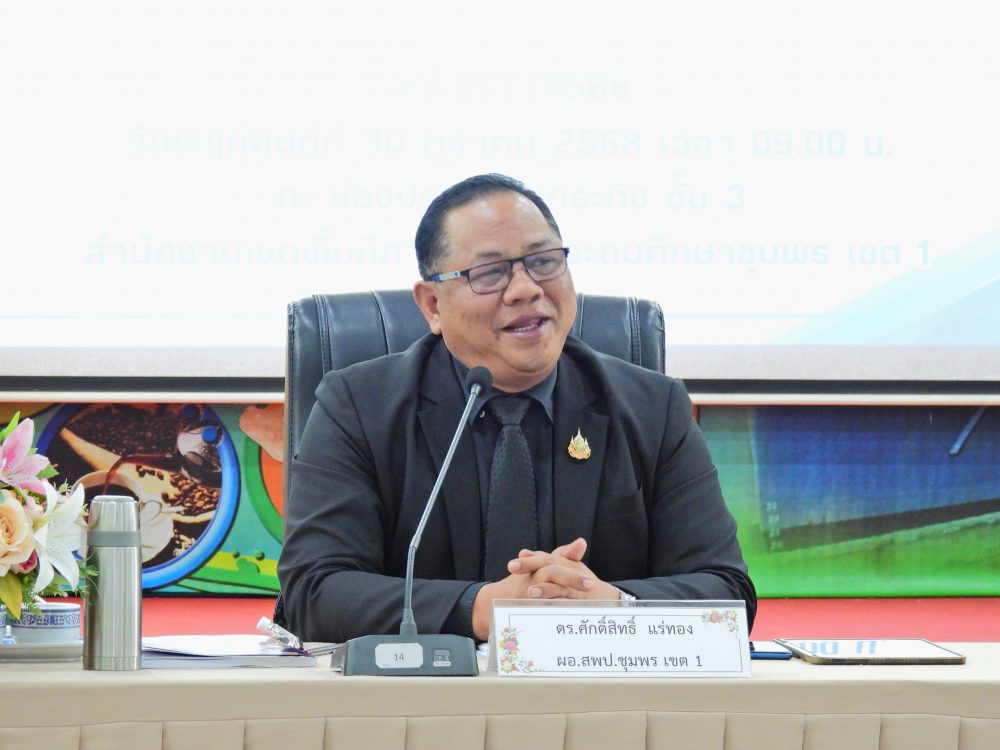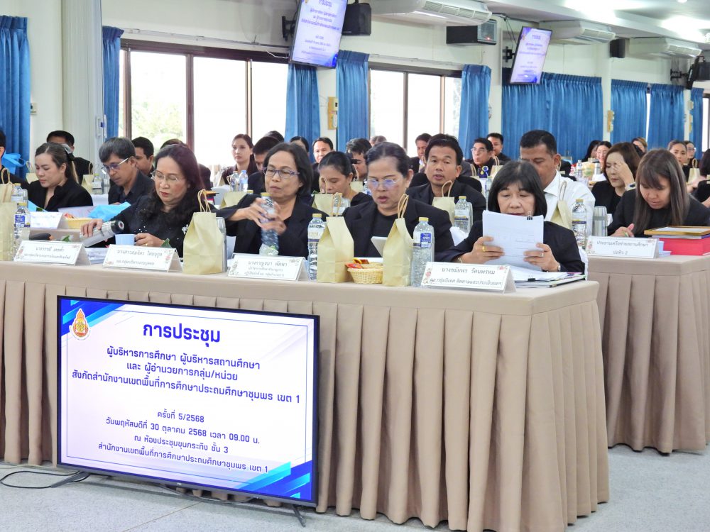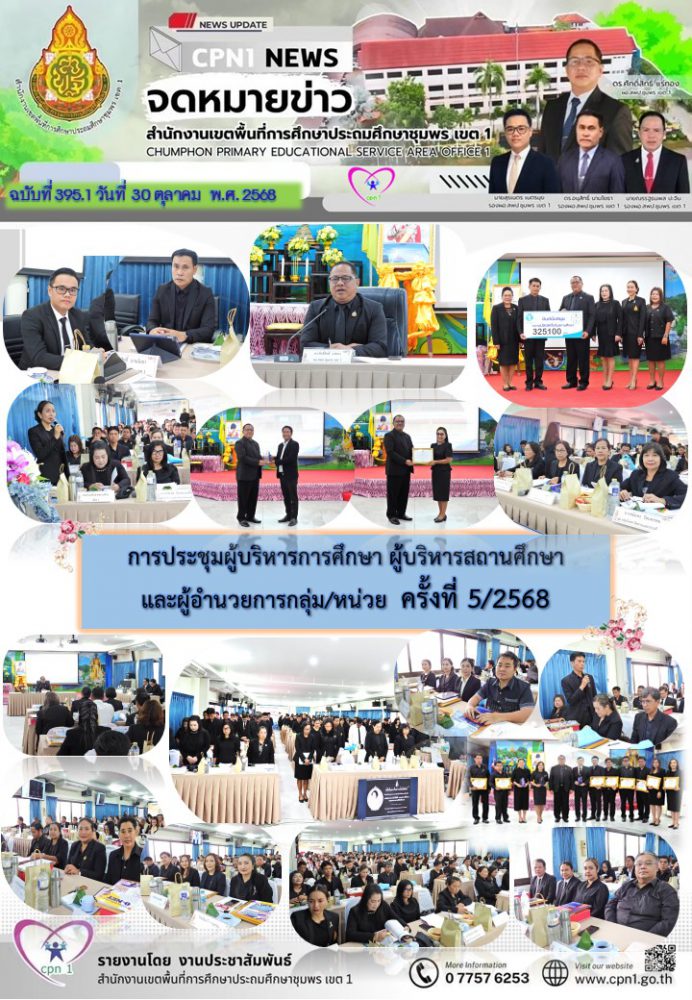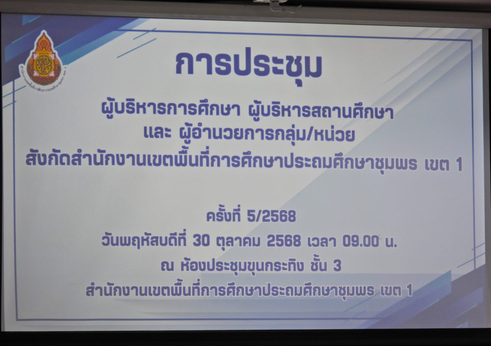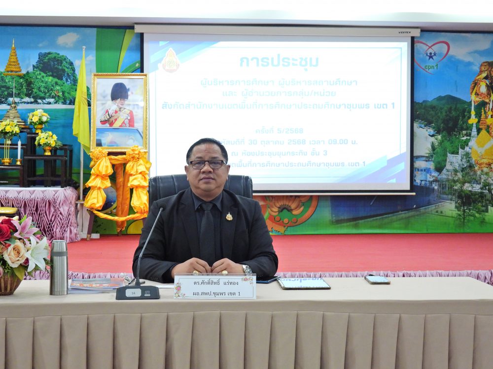 ..<<วันที่ 30 ตุลาคม 2568 เวลา 09.00 น. ดร.ศักดิ์สิทธิ์ แร่ทอง ผอ.สพป.ชุมพร เขต 1 เป็นประธานการประชุมผู้บริหารการศึกษา ผู้บริหารสถานศึกษา และผู้อำนวยการกลุ่ม/หน่วย ครั้งที่ 5/2568เพื่อแจ้งนโยบายของรัฐมนตรีว่าการกระทรวงศึกษาธิการ, ประเด็นท้าทายของ สพฐ. และ หลักการทำงานของเลขาธิการ กพฐ. (9 9 9) รวมถึงการเตรียมความพร้อมการเปิดภาคเรียนที่ 2/2568 และการดำเนินงานเพื่อความปลอดภัยของนักเรียน และก่อนเข้าสู่วาระการประชุม ได้มอบโล่ประกาศเกียรติคุณ และเกียรติบัตร ให้กับโรงเรียน ประกอบด้วย กลุ่มนิเทศติดตามและประเมินผลการจัดการศึกษา มอบโล่ประกาศเกียรติคุณ การประเมินคุณธรรม และความโปร่งใสในการดำเนินงานของสถานศึกษาออนไลน์ (Integrity and Transparency Assessment Online : ITA Online) ประจำปี พ.ศ.2568 ระดับดีเยี่ยม จำนวน 18 โรงเรียน และเกียรติบัตรรางวัลครูต้นแบบส่งเสริมการอ่านปี 2568 ระดับดีเยี่ยม จากสำนักงานคณะกรรมการการศึกษาขั้นพื้นฐาน จำนวน 4 โรงเรียน กลุ่มนโยบายและแผน มอบเกียรติบัตรให้สถานศึกษาที่มีผลงานการบริหารจัดการโรงเรียนขนาดเล็กที่มีวิธีปฏิบัติที่เป็นเลิศ (Best Practice) จากสำนักงานคณะกรรมการการศึกษาขั้นพื้นฐาน จำนวน 4 โรงเรียน กลุ่มส่งเสริมการศึกษาทางไกล เทคโนโลยีสารสนเทศและการสื่อสาร มอบเกียรติบัตรผลการคัดเลือกโรงเรียนต้นแบบที่มีวิธีปฏิบัติ ที่เป็นเลิศ (Best Practices) ในการจัดการศึกษาทางไกลผ่านดาวเทียม (DLTV) ระดับสำนักงานเขตพื้นที่การศึกษา จำนวน 3 โรงเรียน และ กลุ่มส่งเสริมการจัดการศึกษา มอบเกียรติบัตร ผลงานที่สามารถเป็นแบบอย่างได้ในด้านการน้อมนำพระบรมราโชบายด้านการศึกษาในหลวงรัชกาลที่ 10 และหลักปรัชญาของเศรษฐกิจพอเพียง ระดับคุณภาพดีเยี่ยม ต้นแบบระดับสำนักงานเขตพื้นที่การศึกษา จำนวน 10 โรงเรียน และเกียรติบัตร การคัดเลือกเด็กและเยาวชนดีเด่น ประจำปี 2569 สังกัดสำนักงานเขตพื้นที่การศึกษาประถมศึกษา จังหวัดชุมพร จำนวน 1 คน หลังจากนั้น ได้ดำเนินการตามระเบียบวาระการประชุมตามลำดับ โดยมีรอง ผอ.สพป.ชุมพร เขต 1 ผู้อำนวยการกลุ่ม/หน่วย ร่วมชี้แจงภารกิจและการดำเนินงานเรื่องต่างๆของกลุ่มงานใน สพป.ชพ.1 ให้ที่ประชุมได้รับทราบในการประชุมครั้งนี้ ณ ห้องประชุมขุนกระทิง ชั้น 3 สำนักงานเขตพื้นที่การศึกษาประถมศึกษาชุมพร เขต 1 >>.