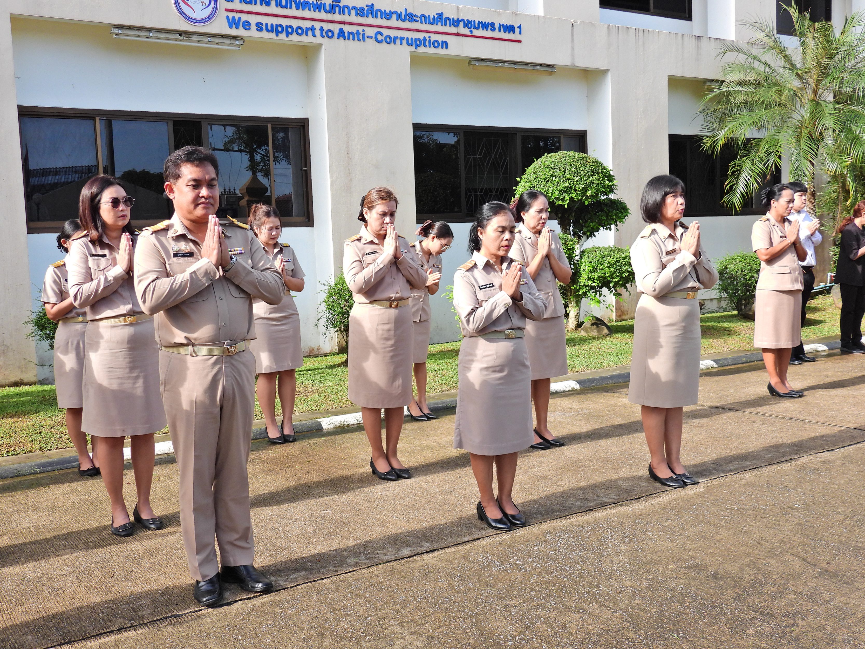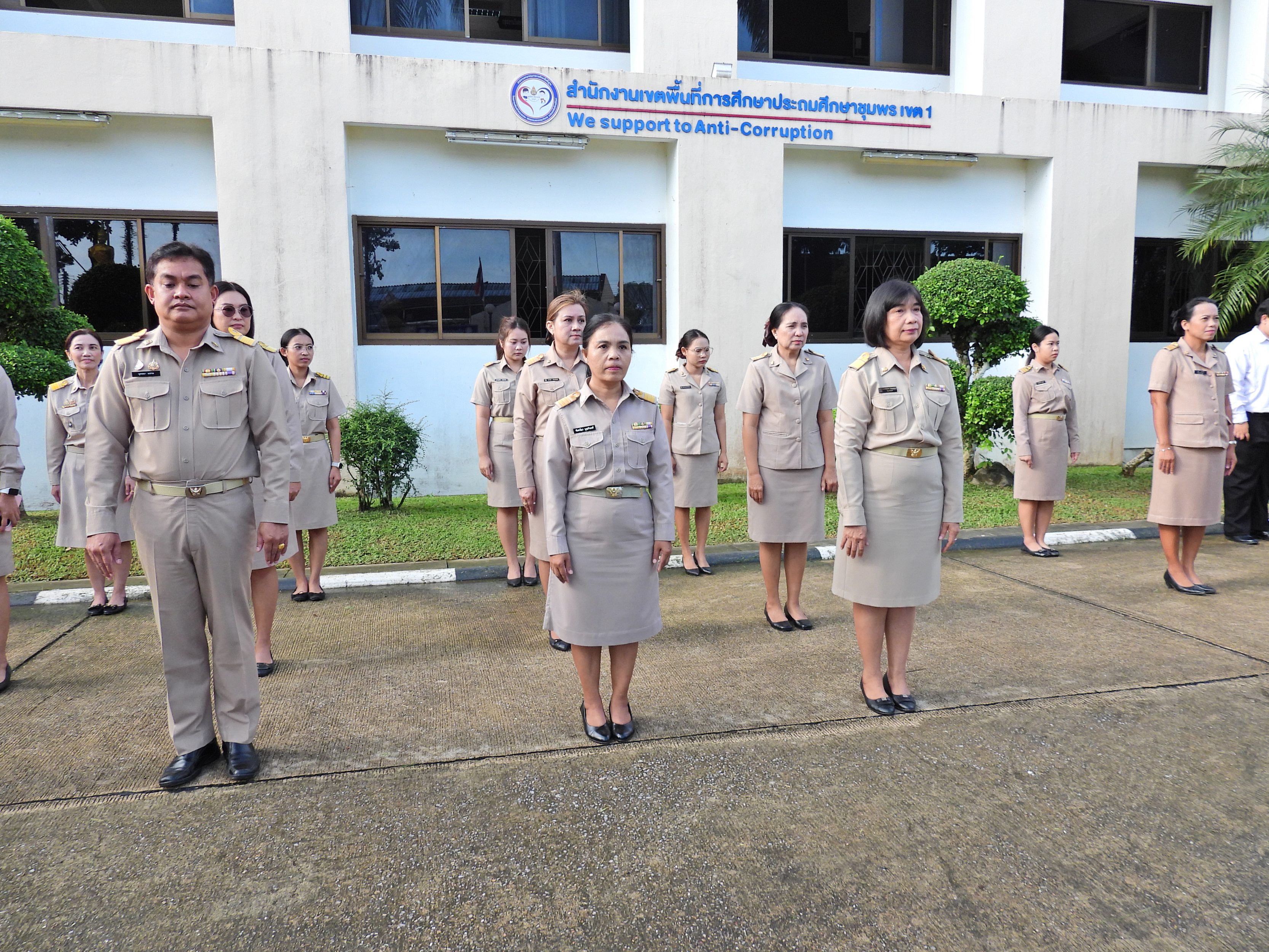 วันจันทร์ที่ 3 พฤศจิกายน 2568 เวลา 08.30 น. ดร.ศักดิ์สิทธิ์ แร่ทอง ผู้อำนวยการสำนักงานเขตพื้นที่การศึกษาประถมศึกษาชุมพร เขต 1 มอบหมายให้ ผู้อำนวยการกลุ่ม/หน่วย บุคลากรใน สำนักงานเขตพื้นที่การศึกษาประถมศึกษาชุมพร เขต 1 ร่วมกิจกรรมเข้าแถวเคารพธงชาติ บูชาพระรัตนตรัย และกล่าวคำปฏิญญาเขตสุจริต เพื่อให้ทุกคนตระหนักและเล็งเห็นถึงความสําคัญของสถาบันชาติ ศาสนา พระมหากษัตริย์สร้างความรัก ความสามัคคีในหน่วยงาน สร้างวินัย รู้หน้าที่ความรับผิดชอบ ปฏิบัติดี ปฏิบัติชอบ ภายใต้คุณธรรมนำความรู้ เพื่อสร้างและรักษาเอกลักษณ์ขององค์กร แสดงออกเชิงสัญลักษณ์ในการขับเคลื่อนโครงการเสริมสร้างคุณธรรม จริยธรรม และธรรมาภิบาล ในเขตพื้นที่การศึกษา"ป้องกันการทุจริต" (เขตสุจริต) ณ บริเวณหน้าอาคารสำนักงานเขตพื้นที่การศึกษาประถมศึกษาชุมพร เขต 1