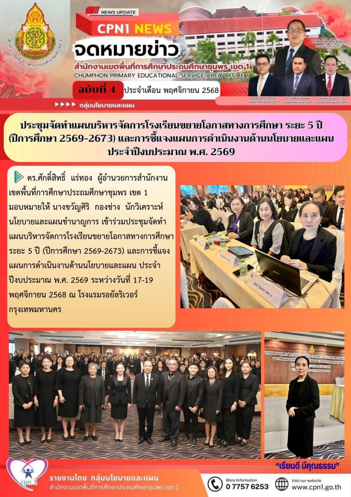 ดร.ศักดิ์สิทธิ์ แร่ทอง ผู้อำนวยการสำนักงานเขตพื้นที่การศึกษาประถมศึกษาชุมพร เขต 1มอบหมายให้ นางขวัญศิริ กองช่าง นักวิเคราะห์นโยบายและแผนชำนาญการ เข้าร่วมประชุมจัดทำแผนบริหารจัดการโรงเรียนขยายโอกาสทางการศึกษา ระยะ 5 ปี (ปีการศึกษา 2569-2673) และการชี้แจงแผนการดำเนินงานด้านนโยบายและแผน ประจำปีงบประมาณ พ.ศ. 2569 ระหว่างวันที่ 17-19 พฤศจิกายน 2568 ณ โรงแรมรอยัลริเวอร์ กรุงเทพมหานคร
