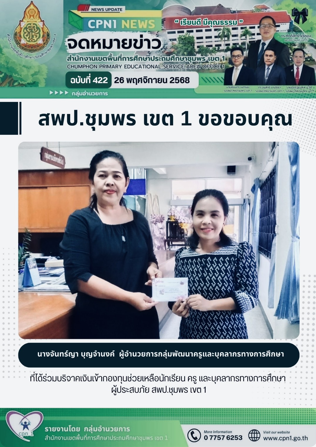 สพป.ชุมพร เขต 1 ขอขอบคุณบุคลากรในสังกัด 26 พฤศจิกายน 2568 กลุ่มอำนวยการ สพป.ชพ.1 การเสริมสร้างวัฒนธรรมองค์กร, ข่าวและกิจกรรม สพป.ชพ.1, ข่าวและกิจกรรมกลุ่มอำนวยการ, มาตรการเผยแพร่ข้อมูลต่อสาธารณะ สพป.ชุมพร เขต 1 ขอขอบคุณบุคลากรในสังกัด นางจันทร์ญา บุญจำนงค์ ผู้อำนวยการกลุ่มพัฒนาครูและบุคลากรทางการศึกษา ที่ได้ร่วมบริจาคเงินเข้ากองทุนช่วยเหลือนักเรียน ครู และบุคลากรทางการศึกษา ผู้ประสบภัย สพป.ชุมพร เขต 1 FacebookFacebookXXLINELine กลุ่มอำนวยการ สพป.ชพ.1