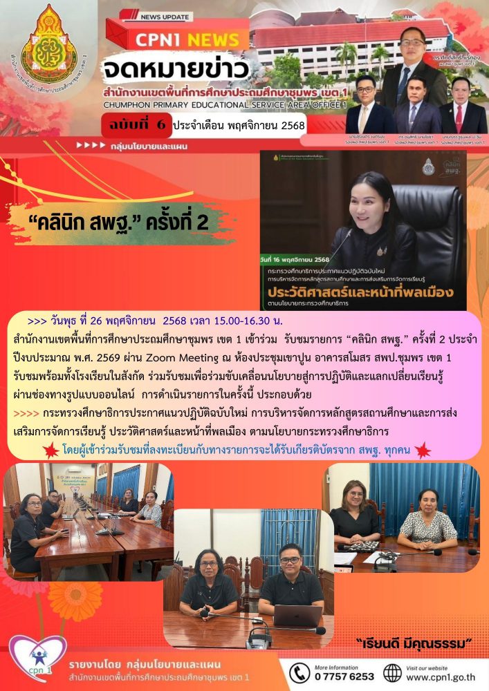 สำนักงานเขตพื้นที่การศึกษาประถมศึกษาชุมพร เขต 1 เข้าร่วม รับชมรายการ "คลินิก สพฐ." ครั้งที่ 2 ประจำปีงบประมาณ พ.ศ. 2569 ผ่าน Zoom Meeting ณ ห้องประชุมบางผรา อาคารสโมสร สพป.ชุมพร เขต 1 รับชมพร้อมทั้งโรงเรียนในสังกัด ร่วมรับชมเพื่อร่วมขับเคลื่อนนโยบายสู่่การปฏิบัติและแลกเปลี่ยนเรียนรู้ ผ่านช่องทางรูปแบบออนไลน์ การดำเนินรายการในครั้งนี้ ประกอบด้วย