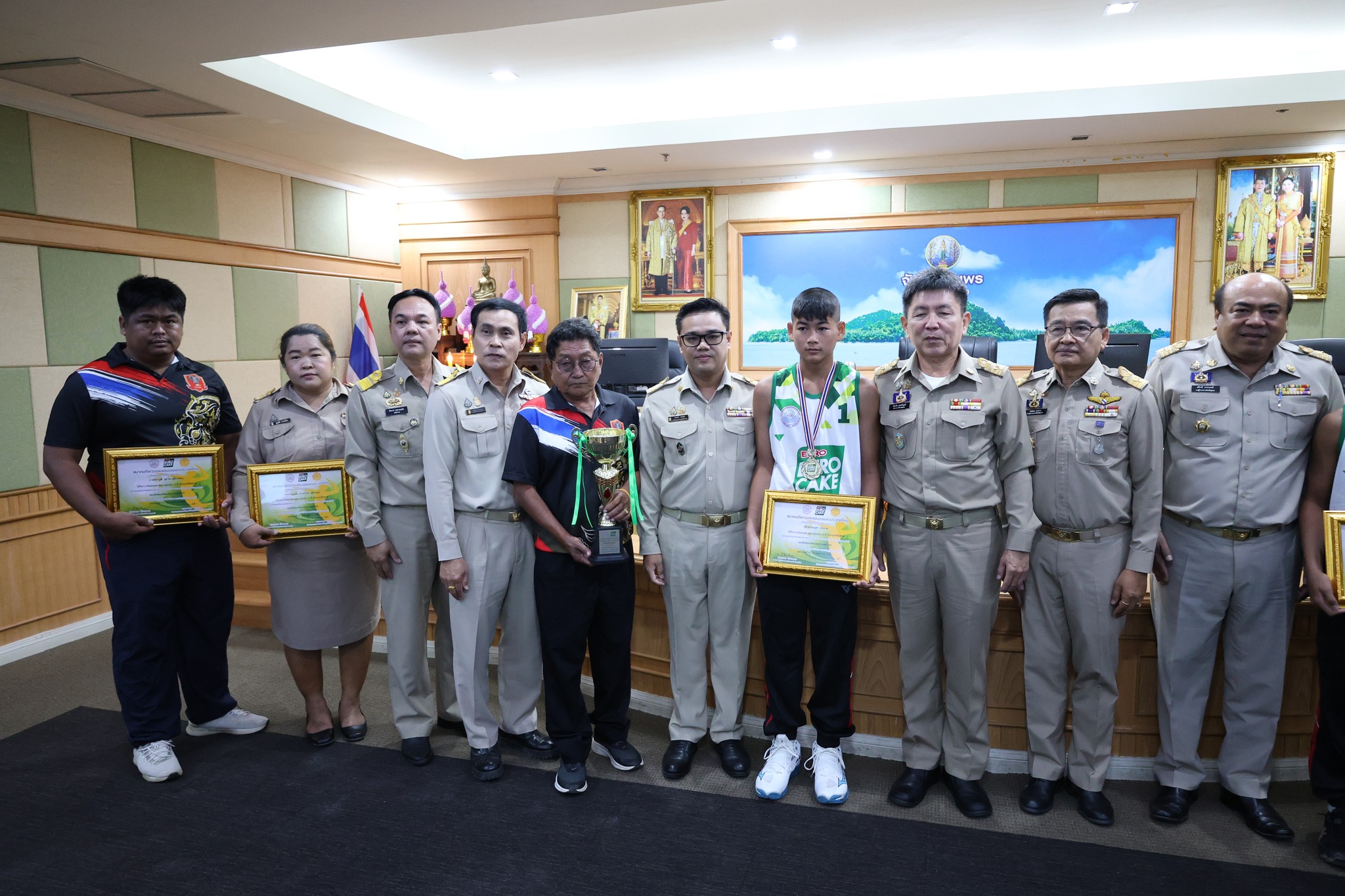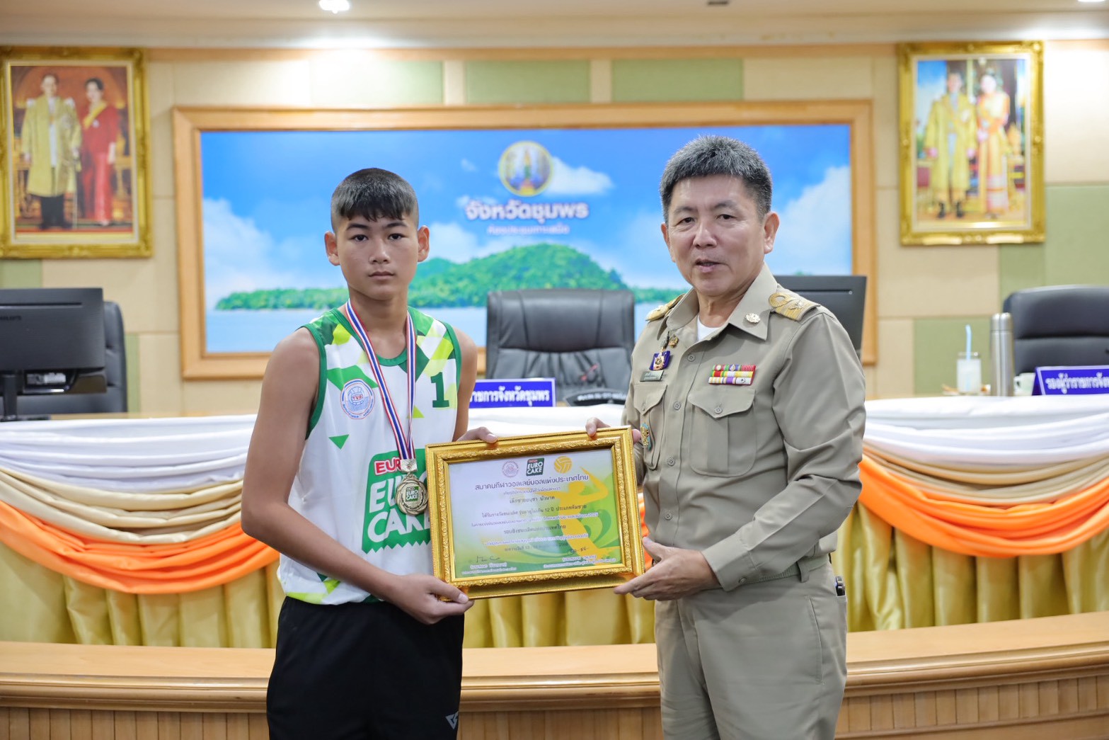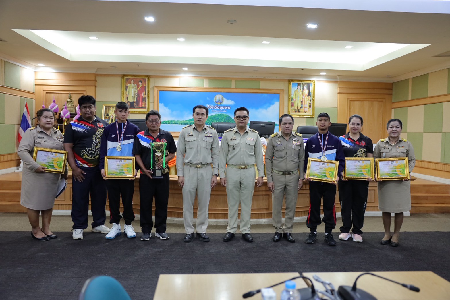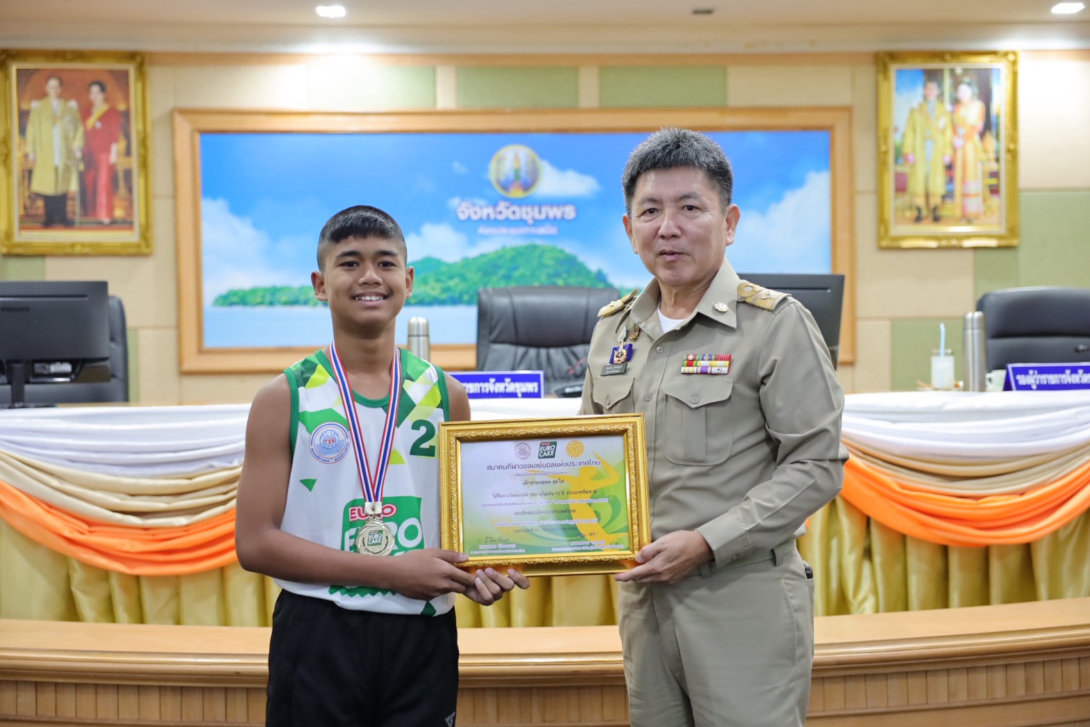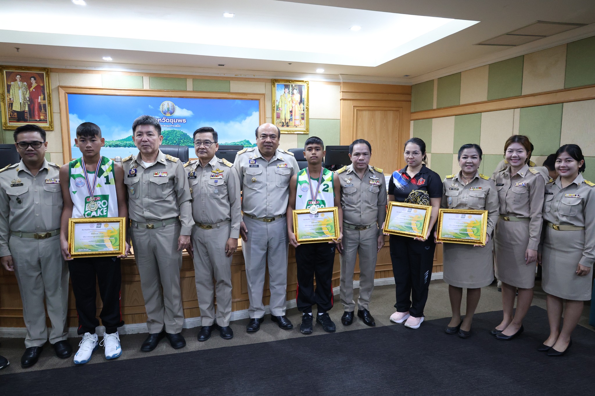 >>> วันที่ 27 พฤศจิกายน 2568 เวลา 10.00 น. ดร.ศักดิ์สิทธิ์ แร่ทอง ผู้อำนวยการสำนักงานเขตพื้นที่การศึกษาประถมศึกษาชุมพร เขต 1 มอบหมายให้ นายสุรเนตร เนตรมุข ดร.อนุสิทธิ์ นามโยธา และ นายณรรฐธนพล ปะจีน รองผู้อำนวยการสำนักงานเขตพื้นที่การศึกษาประถมศึกษาชุมพร เขต 1 ร่วมแสดงความยินดีกับโรงเรียนบ้านงาช้าง ที่ได้รับรางวัลชนะเลิศ การแข่งขัน"ยูโร่เค้ก" ไทยแลนด์ บีช วอลเลย์บอล 2025 รุ่นอายุ ไม่เกิน 12 ปี ประเภททีมชาย รอบชิงชนะเลิศแห่งประเทศไทย ณ ห้องประชุมเกาะเสม็ด ชั้น 4 ศาลากลางจังหวัดชุมพร อำเภอเมืองชุมพร จังหวัดชุมพร โดยมี นายเธียรชัย ชูกิตติวิบูลย์ ผู้ว่าราชการจังหวัดชุมพร ให้เกียรติมอบถ้วยรางวัลชนะเลิศจากสมาคมกีฬาวอลเลย์บอลแห่งประเทศไทย พร้อมเหรียญรางวัลชนะเลิศและเกียรติบัตร ให้กับคณะนักกีฬา ก่อนการประชุมคณะกรมการจังหวัด หัวหน้าส่วนราชการ หัวหน้าหน่วยงานรัฐวิสาหกิจ นายอำเภอ ผู้บริหารท้องถิ่น และภาคเอกชน ซึ่งถือเป็นการประกาศเกียรติคุณที่โรงเรียนบ้านงาช้างได้สร้างชื่อเสียงให้แก่จังหวัดชุมพรในระดับประเทศ >>>