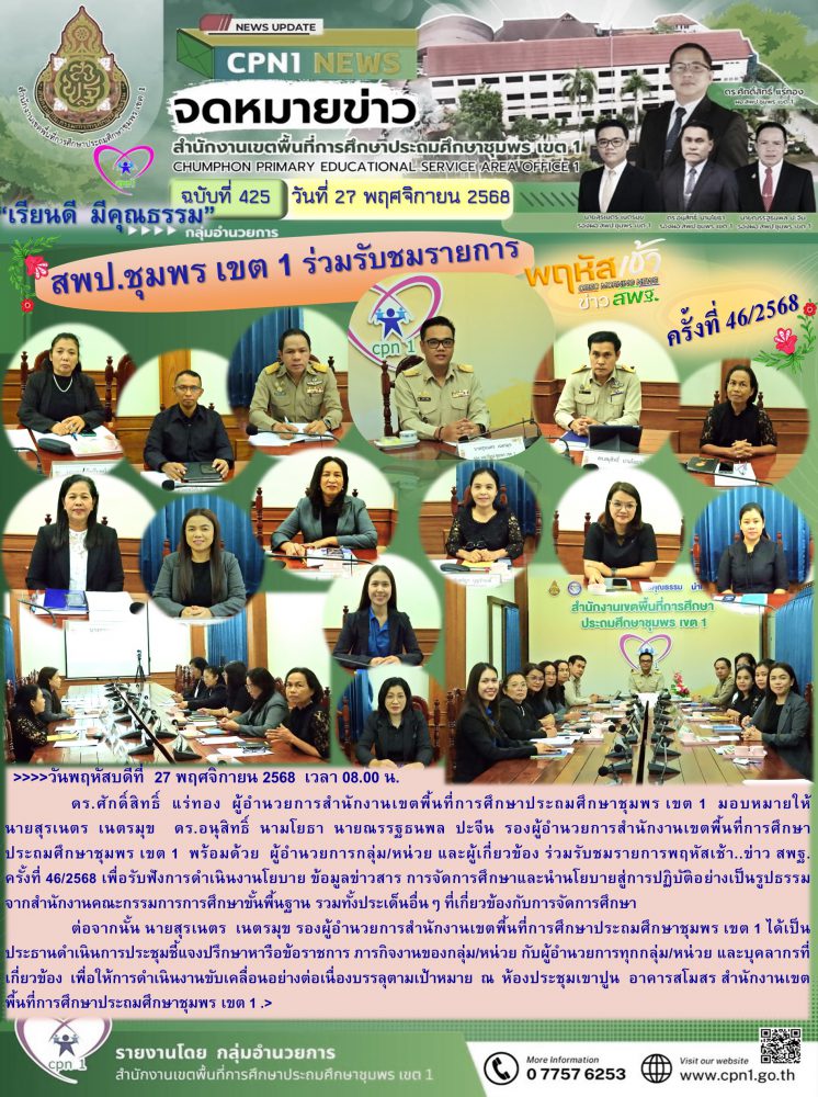 ดร.ศักดิ์สิทธิ์ แร่ทอง ผู้อำนวยการสำนักงานเขตพื้นที่การศึกษาประถมศึกษาชุมพร เขต 1 มอบหมายให้ นายสุรเนตร เนตรมุข ดร.อนุสิทธิ์ นามโยธา นายณรรฐธนพล ปะจีน รองผู้อำนวยการสำนักงานเขตพื้นที่การศึกษาประถมศึกษาชุมพร เขต 1 พร้อมด้วย ผู้อำนวยการกลุ่ม/หน่วย และผู้เกี่ยวข้อง ร่วมรับชมรายการพฤหัสเช้า..ข่าว สพฐ. ครั้งที่ 46/2568 เพื่อรับฟังการดำเนินงานโยบาย ข้อมูลข่าวสาร การจัดการศึกษาและนำนโยบายสู่การปฏิบัติอย่างเป็นรูปธรรม จากสำนักงานคณะกรรมการการศึกษาขั้นพื้นฐาน รวมทั้งประเด็นอื่นๆ ที่เกี่ยวข้องกับการจัดการศึกษา