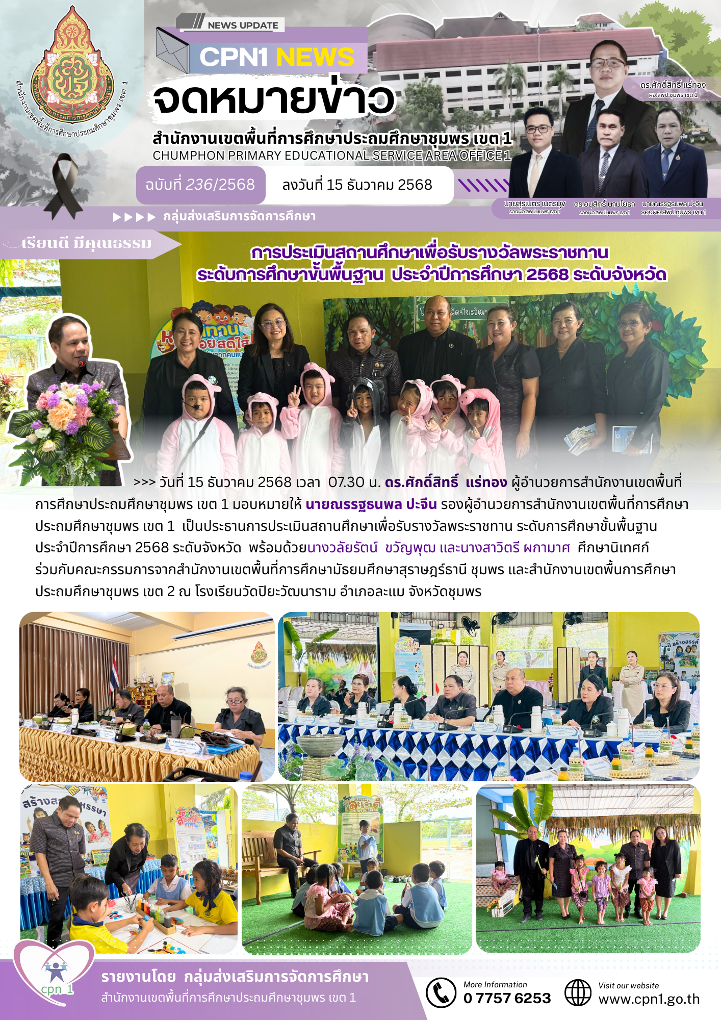 >>> วันที่ 15 ธันวาคม 2568 เวลา 07.30 น. ดร.ศักดิ์สิทธิ์ แร่ทอง ผู้อำนวยการสำนักงานเขตพื้นที่การศึกษาประถมศึกษาชุมพร เขต 1 มอบหมายให้ นายณรรฐธนพล ปะจีน รองผู้อำนวยการสำนักงานเขตพื้นที่การศึกษาประถมศึกษาชุมพร เขต 1 เป็นประธานการประเมินสถานศึกษาเพื่อรับรางวัลพระราชทาน ระดับการศึกษาขั้นพื้นฐานประจำปีการศึกษา 2568 ระดับจังหวัด พร้อมด้วยนางวลัยรัตน์ ขวัญพุฒ และนางสาวิตรี ผกามาศ ศึกษานิเทศก์ ร่วมกับคณะกรรมการจากสำนักงานเขตพื้นที่การศึกษามัธยมศึกษาสุราษฎร์ธานี ชุมพร และสำนักงานเขตพื้นการศึกษาประถมศึกษาชุมพร เขต 2 ณ โรงเรียนวัดปิยะวัฒนาราม อำเภอละแม จังหวัดชุมพร
