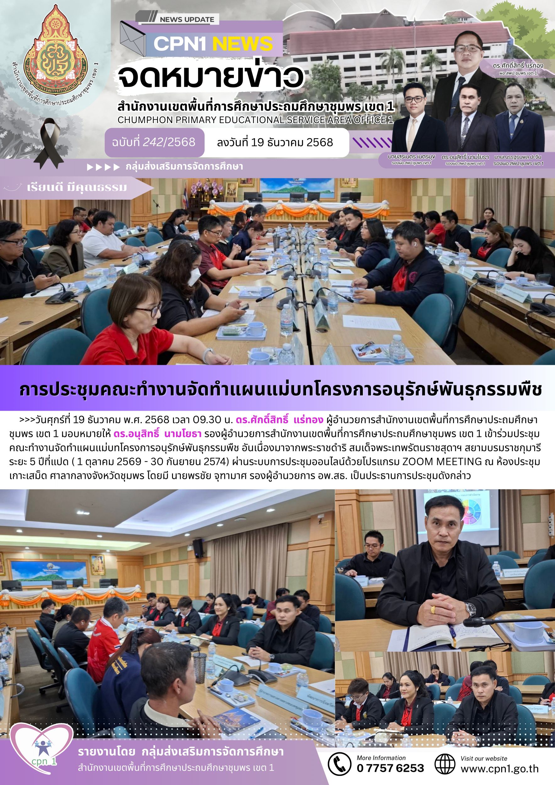 >>>วันศุกร์ที่ 19 ธันวาคม พ.ศ. 2568 เวลา 09.30 น. ดร.ศักดิ์สิทธิ์ แร่ทอง ผู้อำนวยการสำนักงานเขตพื้นที่การศึกษาประถมศึกษาชุมพร เขต 1 มอบหมายให้ ดร.อนุสิทธิ์ นามโยธา รองผู้อำนวยการสำนักงานเขตพื้นที่การศึกษาประถมศึกษาชุมพร เขต 1 เข้าร่วมประชุมคณะทำงานจัดทำแผนแม่บทโครงการอนุรักษ์พันธุกรรมพืช อันเนื่องมาจากพระราชดำริ สมเด็จพระเทพรัตนราชสุดาฯ สยามบรมราชกุมารี ระยะ 5 ปีที่แปด ( 1 ตุลาคม 2569 – 30 กันยายน 2574) ผ่านระบบการประชุมออนไลน์ด้วยโปรแกรม Zoom Meeting ณ ห้องประชุมเกาะเสม็ด ศาลากลางจังหวัดชุมพร โดยมี นายพรชัย จุฑามาศ รองผู้อำนวยการ อพ.สธ. เป็นประธานการประชุมดังกล่าว
