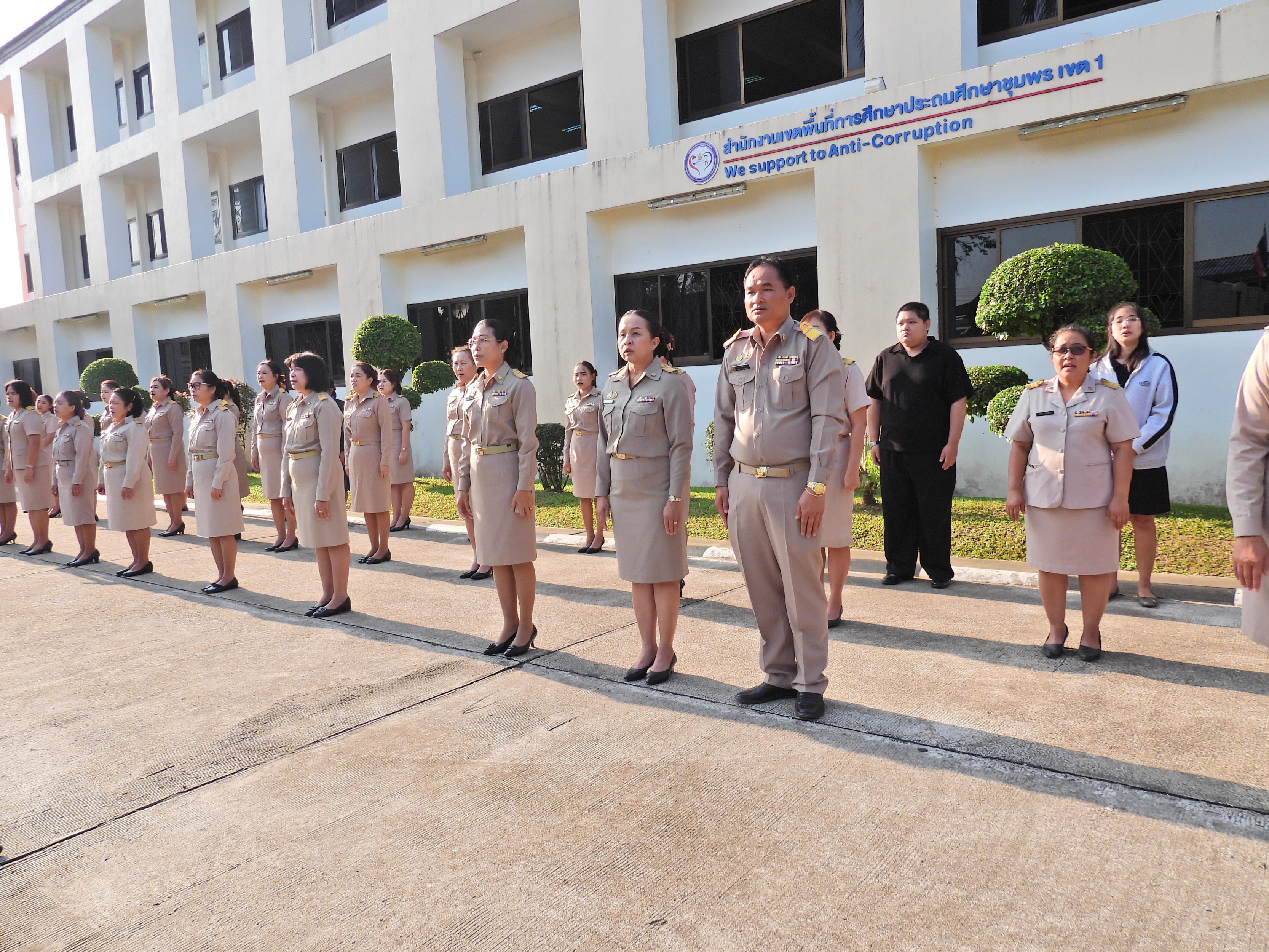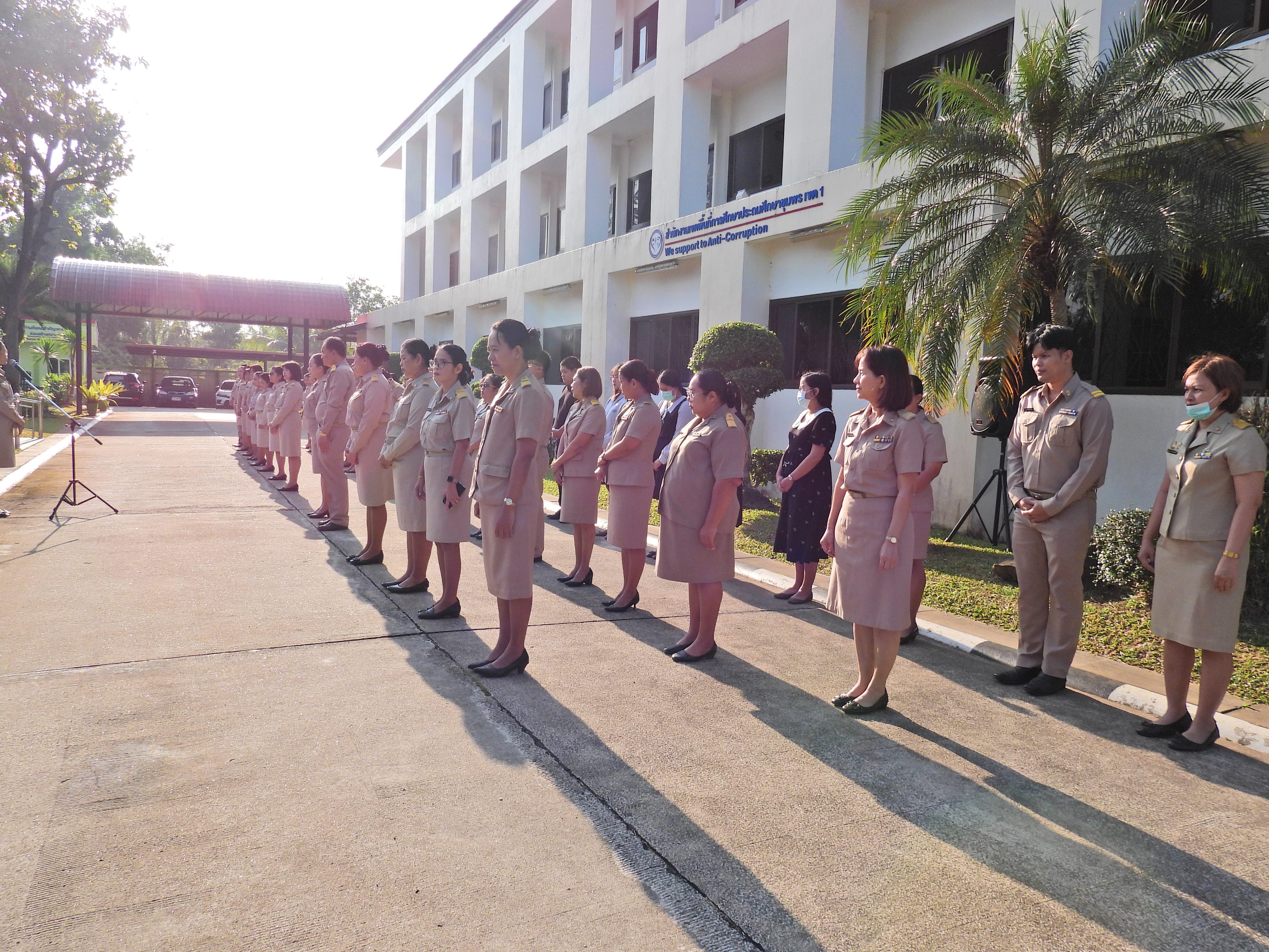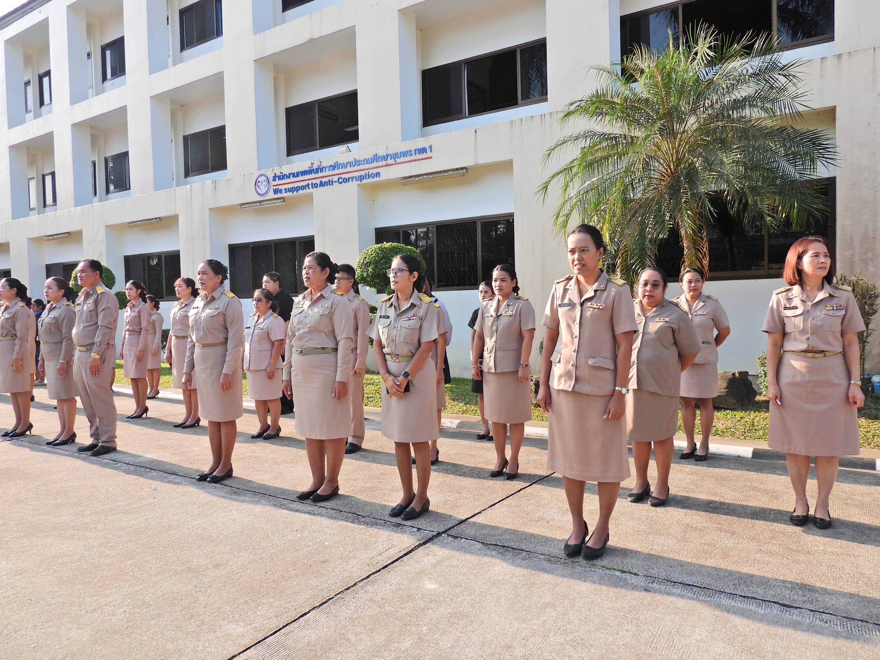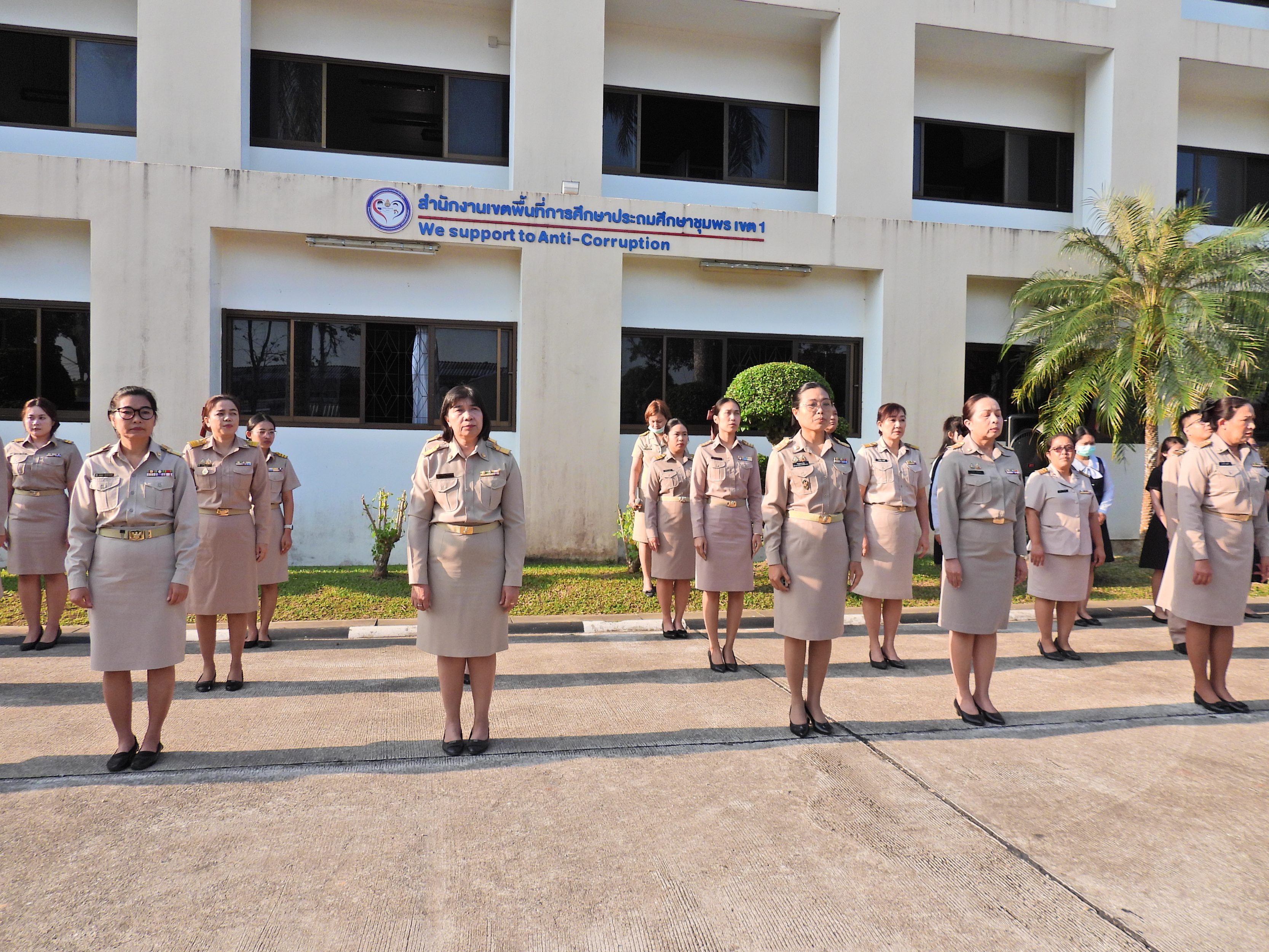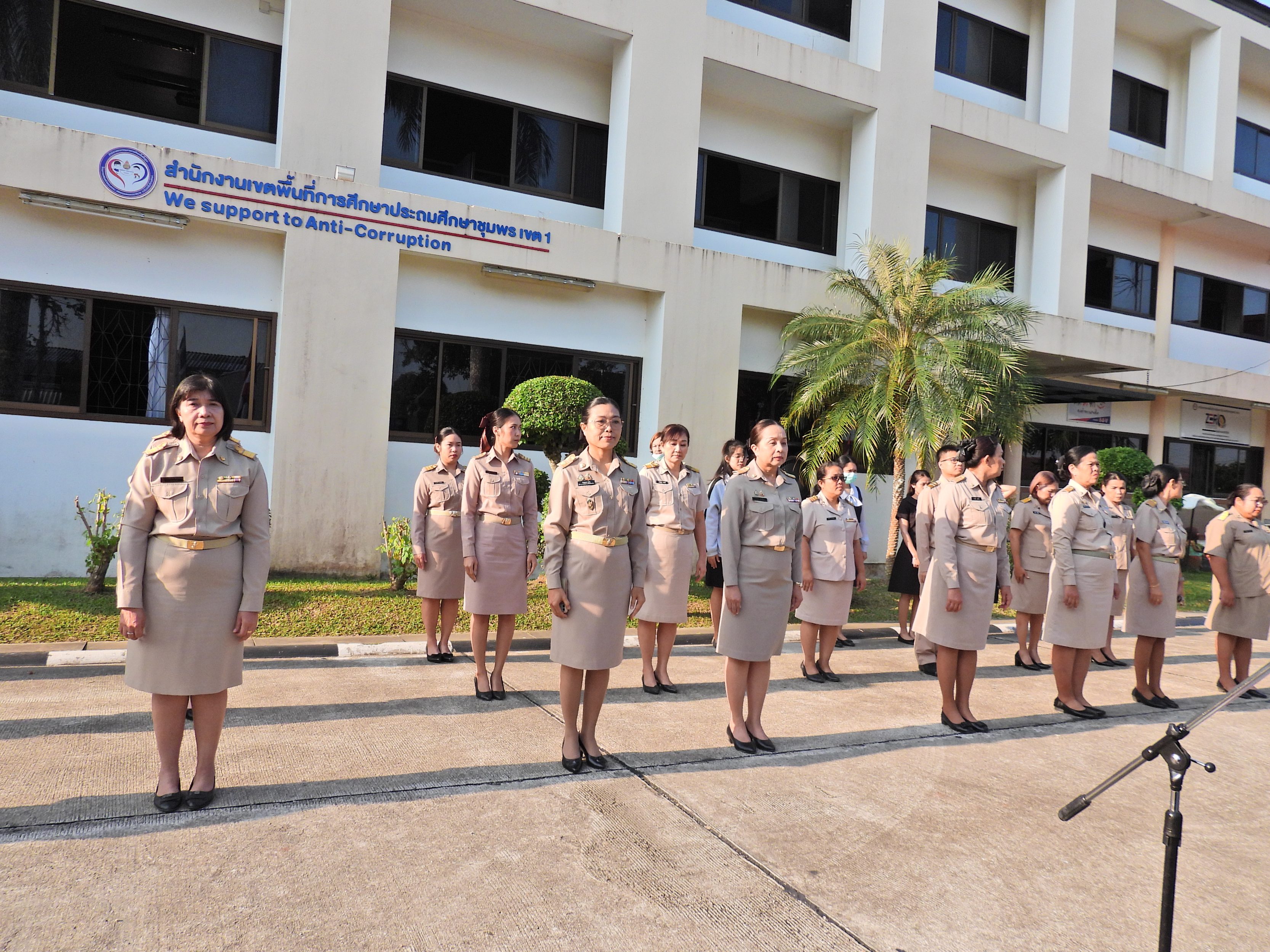วันจันทร์ที่ 12 มกราคม 2569 เวลา 08.30 น. ดร.กันยมาส ชูจีน ผู้อำนวยการสำนักงานเขตพื้นที่การศึกษาประถมศึกษาชุมพร เขต 1 พร้อมด้วย นายมานิส สลางสิงห์ ดร.กฤติกา อินใหม่ รอง ผอ.สพป.ชุมพร เขต 1 ผู้อำนวยการกลุ่ม/หน่วย และบุคลากรใน สพป.ชุมพร เขต 1 ร่วมกิจกรรมเข้าแถวเคารพธงชาติ บูชาพระรัตนตรัย และกล่าวคำปฏิญญาเขตสุจริต เพื่อให้ทุกคนได้ตระหนักและเห็นคุณค่า ของชาติ สร้างความรัก สามัคคีให้เกิดในหน่วยงาน สร้างวินัย รู้หน้าที่ ความรับผิดชอบ ปฏิบัติดีปฏิบัติชอบ ภายใต้คุณธรรม นำความรู้ เพื่อสร้างและรักษาเอกลักษณ์ขององค์กร แสดงออกเชิงสัญลักษณ์ในการขับเคลื่อนโครงการเสริมสร้างคุณธรรม จริยธรรม และธรรมาภิบาลในเขตพื้นที่การศึกษา "ป้องกันการทุจริต" (เขตสุจริต)