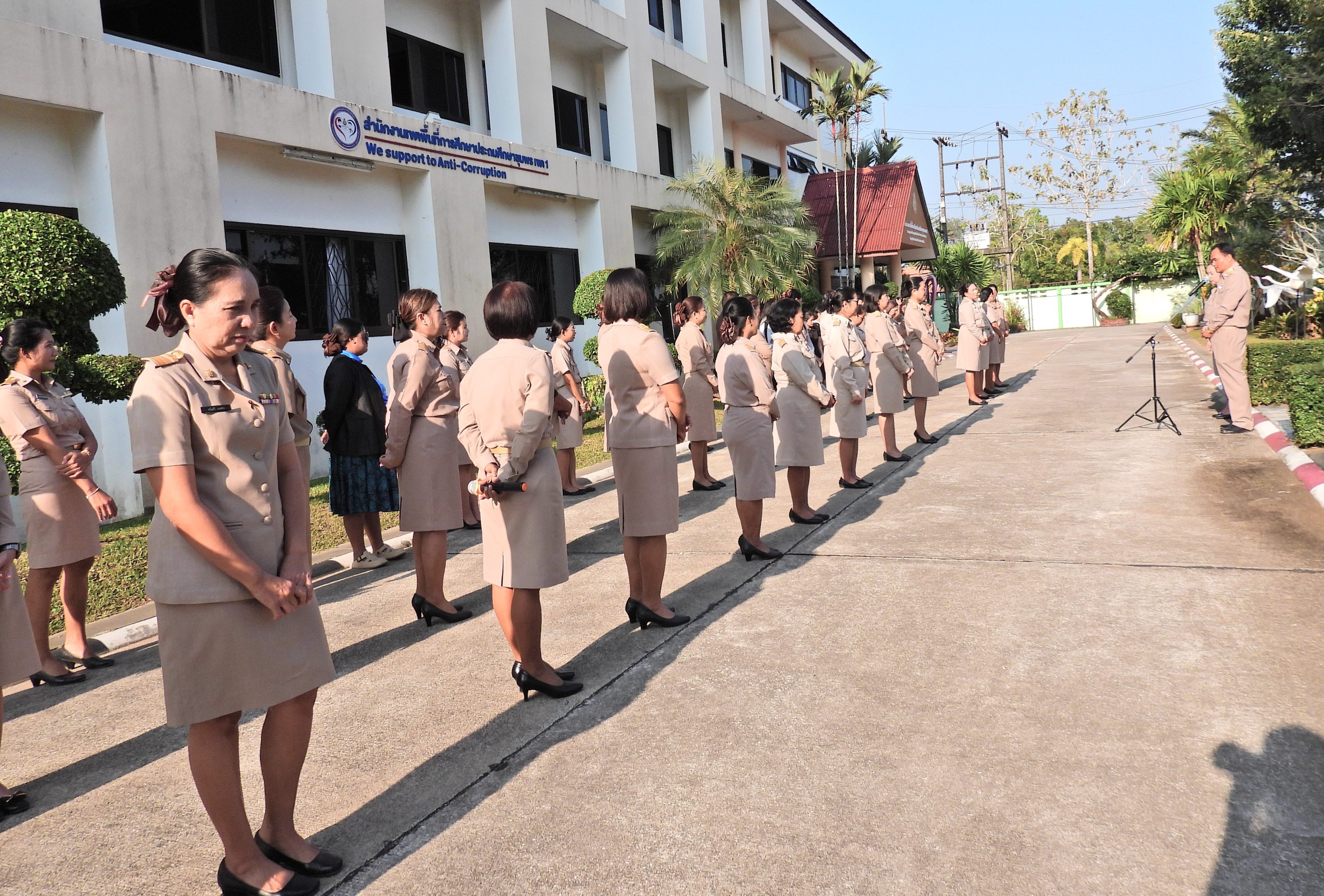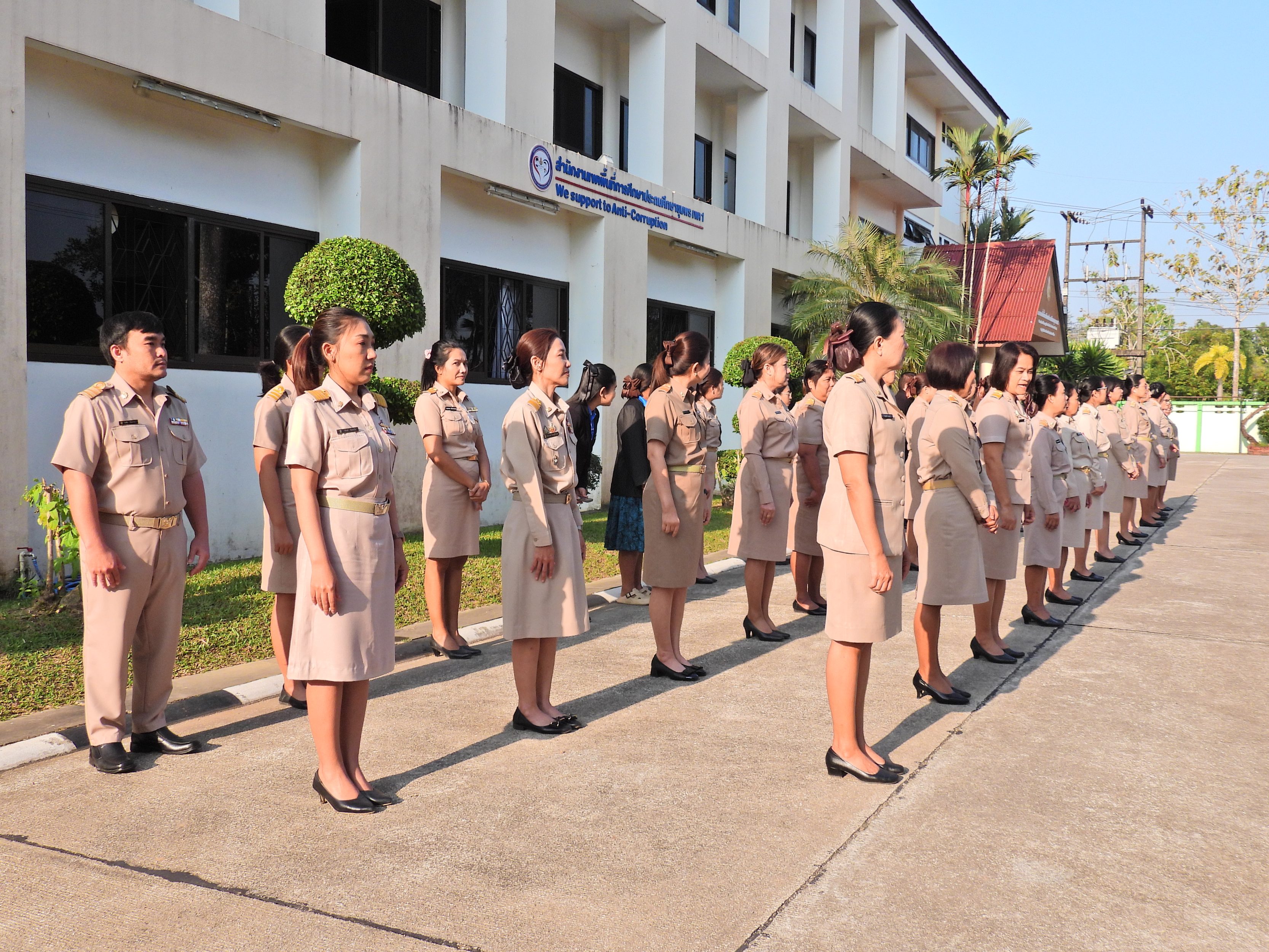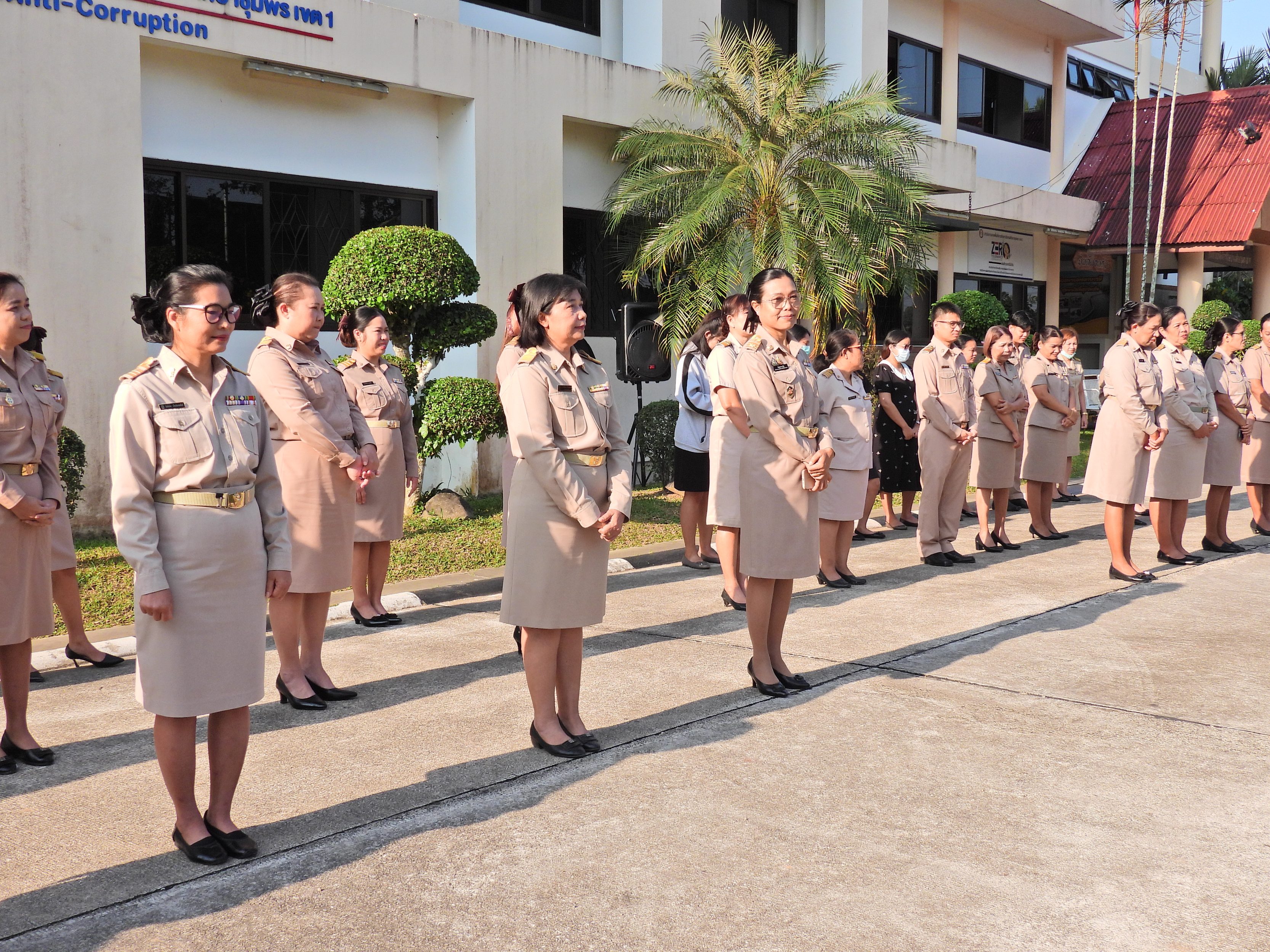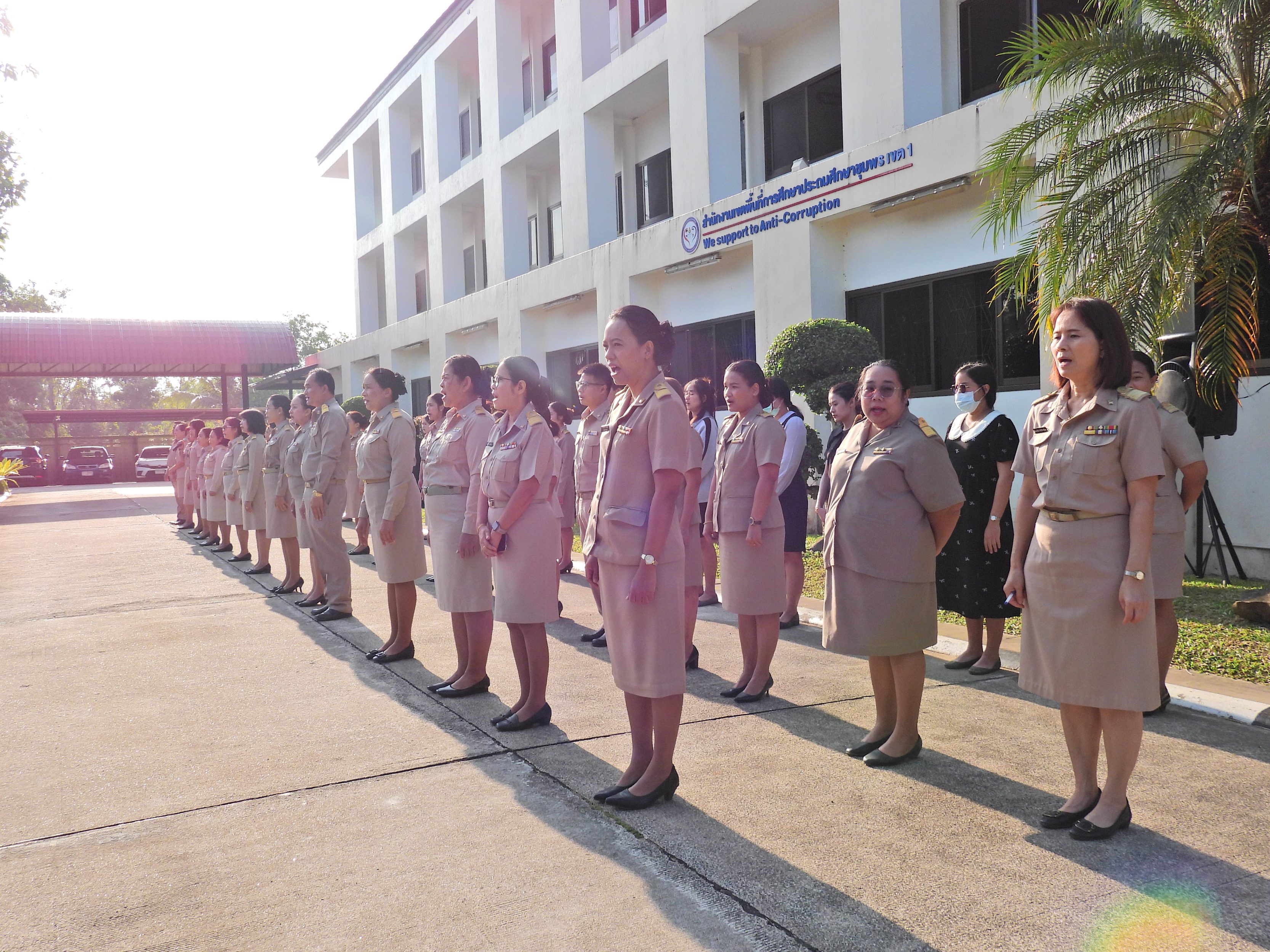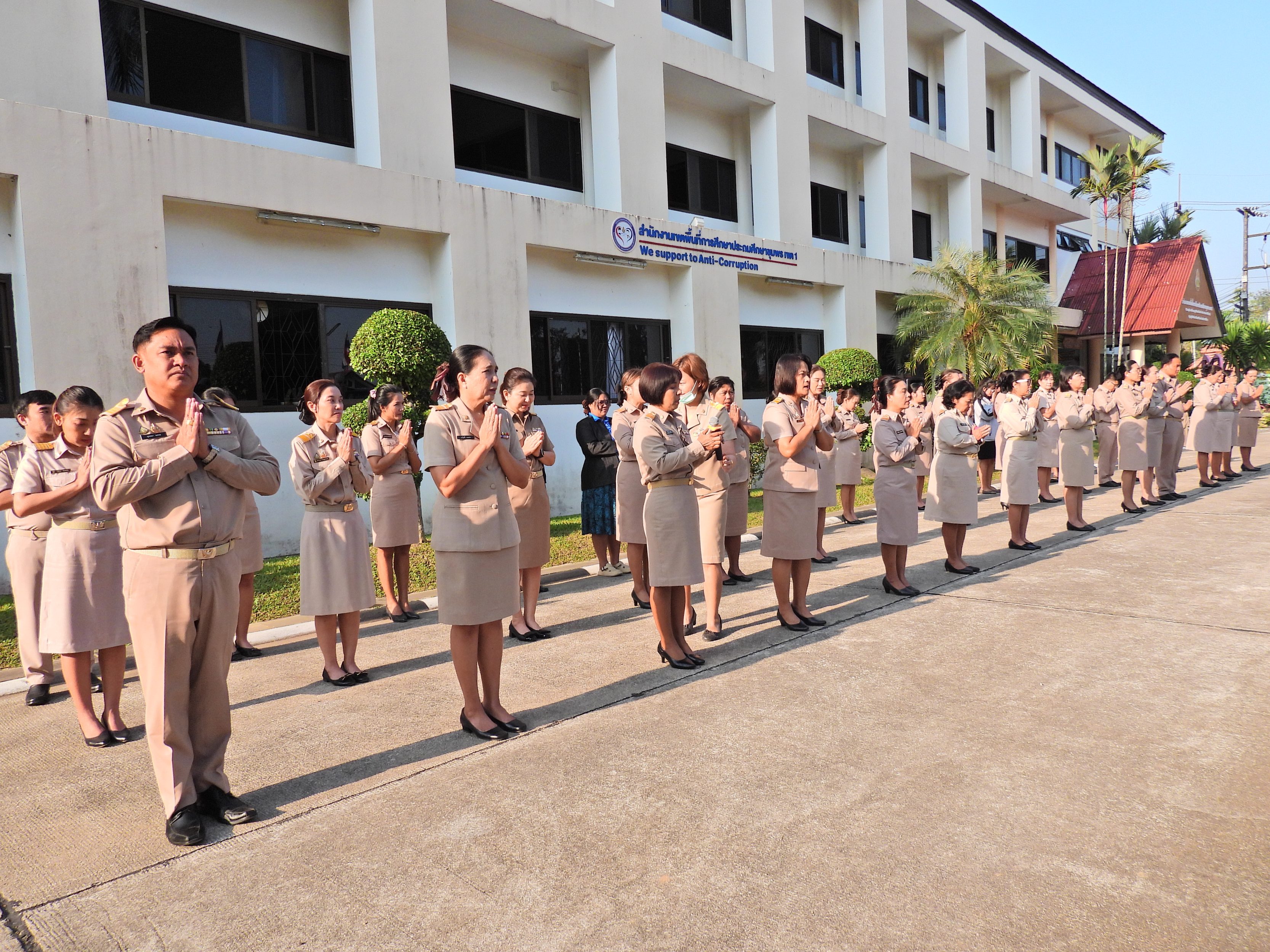 วันจันทร์ที่ 12 มกราคม 2569 เวลา 08.30 น. ดร.กันยมาส ชูจีน ผู้อำนวยการสำนักงานเขตพื้นที่การศึกษาประถมศึกษาชุมพร เขต 1 พร้อมด้วย นายมานิส สลางสิงห์ ดร.กฤติกา อินใหม่ รอง ผอ.สพป.ชุมพร เขต 1 ผู้อำนวยการกลุ่ม/หน่วย และบุคลากรใน สพป.ชุมพร เขต 1 ร่วมกิจกรรมเข้าแถวเคารพธงชาติ บูชาพระรัตนตรัย และกล่าวคำปฏิญญาเขตสุจริต เพื่อให้ทุกคนได้ตระหนักและเห็นคุณค่า ของชาติ สร้างความรัก สามัคคีให้เกิดในหน่วยงาน สร้างวินัย รู้หน้าที่ ความรับผิดชอบ ปฏิบัติดีปฏิบัติชอบ ภายใต้คุณธรรม นำความรู้ เพื่อสร้างและรักษาเอกลักษณ์ขององค์กร แสดงออกเชิงสัญลักษณ์ในการขับเคลื่อนโครงการเสริมสร้างคุณธรรม จริยธรรม และธรรมาภิบาลในเขตพื้นที่การศึกษา "ป้องกันการทุจริต" (เขตสุจริต)