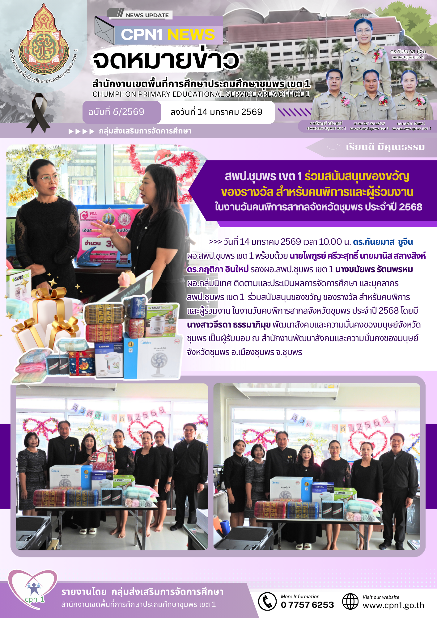 >>> วันที่ 14 มกราคม 2569 เวลา 10.00 น. ดร.กันยมาส ชูจีน ผอ.สพป.ชุมพร เขต 1 พร้อมด้วย นายไพฑูรย์ ศรีวะสุทธิ์ นายมานิส สลางสิงห์ ดร.กฤติกา อินใหม่ รองผอ.สพป.ชุมพร เขต 1 นางชมัยพร รัตนพรหม ผอ.กลุ่มนิเทศ ติดตามและประเมินผลการจัดการศึกษา และบุคลากรสพป.ชุมพร เขต 1 ร่วมสนับสนุนของขวัญ ของรางวัล สำหรับคนพิการและผู้ร่วมงาน ในงานวันคนพิการสากลจังหวัดชุมพร ประจำปี 2568 โดยมี นางสาวจีรดา ธรรมาภิมุข พัฒนาสังคมและความมั่นคงของมนุษย์จังหวัดชุมพร เป็นผู้รับมอบ ณ สำนักงานพัฒนาสังคมและความมั่นคงของมนุษย์จังหวัดชุมพร อ.เมืองชุมพร จ.ชุมพร