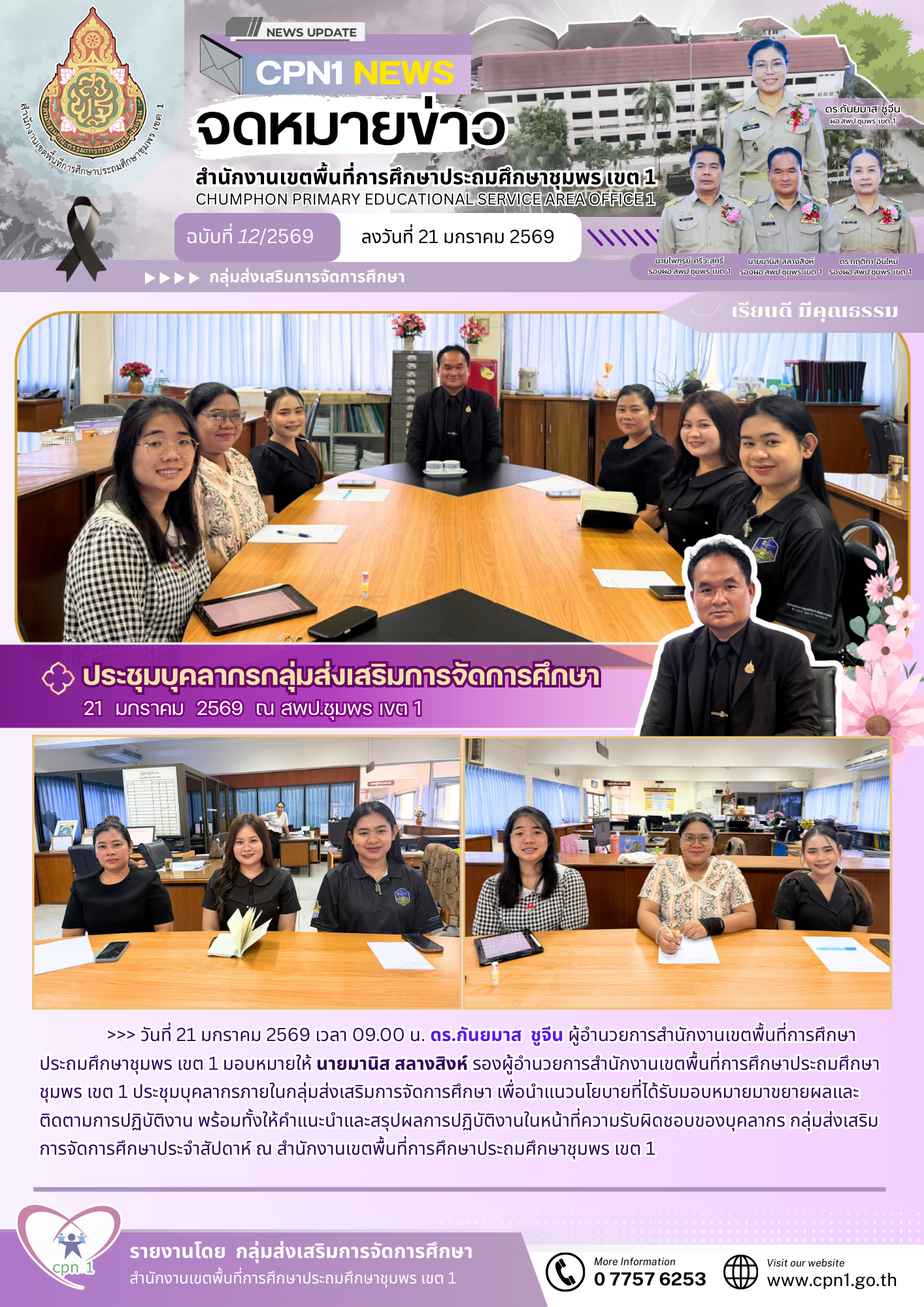 >>> วันที่ 21 มกราคม 2569 เวลา 09.00 น. ดร.กันยมาสชูจีน ผู้อำนวยการสำนักงานเขตพื้นที่การศึกษาประถมศึกษาชุมพร เขต 1 มอบหมายให้ นายมานิส สลางสิงห์ รองผู้อำนวยการสำนักงานเขตพื้นที่การศึกษาประถมศึกษาชุมพร เขต 1 ประชุมบุคลากรภายในกลุ่มส่งเสริมการจัดการศึกษา เพื่อนำแนวนโยบายที่ได้รับมอบหมายมาขยายผลและติดตามการปฏิบัติงาน พร้อมทั้งให้คำแนะนำและสรุปผลการปฏิบัติงานในหน้าที่ความรับผิดชอบของบุคลากร กลุ่มส่งเสริมการจัดการศึกษาประจำสัปดาห์ ณ สำนักงานเขตพื้นที่การศึกษาประถมศึกษาชุมพร เขต 1