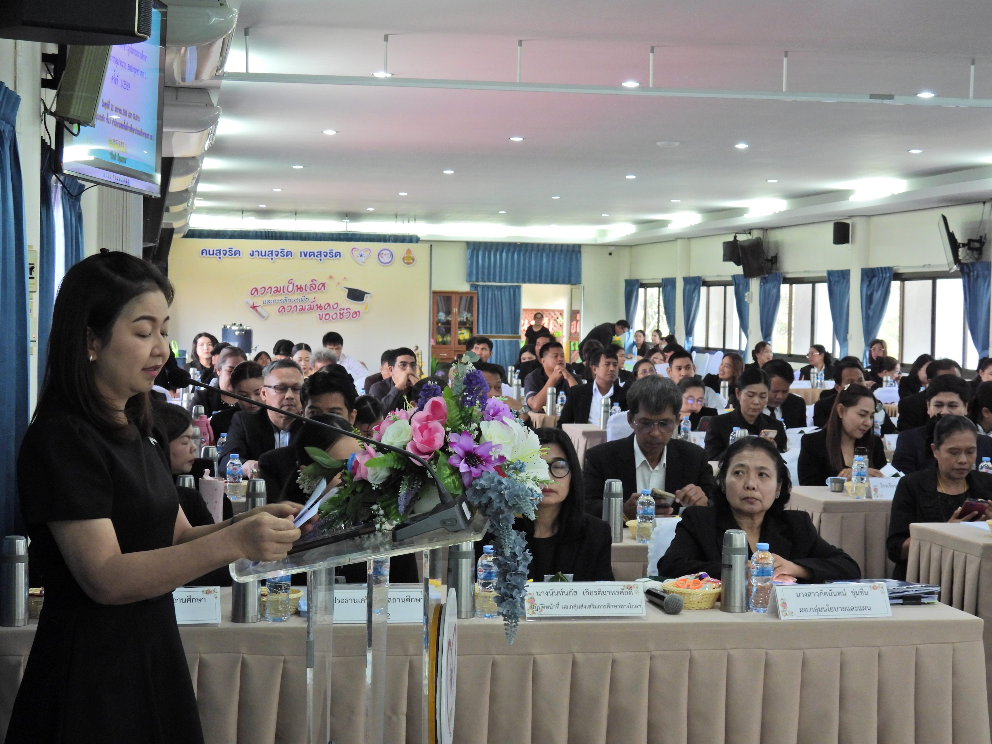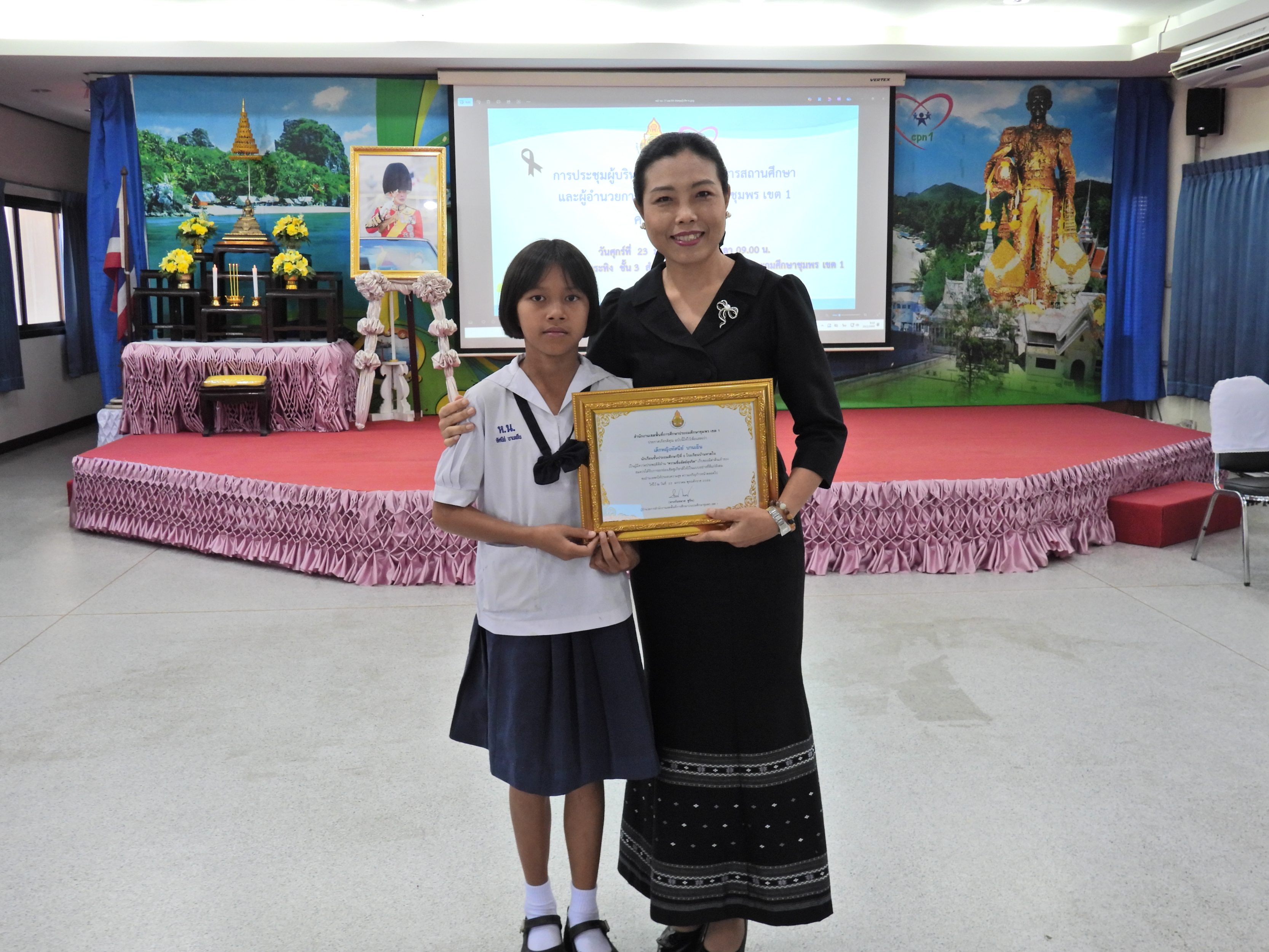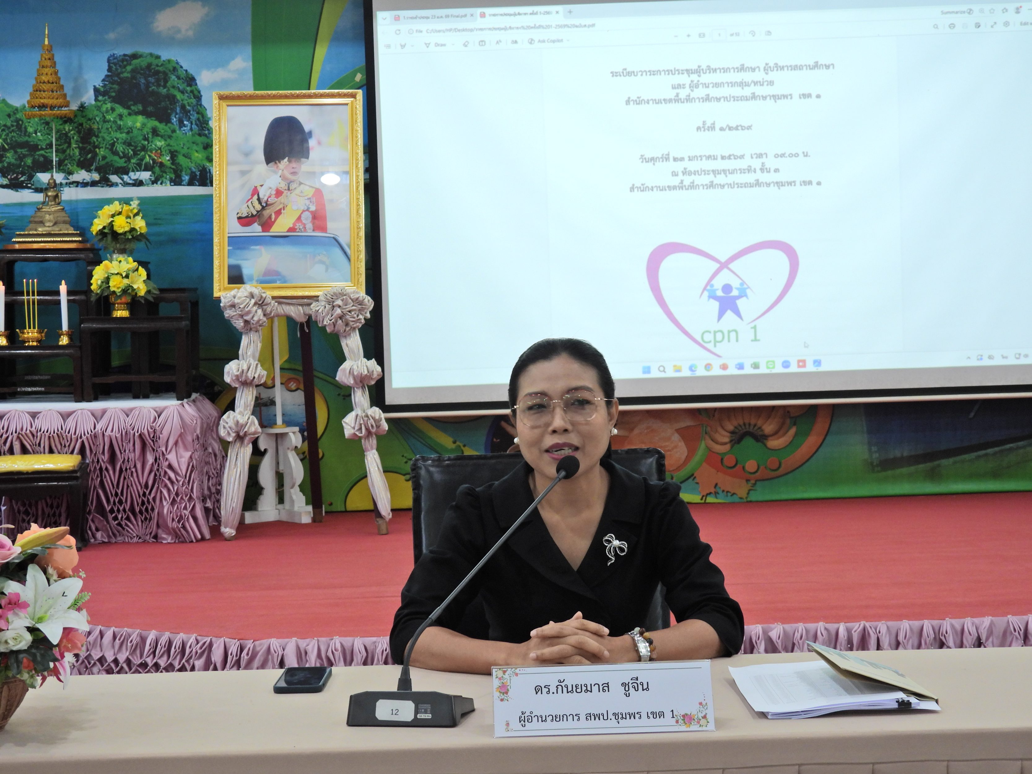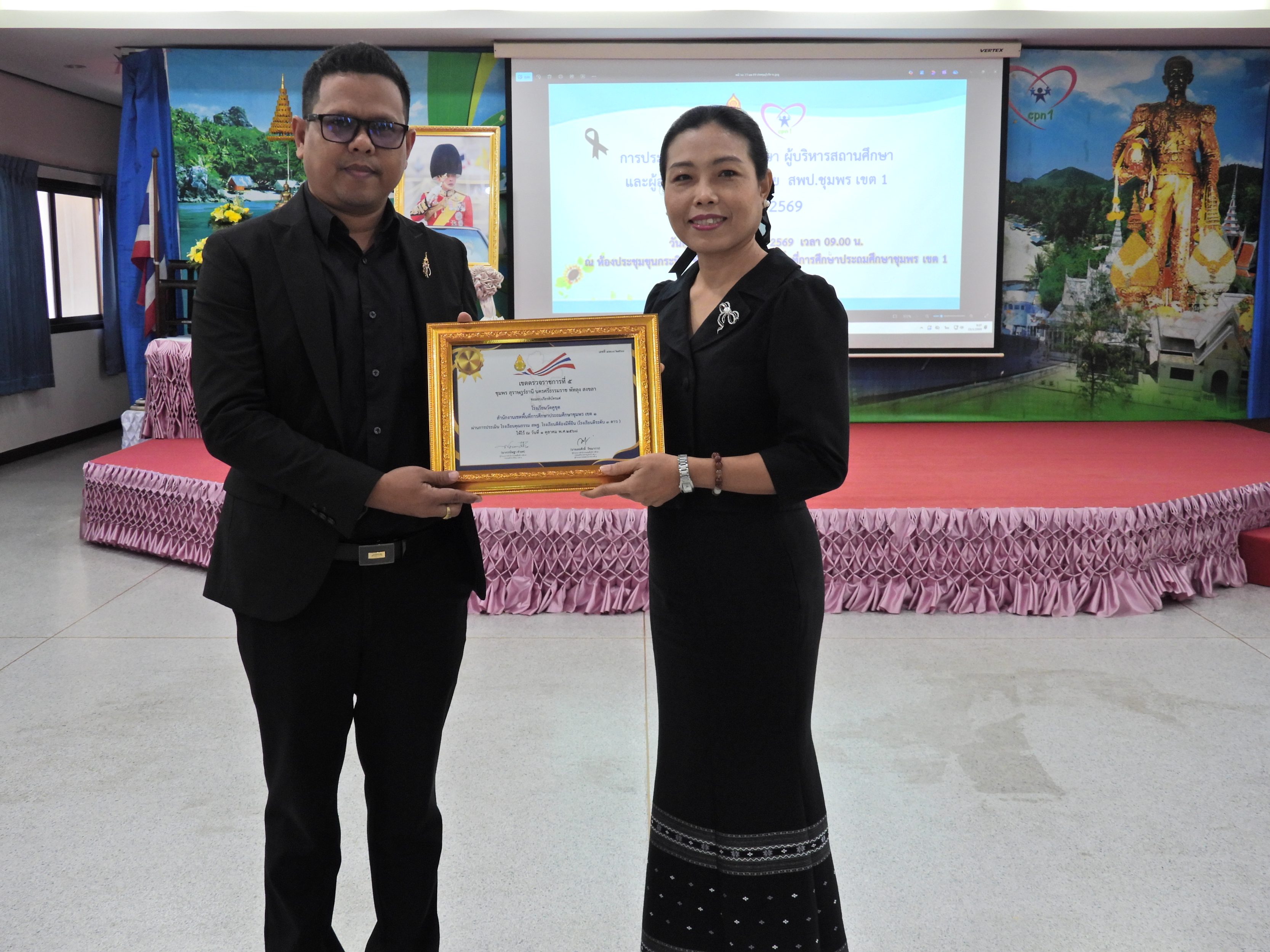 >>>วันที่ 23 มกราคม 2569 เวลา 09.00 น. ดร.กันยมาส ชูจีน ผู้อำนวยการสำนักงานเขตพื้นที่การศึกษาประถมศึกษาชุมพร เขต 1 เป็นประธานการประชุมผู้บริหารการศึกษา ผู้บริหารสถานศึกษา และผู้อำนวยการกลุ่ม/หน่วย ครั้งที่ 1/2569 เพื่อแจ้งแนวทางการดำเนินงานตามภารกิจของกระทรวงศึกษาธิการ และสำนักงานคณะกรรมการการศึกษาขั้นพื้นฐาน โดยก่อนเข้าสู่วาระการประชุม ได้มอบเกียรติบัตรให้กับโรงเรียน ประกอบด้วย กลุ่มนิเทศติดตาม และประเมินผลการจัดการศึกษา มอบเกียรติบัตรโรงเรียนดีต้องมีที่ยืน โรงเรียนดี ระดับ 3 ดาว ระดับเขตตรวจราชการที่ 5 ประจำปีงบประมาณ พ.ศ. 2568 ให้กับโรงเรียนที่เข้ารับการประเมินและผ่านการประเมินจำนวน 24 โรงเรียน และกลุ่มส่งเสริมการจัดการศึกษา มอบเกียรติบัตรให้กับ เด็กหญิงทัศนีย์ บานเย็น นักเรียนชั้นประถมศึกษาปีที่ 5 โรงเรียนบ้านหาดใน ซึ่งเป็นผู้มีความประพฤติดีด้าน "ความซื่อสัตย์สุจริต" เก็บของมีค่าคืนเจ้าของ หลังจากนั้น ได้ดำเนินการตามระเบียบวาระการประชุมตามลำดับ โดยมี นายมานิส สลางสิงห์ และ ดร.กฤติกา อินใหม่ รองผู้อำนวยการสำนักงานเขตพื้นที่การศึกษาประถมศึกษาชุมพร เขต 1 และผู้อำนวยการกลุ่ม/หน่วย ร่วมชี้แจงภารกิจและการดำเนินงานเรื่องต่างๆ ของกลุ่มหน่วยใน สพป.ชุมพร เขต 1 ให้ที่ประชุมได้รับทราบ ณ ห้องประชุมขุนกระทิง ชั้น 3 สำนักงานเขตพื้นที่การศึกษาประถมศึกษาชุมพร เขต 1