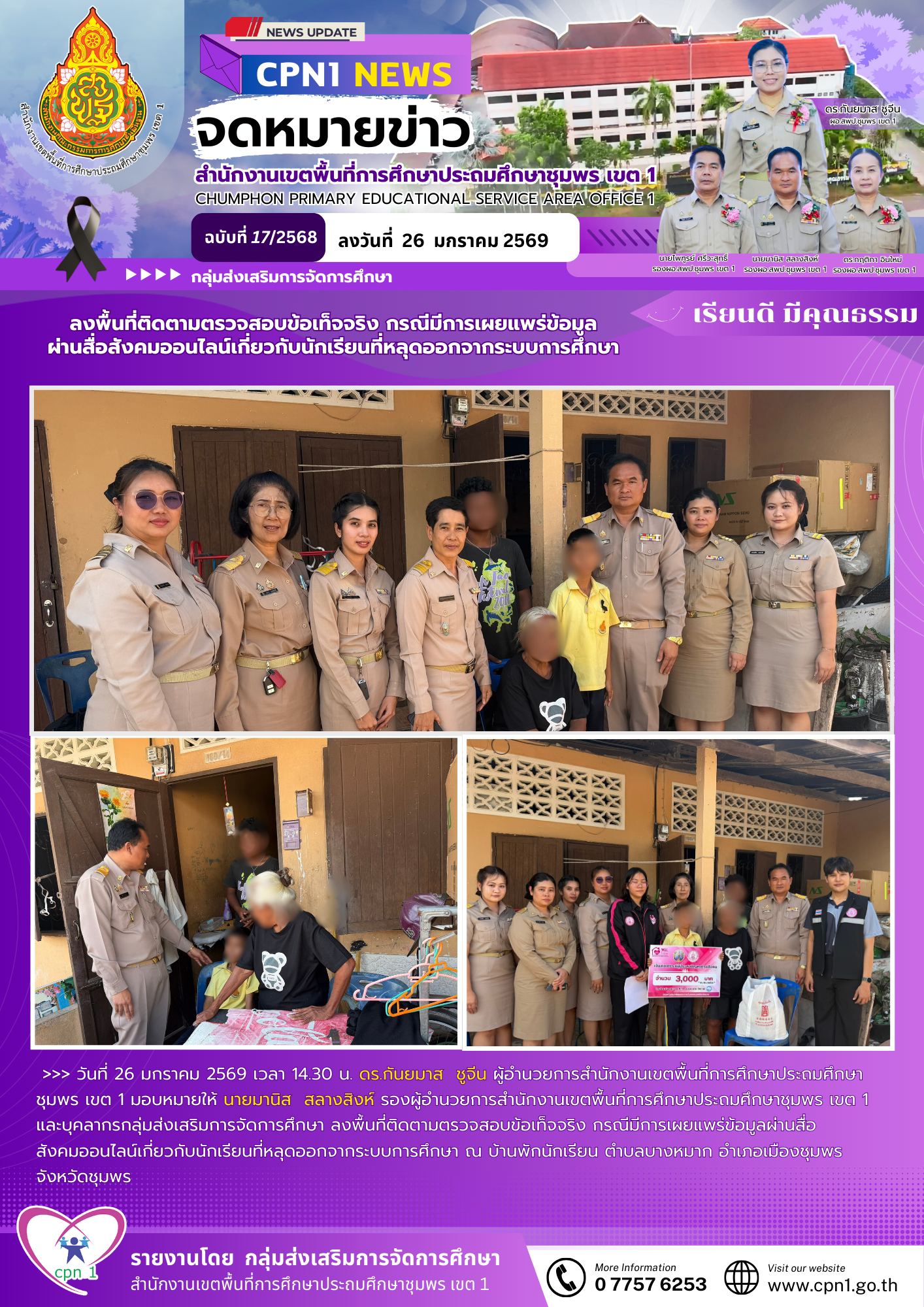 >>> วันที่ 26 มกราคม 2569 เวลา 14.30 น. ดร.กันยมาส ชูจีน ผู้อำนวยการสำนักงานเขตพื้นที่การศึกษาประถมศึกษาชุมพร เขต 1 มอบหมายให้ นายมานิส สลางสิงห์ รองผู้อำนวยการสำนักงานเขตพื้นที่การศึกษาประถมศึกษาชุมพร เขต 1 และบุคลากรกลุ่มส่งเสริมการจัดการศึกษา ลงพื้นที่ติดตามตรวจสอบข้อเท็จจริง กรณีมีการเผยแพร่ข้อมูลผ่านสื่อสังคมออนไลน์เกี่ยวกับนักเรียนที่หลุดออกจากระบบการศึกษา ณ บ้านพักนักเรียน ตำบลบางหมาก อำเภอเมืองชุมพร จังหวัดชุมพร