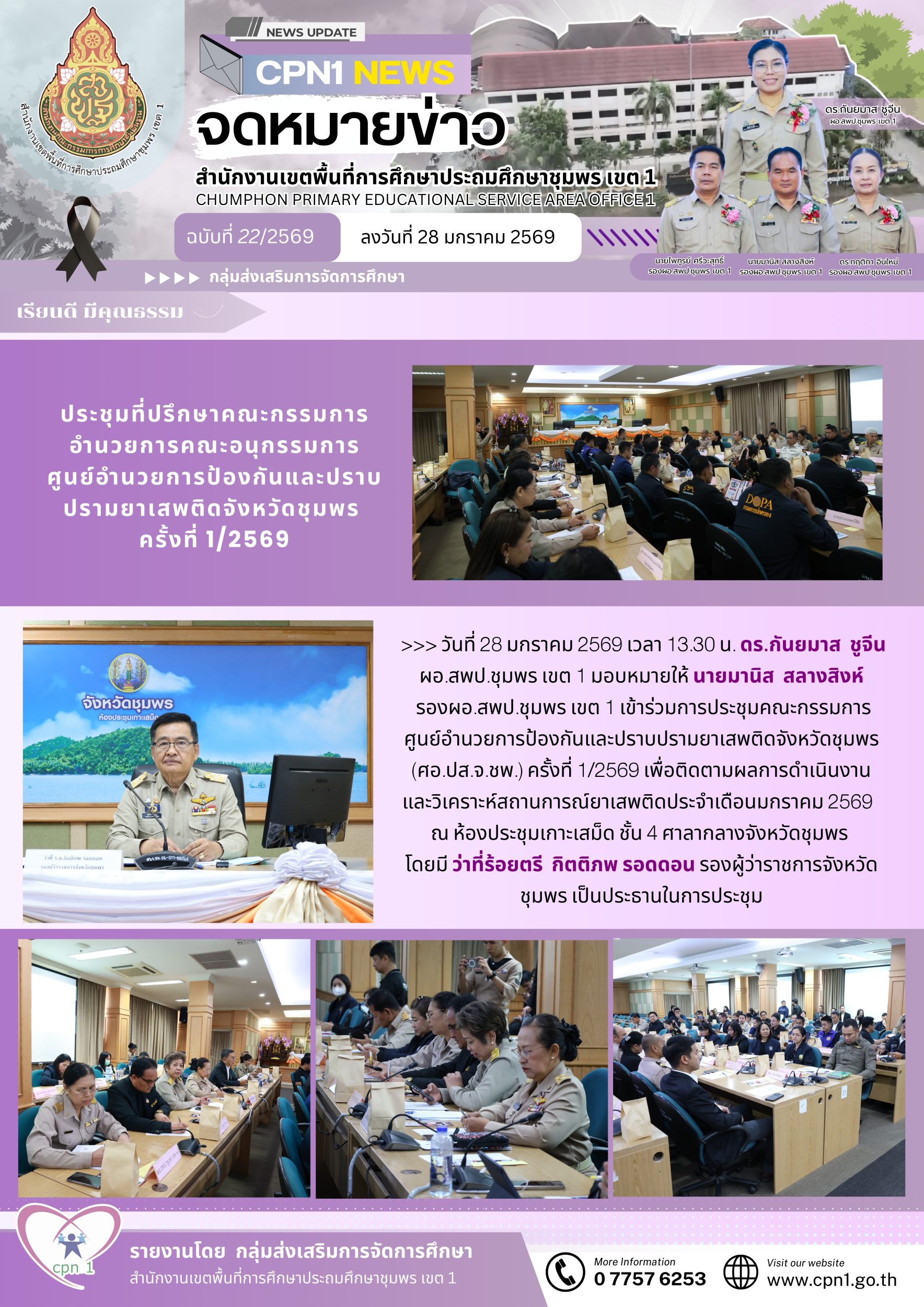 >>> วันที่ 28 มกราคม 2569 เวลา 13.30 น. ดร.กันยมาส ชูจีน ผอ.สพป.ชุมพร เขต 1 มอบหมายให้ นายมานิส สลางสิงห์ รองผอ.สพป.ชุมพร เขต 1 เข้าร่วมการประชุมคณะกรรมการศูนย์อำนวยการป้องกันและปราบปรามยาเสพติดจังหวัดชุมพร (ศอ.ปส.จ.ชพ.) ครั้งที่ 1/2569 เพื่อติดตามผลการดำเนินงานและวิเคราะห์สถานการณ์ยาเสพติดประจำเดือนมกราคม 2569 ณ ห้องประชุมเกาะเสม็ด ชั้น 4 ศาลากลางจังหวัดชุมพร โดยมี ว่าที่ร้อยตรี กิตติภพ รอดดอน รองผู้ว่าราชการจังหวัดชุมพร เป็นประธานในการประชุม