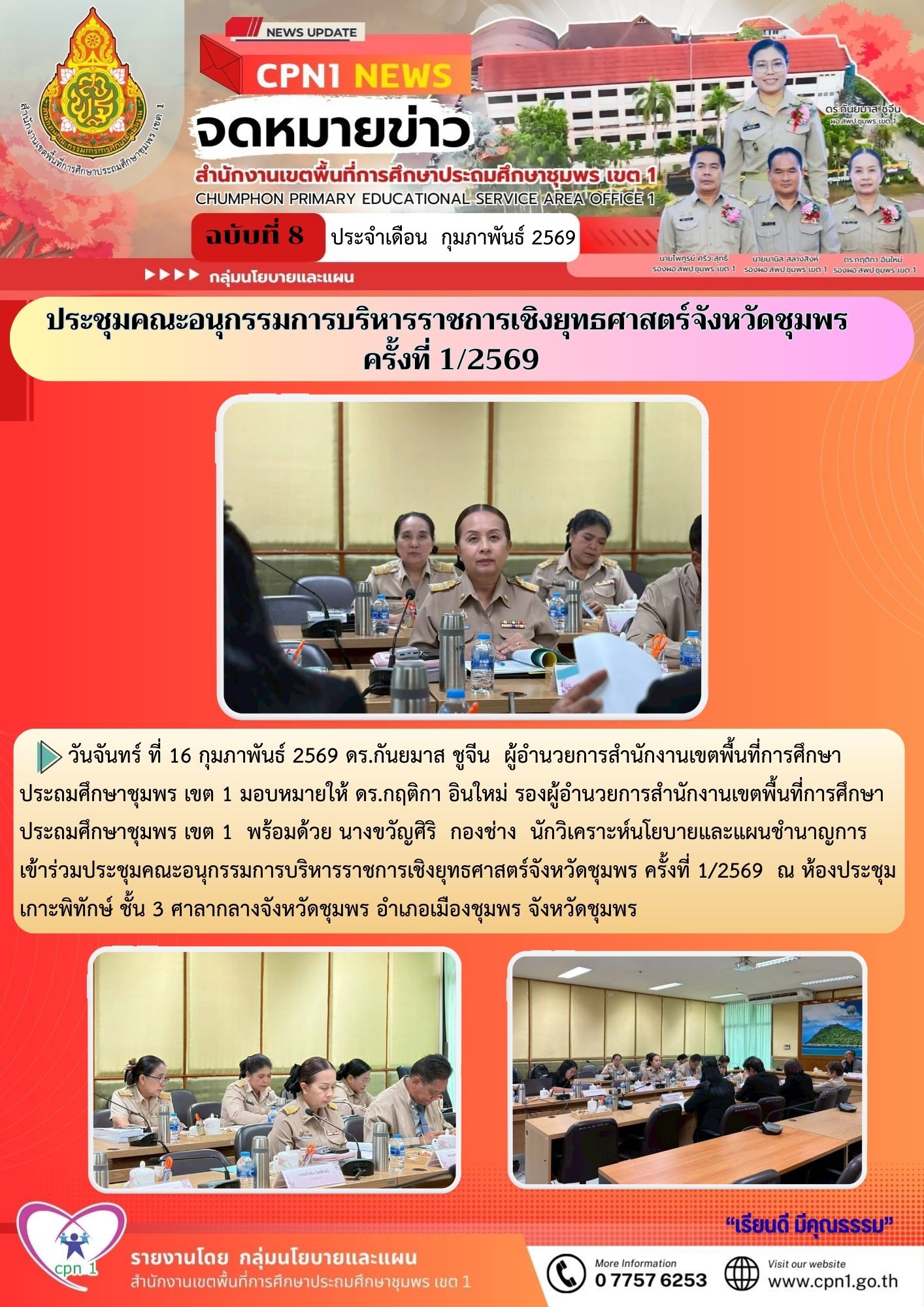 วันจันทร์ ที่ 16 กุมภาพันธ์ 2569 ดร.กันยมาส ชูจีน ผู้อำนวยการสำนักงานเขตพื้นที่การศึกษาประถมศึกษาชุมพร เขต 1 มอบหมายให้ ดร.กฤติกา อินใหม่ รองผู้อำนวยการสำนักงานเขตพื้นที่การศึกษาประถมศึกษาชุมพร เขต 1 พร้อมด้วย นางขวัญศิริ กองช่าง นักวิเคราะห์นโยบายและแผนชำนาญการ เข้าร่วมประชุมคณะอนุกรรมการบริหารราชการเชิงยุทธศาสตร์จังหวัดชุมพร ครั้งที่ 1/2569 ณ ห้องประชุมเกาะพิทักษ์ ชั้น 3 ศาลากลางจังหวัดชุมพร อำเภอเมืองชุมพร จังหวัดชุมพร
