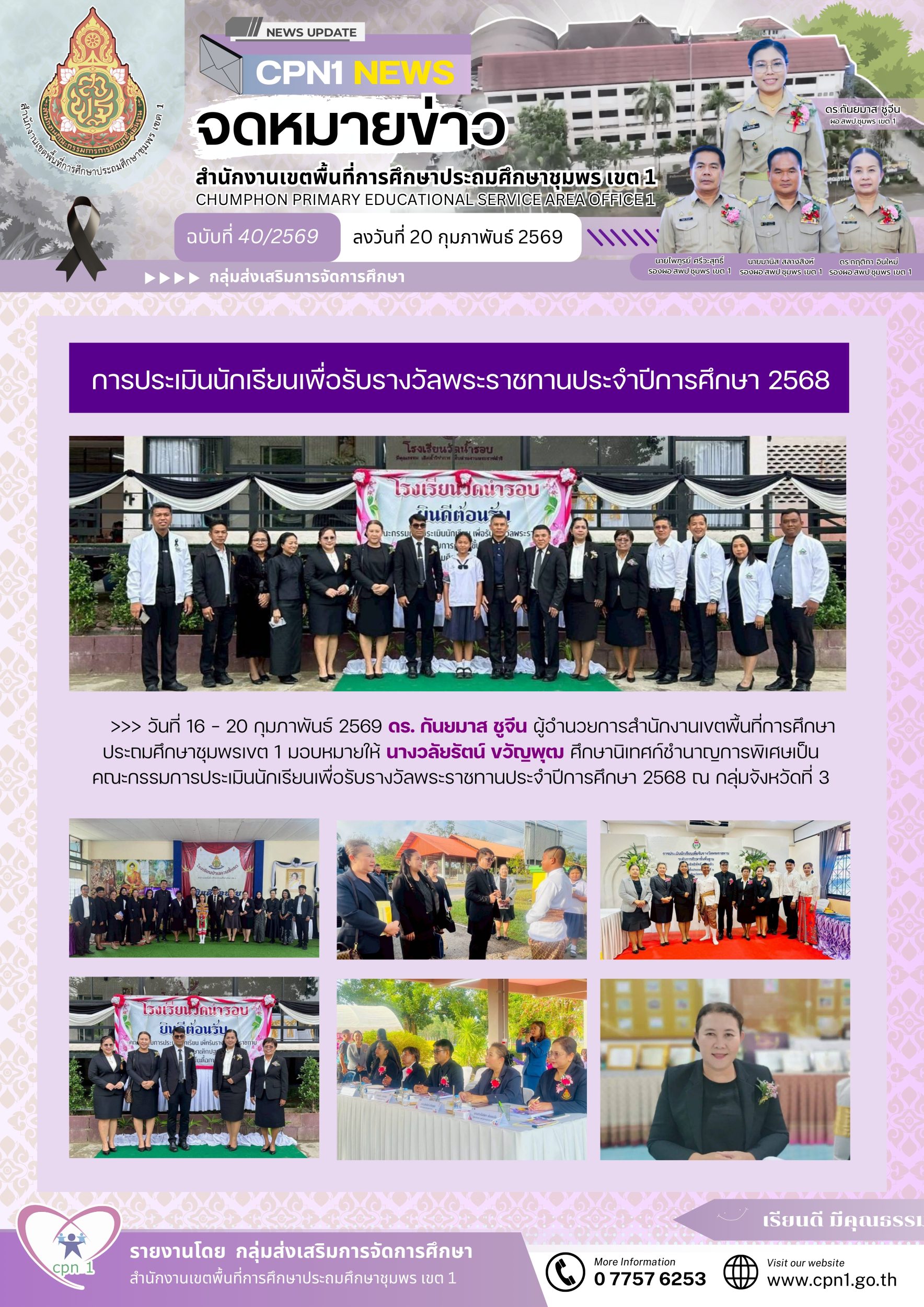 >>> วันที่ 16 – 20 กุมภาพันธ์ 2569 ดร. กันยมาส ชูจีน ผู้อำนวยการสำนักงานเขตพื้นที่การศึกษาประถมศึกษาชุมพรเขต 1 มอบหมายให้ นางวลัยรัตน์ ขวัญพุฒ ศึกษานิเทศก์ชำนาญการพิเศษเป็น คณะกรรมการประเมินนักเรียนเพื่อรับรางวัลพระราชทานประจำปีการศึกษา 2568 ณ กลุ่มจังหวัดที่ 3