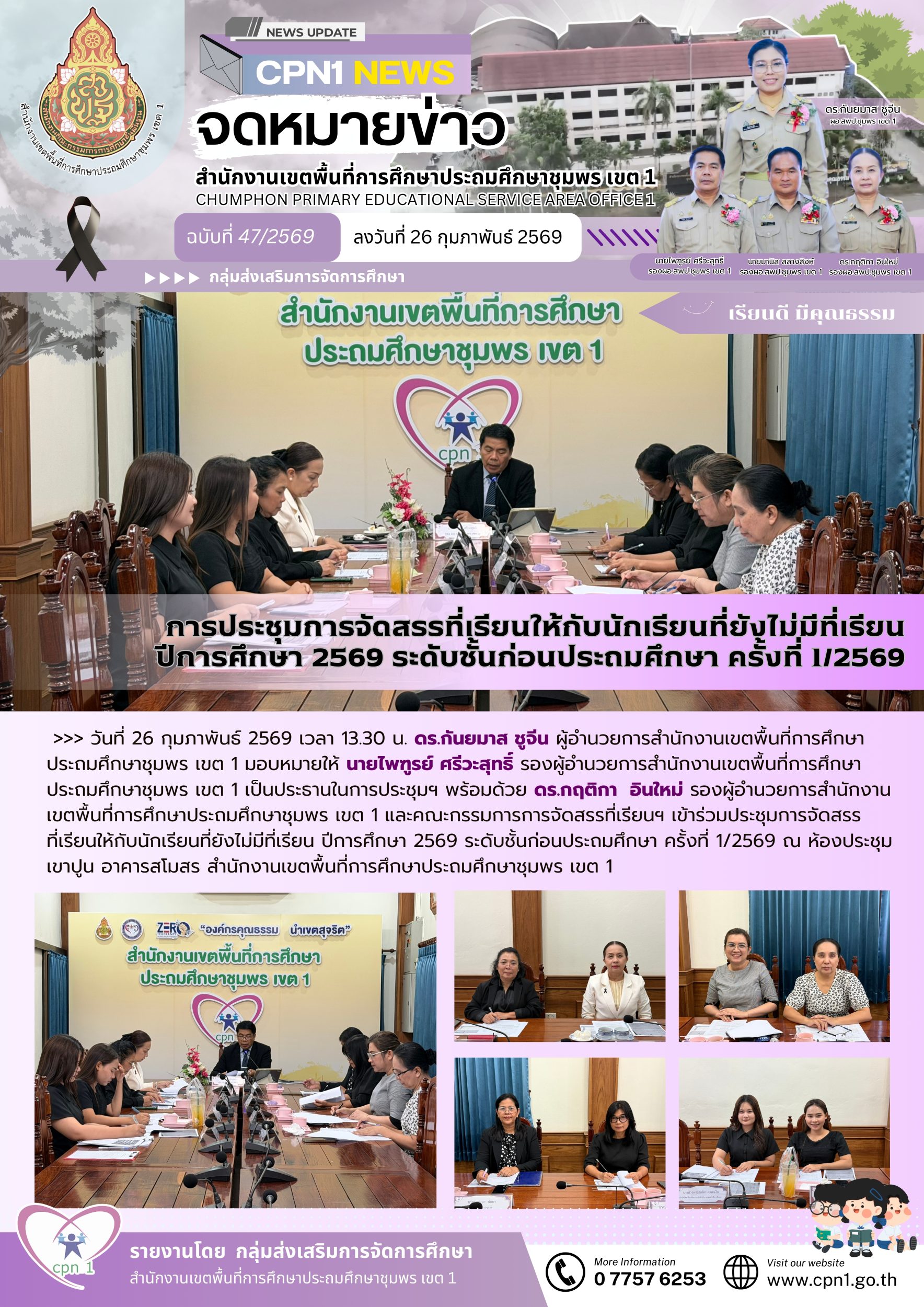 >>> วันที่ 26 กุมภาพันธ์ 2569 เวลา 13.30 น. ดร.กันยมาส ชูจีน ผู้อำนวยการสำนักงานเขตพื้นที่การศึกษาประถมศึกษาชุมพร เขต 1 มอบหมายให้ นายไพฑูรย์ ศรีวะสุทธิ์ รองผู้อำนวยการสำนักงานเขตพื้นที่การศึกษาประถมศึกษาชุมพร เขต 1 เป็นประธานในการประชุมฯ พร้อมด้วย ดร.กฤติกา อินใหม่ รองผู้อำนวยการสำนักงานเขตพื้นที่การศึกษาประถมศึกษาชุมพร เขต 1 และคณะกรรมการการจัดสรรที่เรียนฯ เข้าร่วมประชุมการจัดสรรที่เรียนให้กับนักเรียนที่ยังไม่มีที่เรียน ปีการศึกษา 2569 ระดับชั้นก่อนประถมศึกษา ครั้งที่ 1/2569 ณ ห้องประชุมเขาปูน อาคารสโมสร สำนักงานเขตพื้นที่การศึกษาประถมศึกษาชุมพร เขต 1