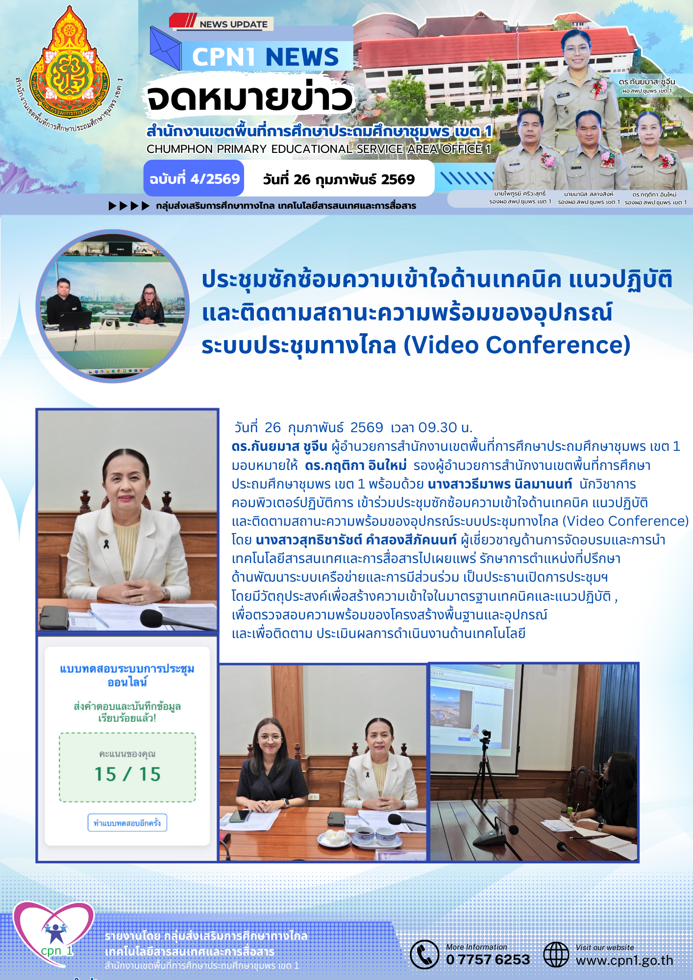 ประชุมซักซ้อมความเข้าใจด้านเทคนิค แนวปฏิบัติ และติดตามสถานะความพร้อมของอุปกรณ์ระบบประชุมทางไกล (Video Conference) 26 กุมภาพันธ์ 256926 กุมภาพันธ์ 2026 Teemaphon Ninmanon ข่าวและกิจกรรม สพป.ชพ.1, ข่าวและกิจกรรมกลุ่มส่งเสริมการจัดการศึกษาทางไกลฯ FacebookFacebookXXLINELine Teemaphon Ninmanon