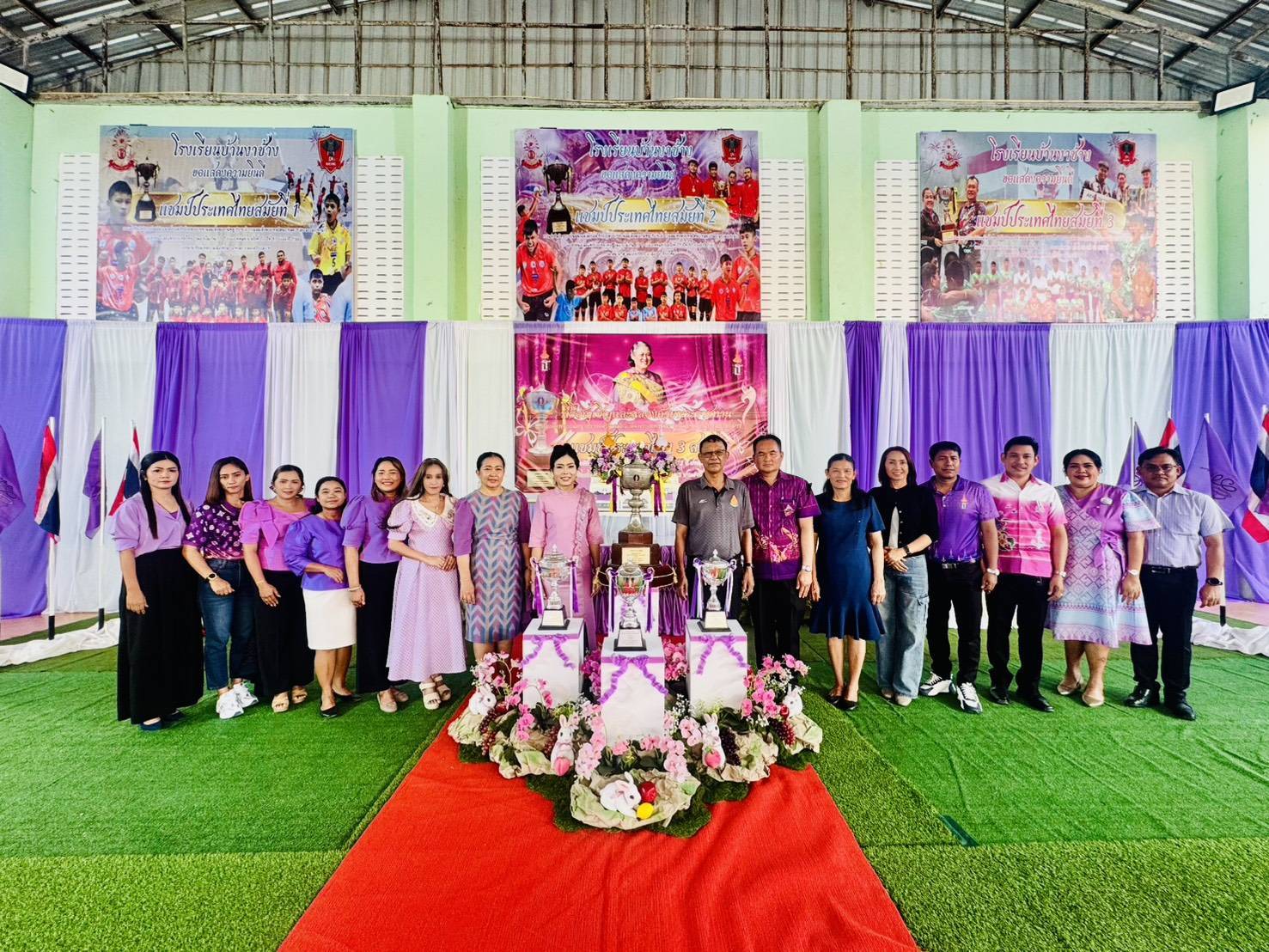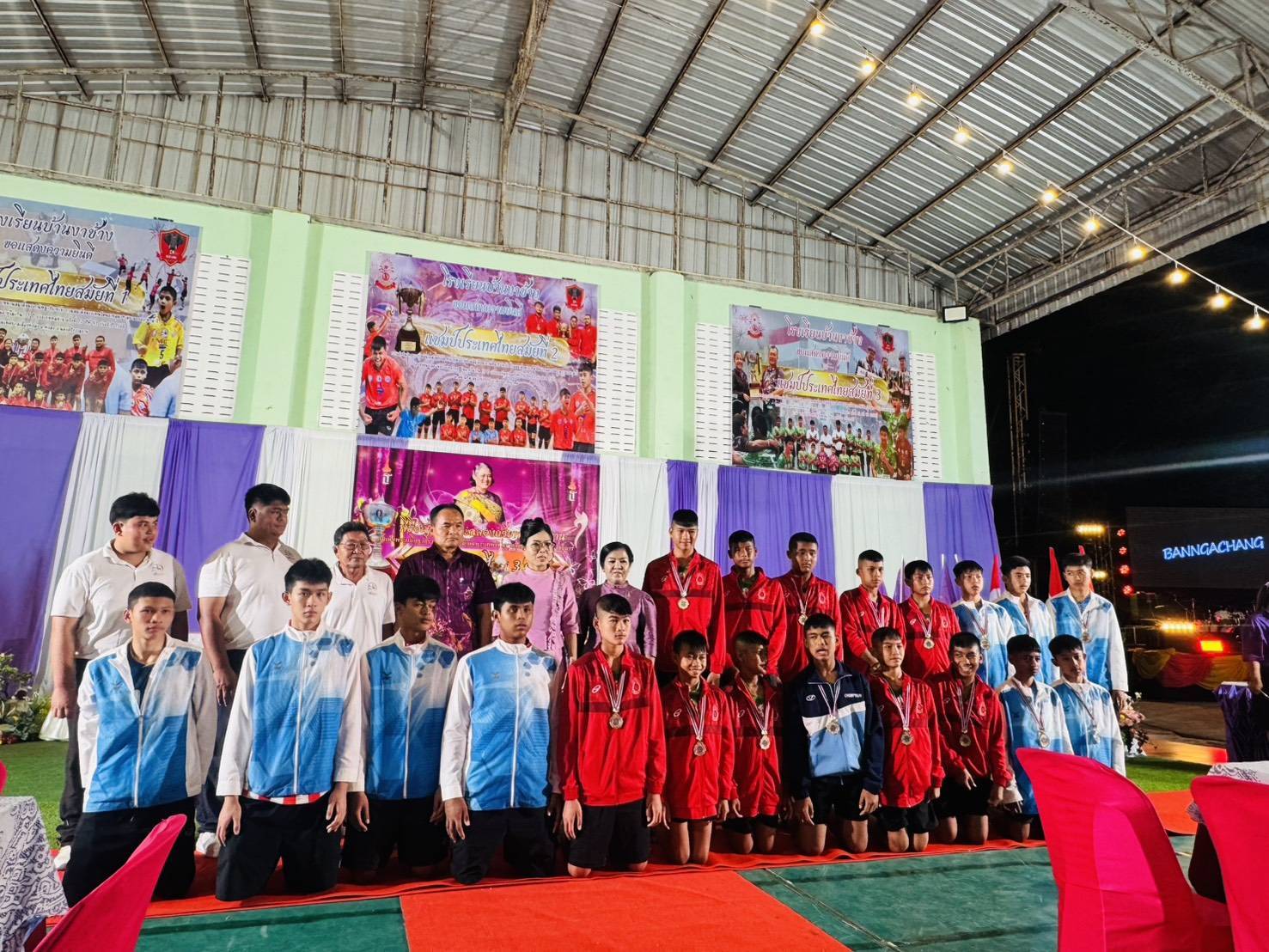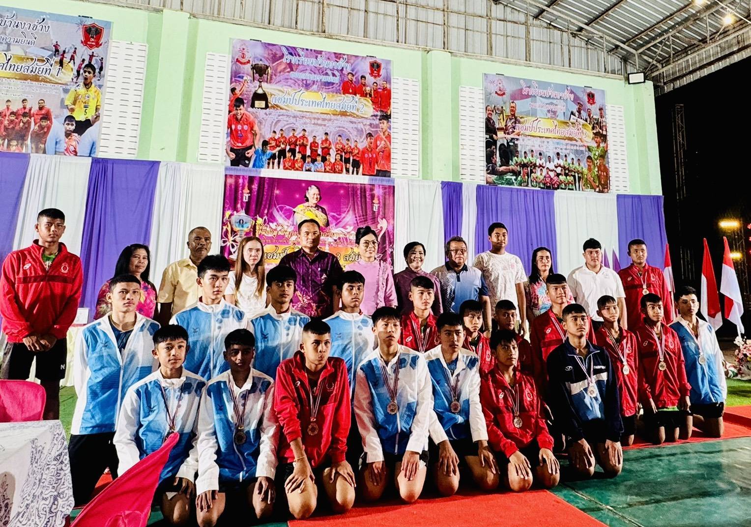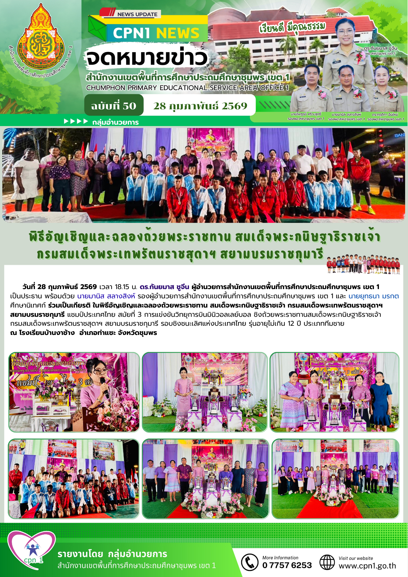 วันที่ 28 กุมภาพันธ์ 2569 เวลา 18.15 น. ดร.กันยมาส ชูจีน ผู้อำนวยการสำนักงานเขตพื้นที่การศึกษาประถมศึกษาชุมพร เขต 1 เป็นประธาน พร้อมด้วย นายมานิส สลางสิงห์ รองผู้อำนวยการสำนักงานเขตพื้นที่การศึกษาประถมศึกษาชุมพร เขต 1 และ นายยุทธนา มรกต ศึกษานิเทศก์ ร่วมเป็นเกียรติ ในพิธีอัญเชิญและฉลองถ้วยพระราชทาน สมเด็จพระกนิษฐาธิราชเจ้า กรมสมเด็จพระเทพรัตนราชสุดาฯ สยามบรมราชกุมารี แชมป์ประเทศไทย สมัยที่ 3 การแข่งขันวิทยุการบินมินิวอลเลย์บอล ชิงถ้วยพระราชทานสมเด็จพระกนิษฐาธิราชเจ้า กรมสมเด็จพระเทพรัตนราชสุดาฯ สยามบรมราชกุมารี รอบชิงชนะเลิศแห่งประเทศไทย รุ่นอายุไม่เกิน 12 ปี ประเภททีมชาย ณ โรงเรียนบ้านงาช้างอำเภอท่าแซะ จังหวัดชุมพร