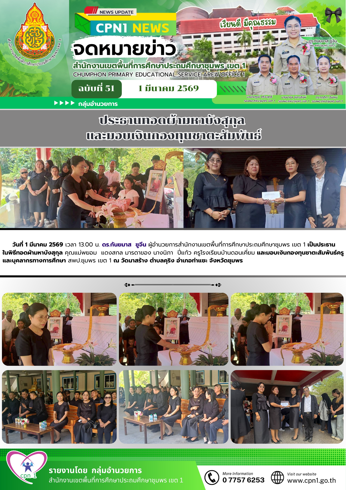 วันที่ 1 มีนาคม 2569 เวลา 13.00 น. ดร.กันยมาส ชูจีน ผู้อำนวยการสำนักงานเขตพื้นที่การศึกษาประถมศึกษาชุมพร เขต 1 เป็นประธานในพิธีทอดผ้ามหาบังสุกุล คุณแม่พยอม แดงสกล มารดาของ นางนิภา ปี่แก้ว ครูโรงเรียนบ้านดอนเคี่ยม และมอบเงินกองทุนชาตะสัมพันธ์ครู และบุคลากรทางการศึกษา สพป.ชุมพร เขต 1 ณ วัดนาสร้าง ตำบลคุริง อำเภอท่าแซะ จังหวัดชุมพร