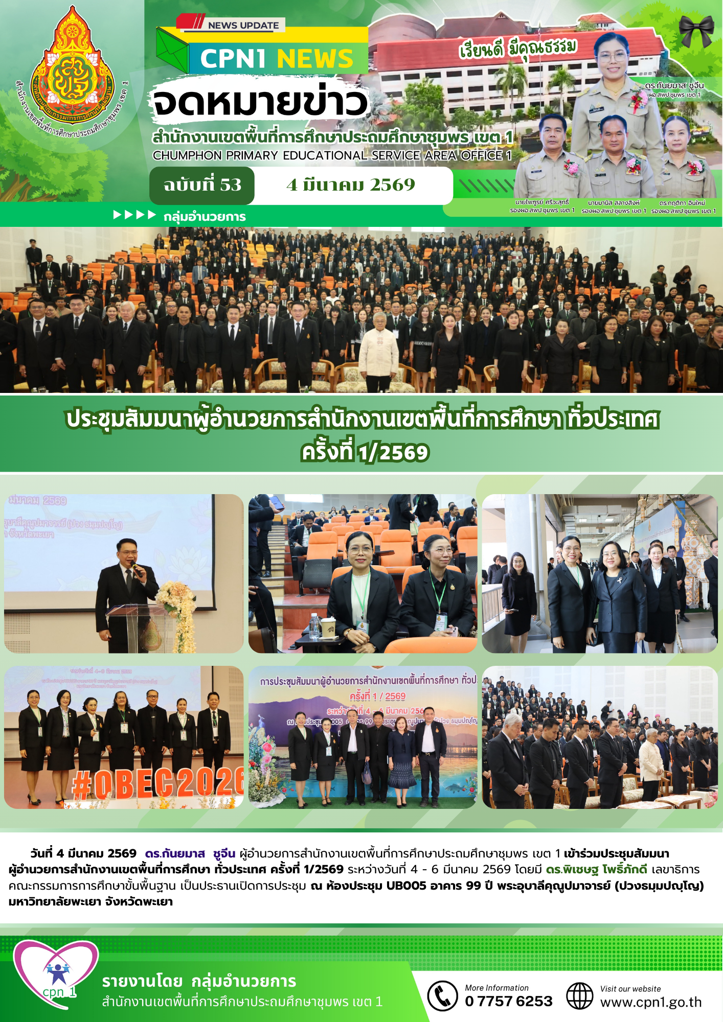 วันที่ 4 มีนาคม 2569 ดร.กันยมาส ชูจีน ผู้อำนวยการสำนักงานเขตพื้นที่การศึกษาประถมศึกษาชุมพร เขต 1 เข้าร่วมประชุมสัมมนาผู้อำนวยการสำนักงานเขตพื้นที่การศึกษา ทั่วประเทศ ครั้งที่ 1/2569 ระหว่างวันที่ 4 – 6 มีนาคม 2569 โดยมี ดร.พิเชษฐ โพธิ์ภักดี เลขาธิการคณะกรรมการการศึกษาขั้นพื้นฐาน เป็นประธานเปิดการประชุม ณ ห้องประชุม UB005 อาคาร 99 ปี พระอุบาลีคุณูปมาจารย์ (ปวงธมฺมปญฺโญ) มหาวิทยาลัยพะเยา จังหวัดพะเยา
