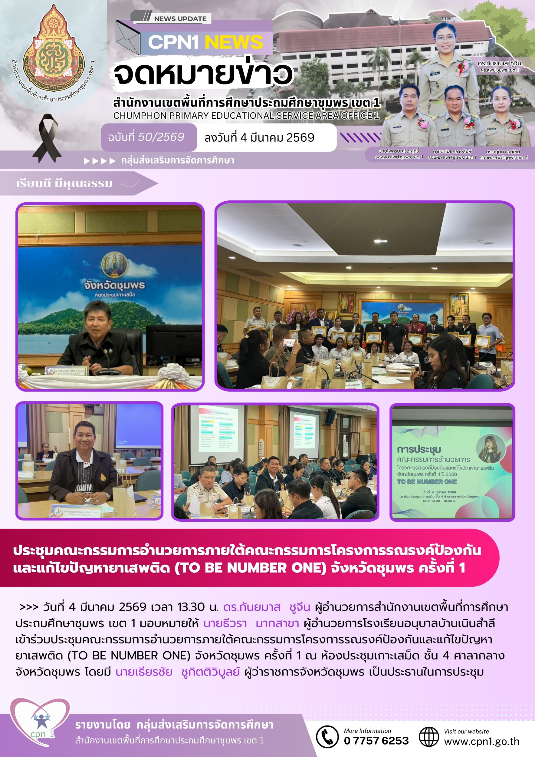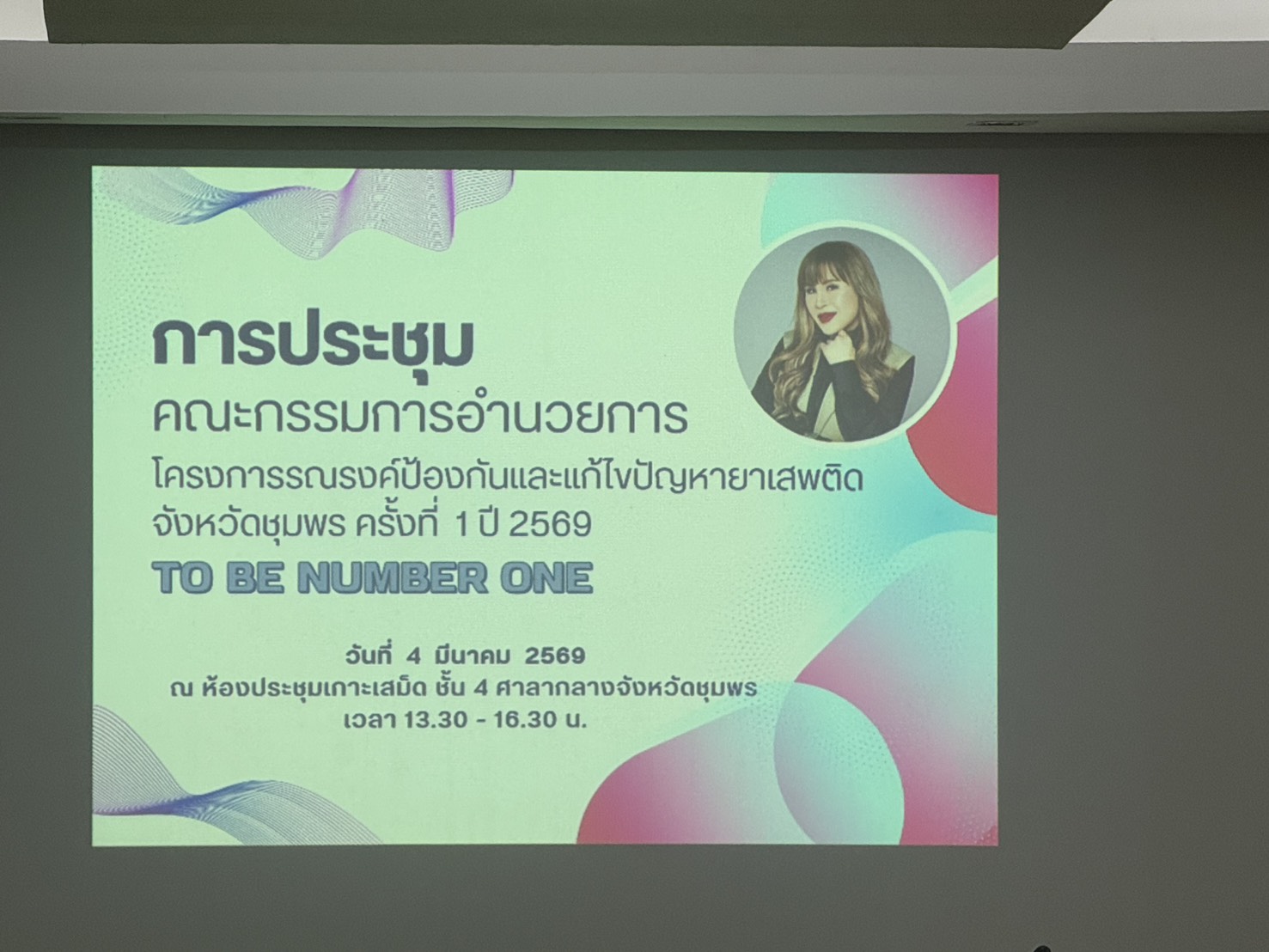 >>> วันที่ 4 มีนาคม 2569 เวลา 13.30 น. ดร.กันยมาส ชูจีน ผู้อำนวยการสำนักงานเขตพื้นที่การศึกษาประถมศึกษาชุมพร เขต 1 มอบหมายให้ นายธีวรา มากสาขา ผู้อำนวยการโรงเรียนอนุบาลบ้านเนินสำลี เข้าร่วมประชุมคณะกรรมการอำนวยการภายใต้คณะกรรมการโครงการรณรงค์ป้องกันและแก้ไขปัญหายาเสพติด (TO BE NUMBER ONE) จังหวัดชุมพร ครั้งที่ 1 ณ ห้องประชุมเกาะเสม็ด ชั้น 4 ศาลากลางจังหวัดชุมพร โดยมี นายเธียรชัย ชูกิตติวิบูลย์ ผู้ว่าราชการจังหวัดชุมพร เป็นประธานในการประชุม