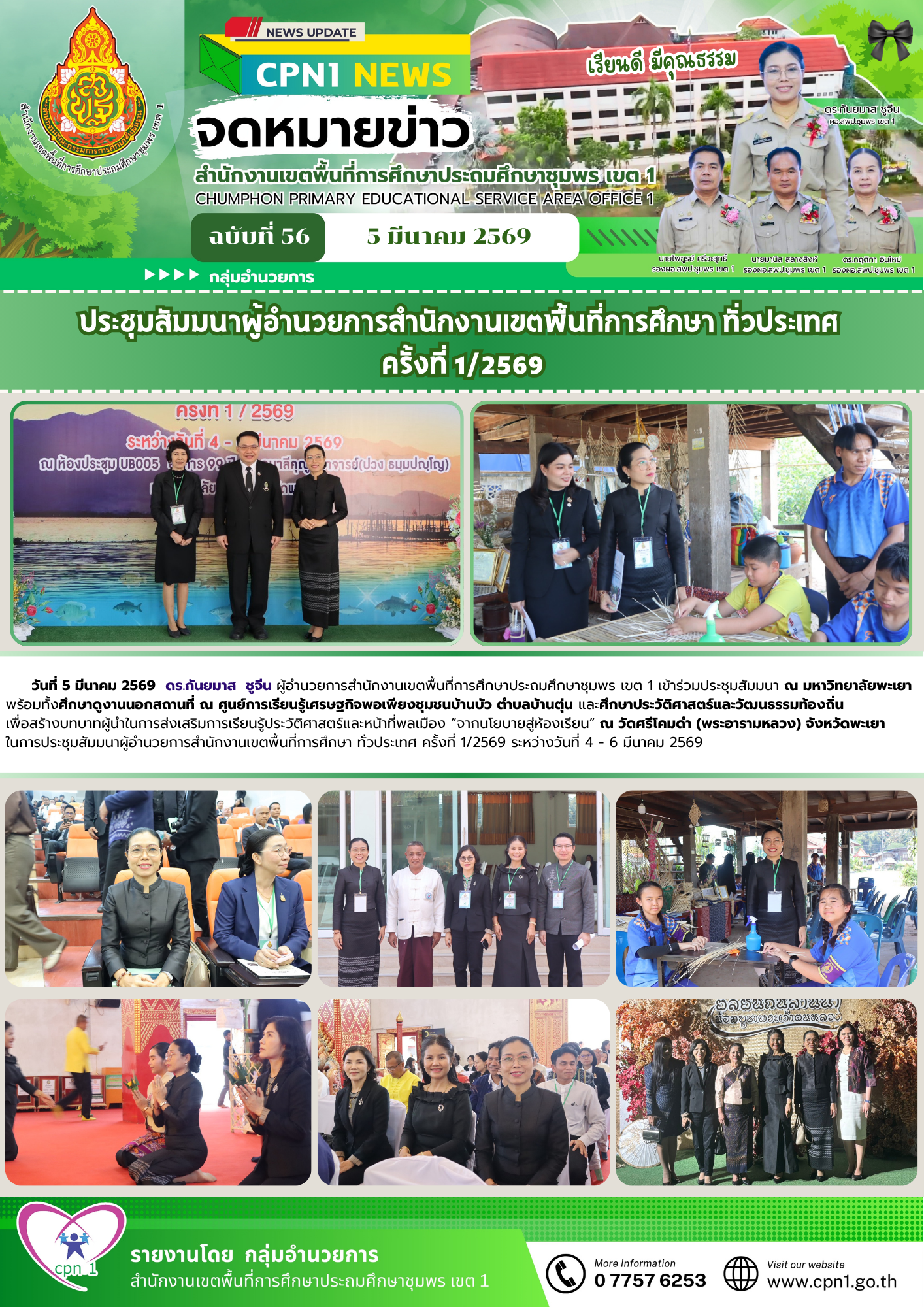 วันที่ 5 มีนาคม 2569 ดร.กันยมาส ชูจีน ผู้อำนวยการสำนักงานเขตพื้นที่การศึกษาประถมศึกษาชุมพร เขต 1 เข้าร่วมประชุมสัมมนา ณ มหาวิทยาลัยพะเยา พร้อมทั้งศึกษาดูงานนอกสถานที่ ณ ศูนย์การเรียนรู้เศรษฐกิจพอเพียงชุมชนบ้านบัว ตำบลบ้านตุ่น และศึกษาประวัติศาสตร์และวัฒนธรรมท้องถิ่น เพื่อสร้างบทบาทผู้นำในการส่งเสริมการเรียนรู้ประวัติศาสตร์และหน้าที่พลเมือง "จากนโยบายสู่ห้องเรียน" ณ วัดศรีโคมดำ (พระอารามหลวง) จังหวัดพะเยา ในการประชุมสัมมนาผู้อำนวยการสำนักงานเขตพื้นที่การศึกษา ทั่วประเทศ ครั้งที่ 1/2569 ระหว่างวันที่ 4 – 6 มีนาคม 2569