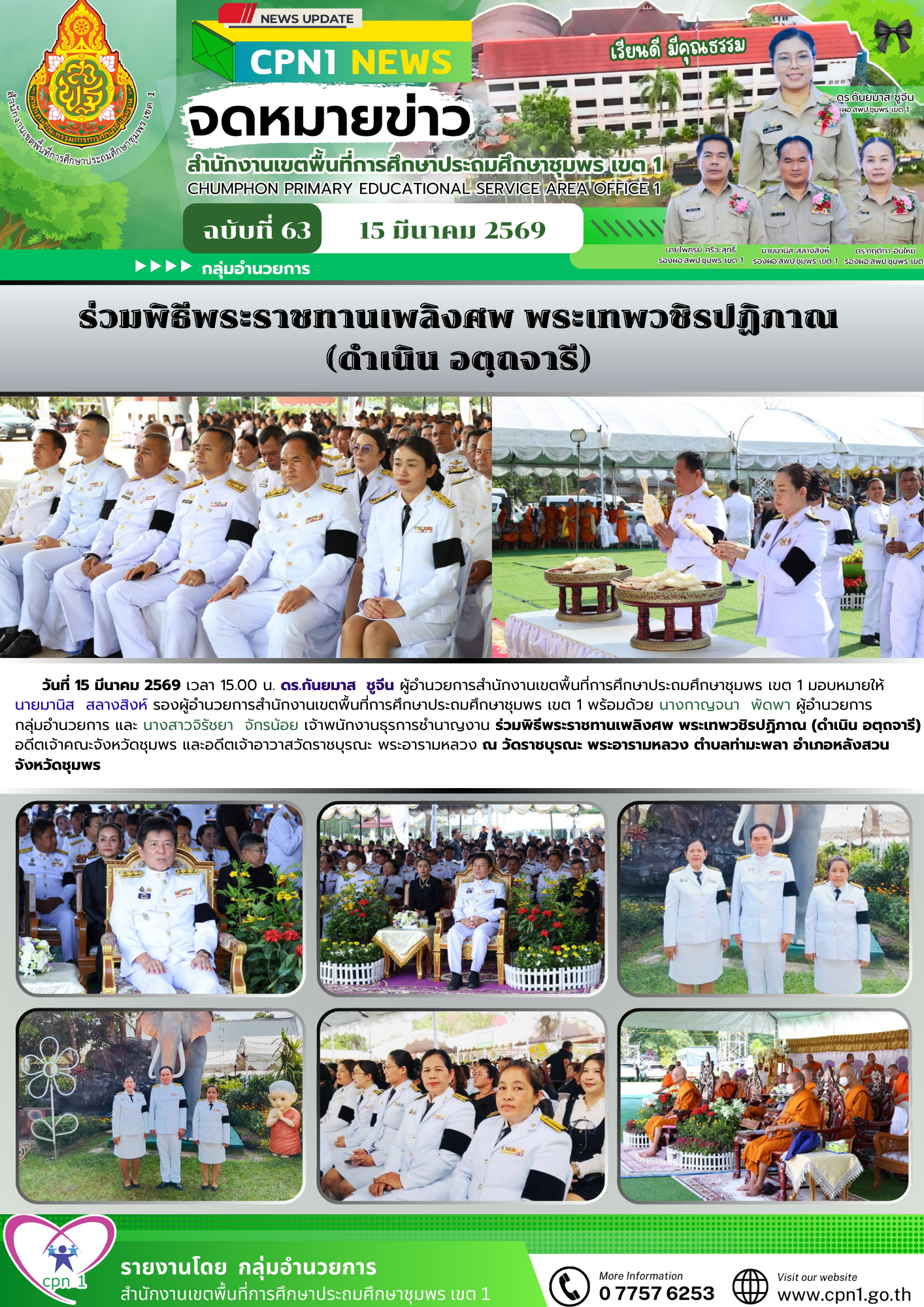 วันที่ 15 มีนาคม 2569 เวลา 15.00 น. ดร.กันยมาส ชูจีน ผู้อำนวยการสำนักงานเขตพื้นที่การศึกษาประถมศึกษาชุมพร เขต 1 มอบหมายให้ นายมานิส สลางสิงห์ รองผู้อำนวยการสำนักงานเขตพื้นที่การศึกษาประถมศึกษาชุมพร เขต 1 พร้อมด้วย นางกาญจนา พัดพา ผู้อำนวยการกลุ่มอำนวยการ และ นางสาวจิรัชยา จักรน้อย เจ้าพนักงานธุรการชำนาญงาน ร่วมพิธีพระราชทานเพลิงศพ พระเทพวชิรปฏิภาณ (ดำเนิน อตฺถจารี) อดีตเจ้าคณะจังหวัดชุมพร และอดีตเจ้าอาวาสวัดราชบุรณะ พระอารามหลวง ณ วัดราชบุรณะ พระอารามหลวง ตำบลท่ามะพลา อำเภอหลังสวน จังหวัดชุมพร