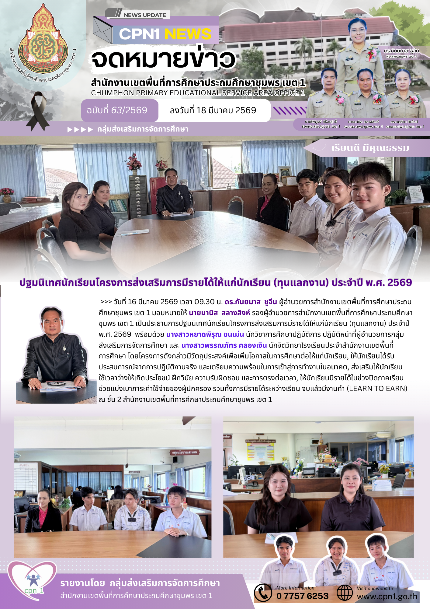 >>> วันที่ 16 มีนาคม 2569 เวลา 09.30 น. ดร.กันยมาส ชูจีน ผู้อำนวยการสำนักงานเขตพื้นที่การศึกษาประถมศึกษาชุมพร เขต 1 มอบหมายให้ นายมานิส สลางสิงห์ รองผู้อำนวยการสำนักงานเขตพื้นที่การศึกษาประถมศึกษาชุมพร เขต 1 เป็นประธานการปฐมนิเทศนักเรียนโครงการส่งเสริมการมีรายได้ให้แก่นักเรียน (ทุนแลกงาน) ประจำปี พ.ศ. 2569 พร้อมด้วย นางสาวหยาดพิรุณ ขนเม่น นักวิชาการศึกษาปฏิบัติการ ปฏิบัติหน้าที่ผู้อำนวยการกลุ่มส่งเสริมการจัดการศึกษา และ นางสาวพรรณภัทร คลองเงิน นักจิตวิทยาโรงเรียนประจำสำนักงานเขตพื้นที่การศึกษา โดยโครงการดังกล่าวมีวัตถุประสงค์เพื่อเพิ่มโอกาสในการศึกษาต่อให้แก่นักเรียน, ให้นักเรียนได้รับประสบการณ์จากการปฏิบัติงานจริง และเตรียมความพร้อมในการเข้าสู่การทำงานในอนาคต, ส่งเสริมให้นักเรียนใช้เวลาว่างให้เกิดประโยชน์ ฝึกวินัย ความรับผิดชอบ และการตรงต่อเวลา, ให้นักเรียนมีรายได้ในช่วงปิดภาคเรียน ช่วยแบ่งเบาภาระค่าใช้จ่ายของผู้ปกครอง รวมทั้งการมีรายได้ระหว่างเรียน จบแล้วมีงานทำ (Learn to earn) ณ ชั้น 2 สำนักงานเขตพื้นที่การศึกษาประถมศึกษาชุมพร เขต 1