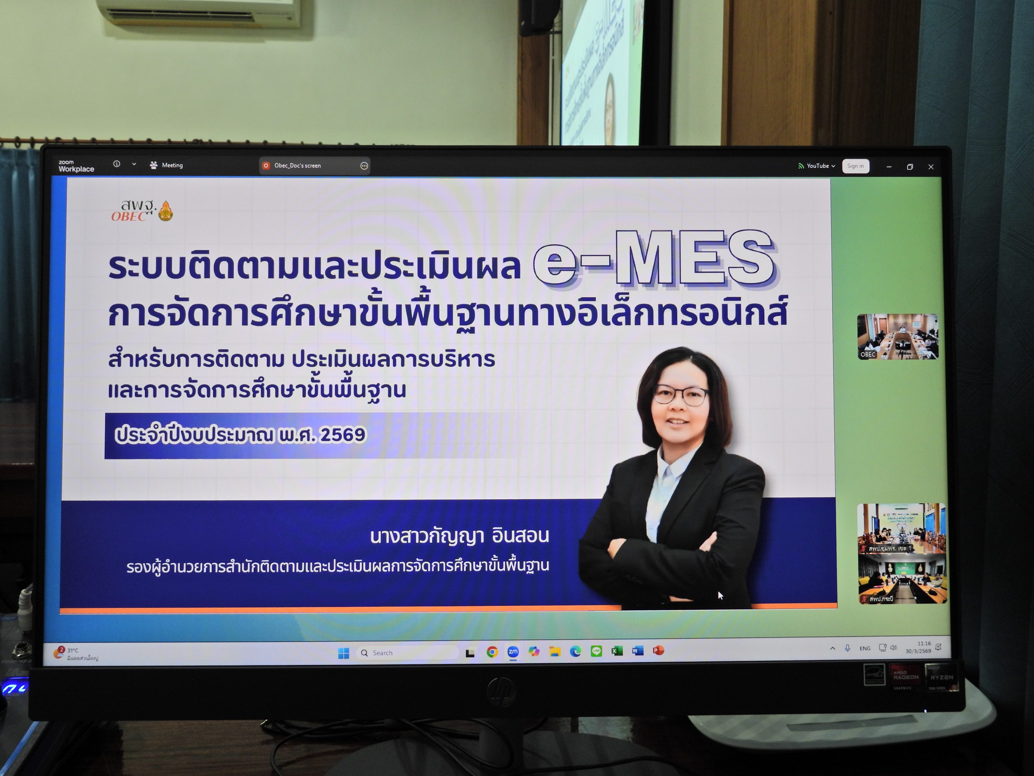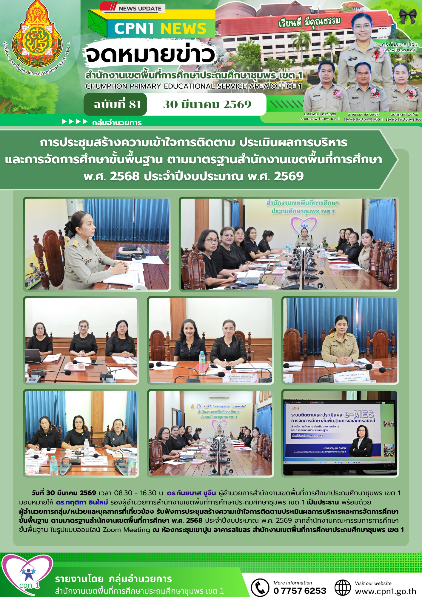 วันที่ 30 มีนาคม 2569 เวลา 08.30 – 16.30 น. ดร.กันยมาส ชูจีน ผู้อำนวยการสำนักงานเขตพื้นที่การศึกษาประถมศึกษาชุมพร เขต 1 มอบหมายให้ ดร.กฤติกา อินใหม่ รองผู้อำนวยการสำนักงานเขตพื้นที่การศึกษาประถมศึกษาชุมพร เขต 1 เป็นประธาน พร้อมด้วย ผู้อำนวยการกลุ่ม/หน่วยและบุคลากรที่เกี่ยวข้อง รับฟังการประชุมสร้างความเข้าใจการติดตามประเมินผลการบริหารและการจัดการศึกษาขั้นพื้นฐาน ตามมาตรฐานสำนักงานเขตพื้นที่การศึกษา พ.ศ. 2568 ประจำปีงบประมาณ พ.ศ. 2569 จากสำนักงานคณะกรรมการการศึกษาขั้นพื้นฐาน ในรูปแบบออนไลน์ Zoom Meeting ณ ห้องกระชุมเขาปูน อาคารสโมสร สำนักงานเขตพื้นที่การศึกษาประถมศึกษาชุมพร เขต 1