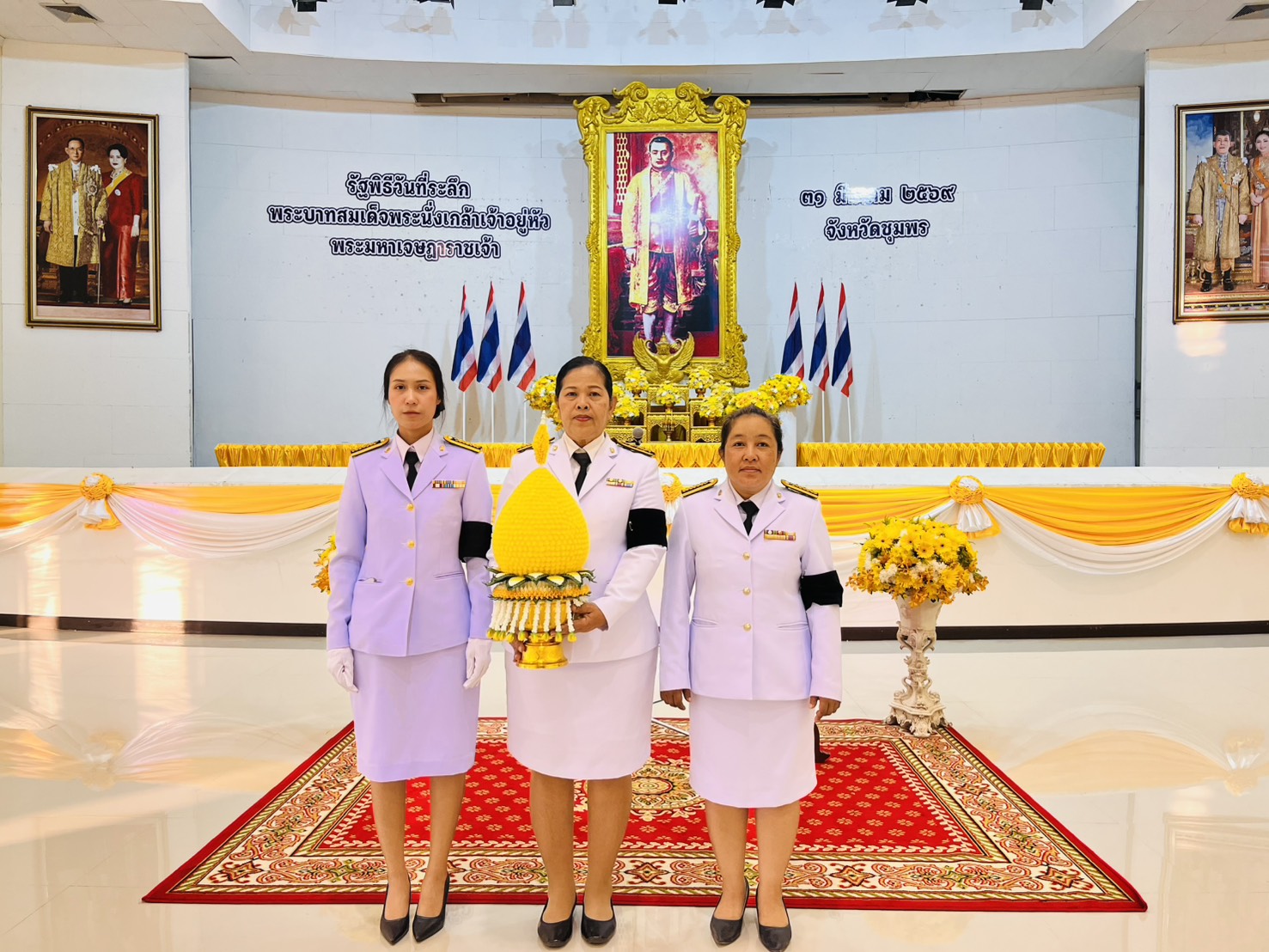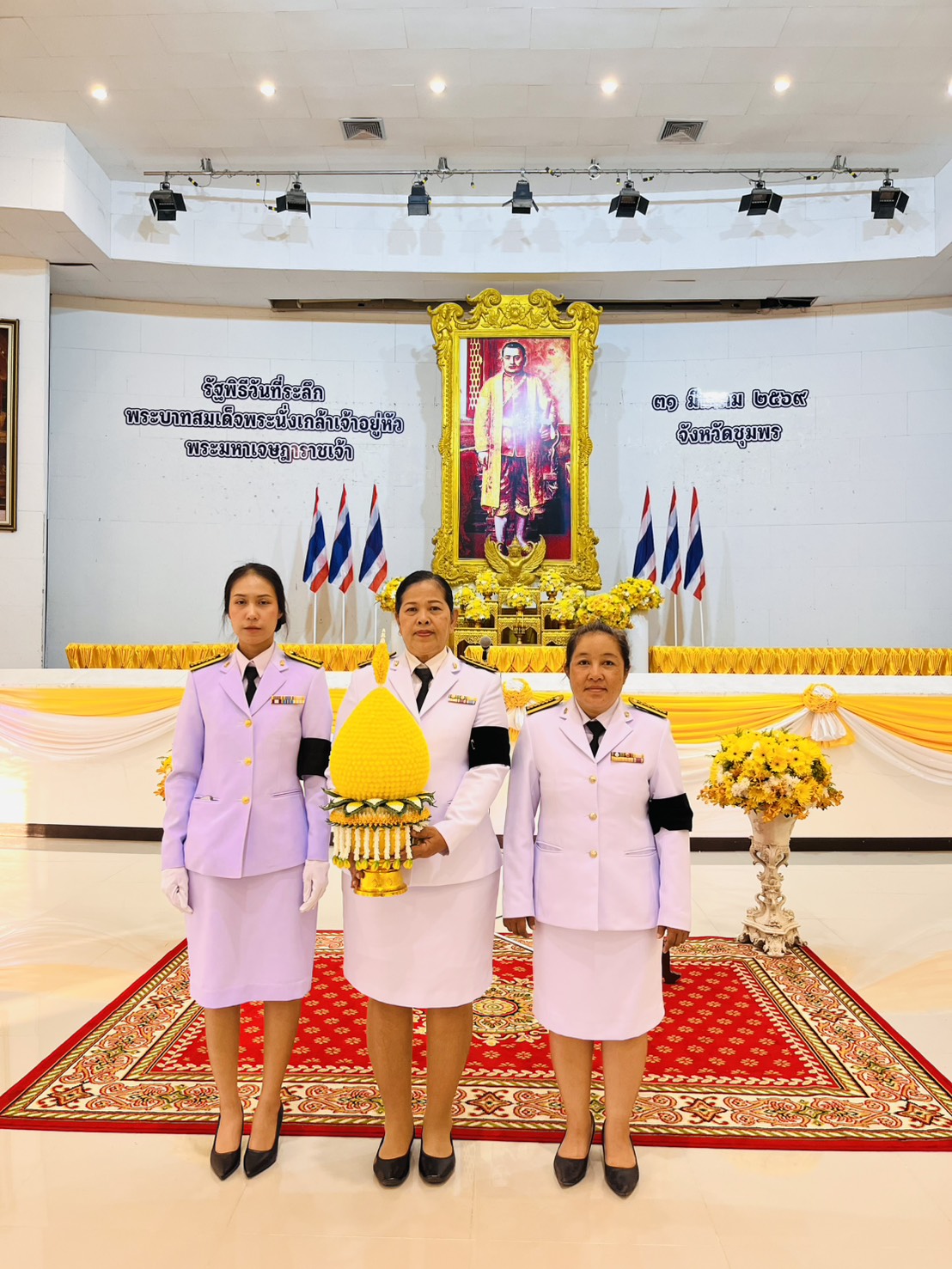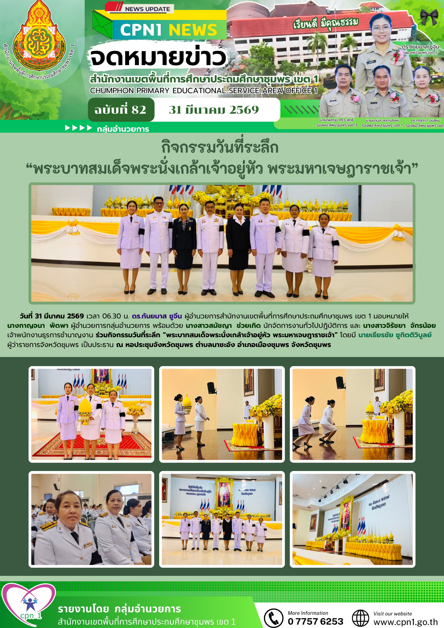 วันที่ 31 มีนาคม 2569 เวลา 06.30 น. ดร.กันยมาส ชูจีน ผู้อำนวยการสำนักงานเขตพื้นที่การศึกษาประถมศึกษาชุมพร เขต 1 มอบหมายให้ นางกาญจนา พัดพา ผู้อำนวยการกลุ่มอำนวยการ พร้อมด้วย นางสาวสมัชญา ช่วยเกิด นักจัดการงานทั่วไปปฏิบัติการ และ นางสาวจิรัชยา จักรน้อย เจ้าพนักงานธุรการชำนาญงาน ร่วมกิจกรรมวันที่ระลึก "พระบาทสมเด็จพระนั่งเกล้าเจ้าอยู่หัว พระมหาเจษฎาราชเจ้า" โดยมี นายเธียรชัย ชูกิตติวิบูลย์ ผู้ว่าราชการจังหวัดชุมพร เป็นประธานณ หอประชุมจังหวัดชุมพร ตำบลนาชะอัง อำเภอเมืองชุมพร จังหวัดชุมพร
