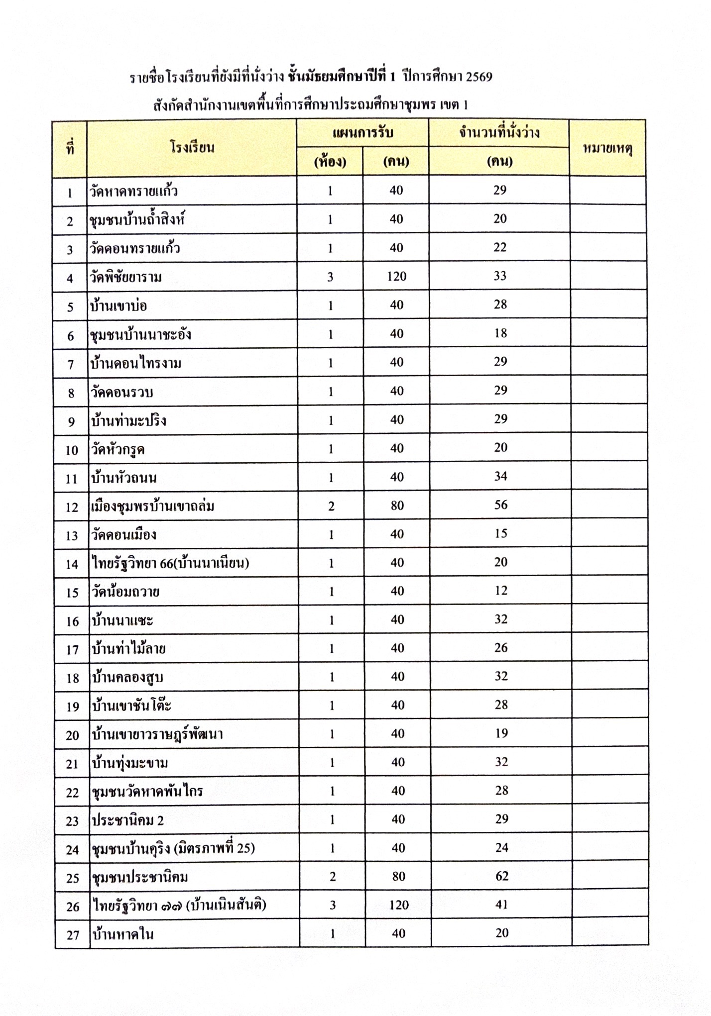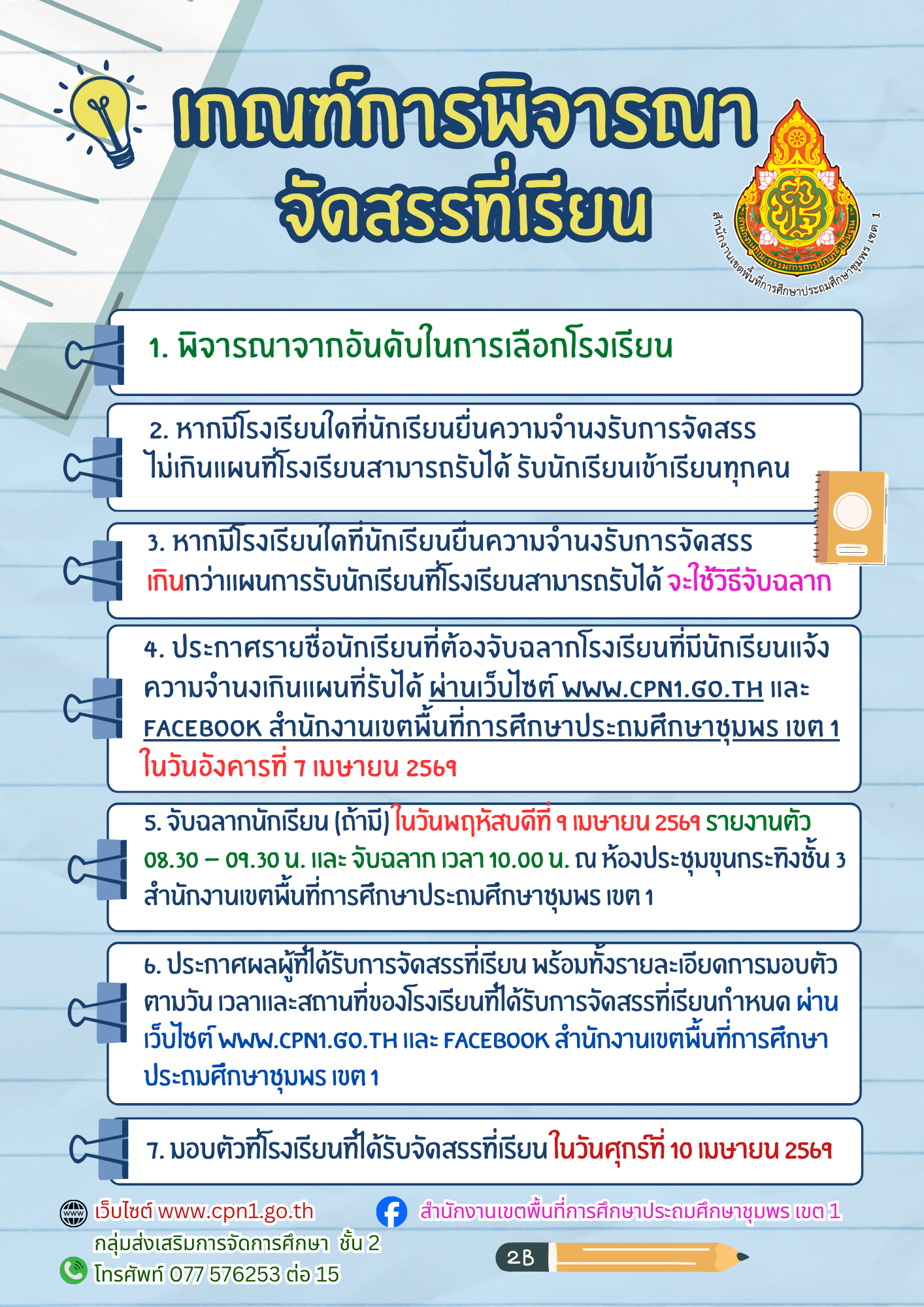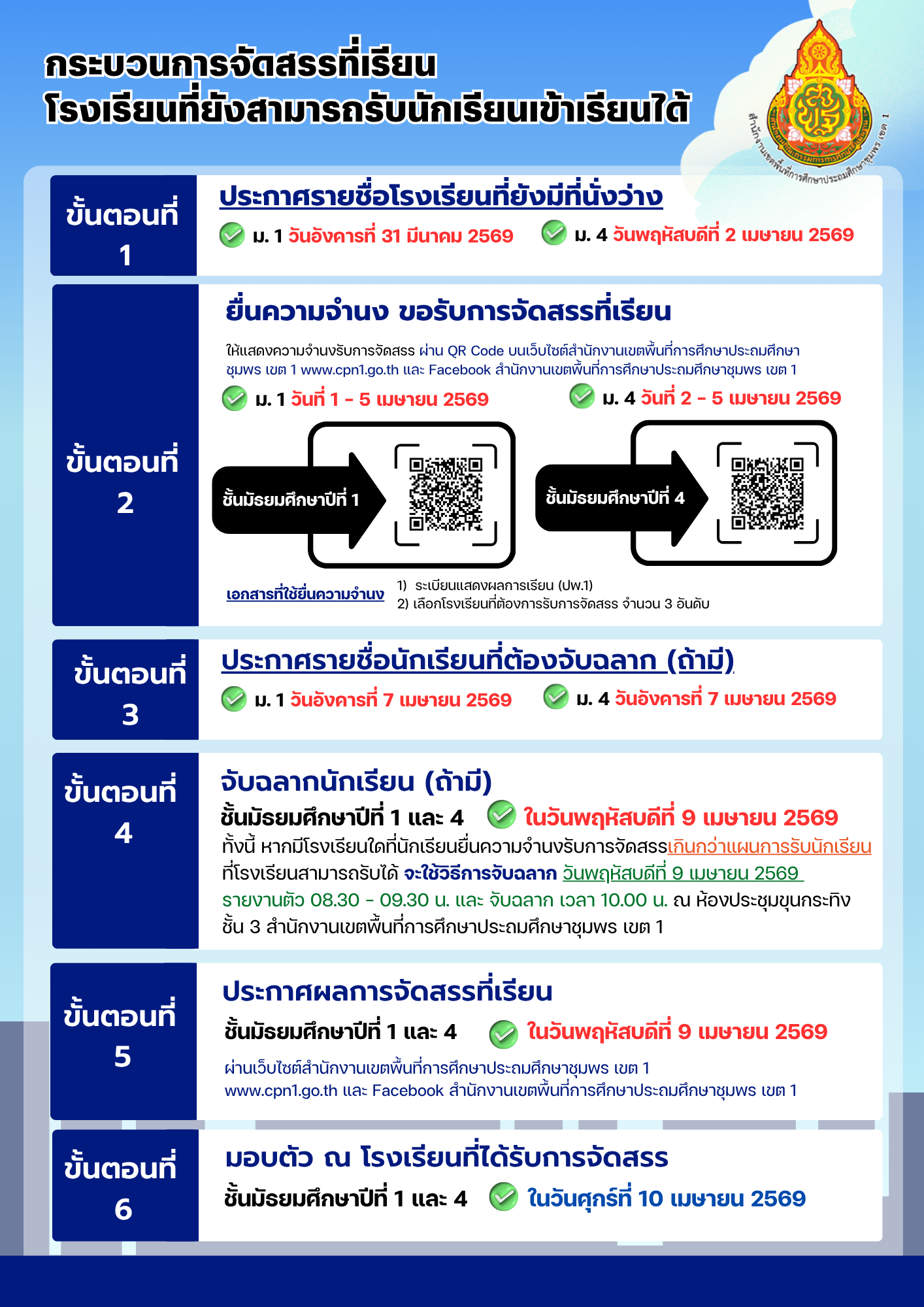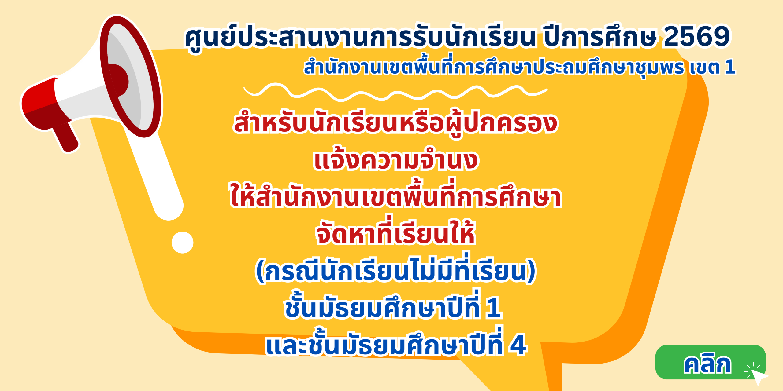 การจัดสรรที่เรียนระดับชั้นมัธยมศึกษาปีที่ 1 และชั้นมัธยมศึกษาปีที่ 4 ปีการศึกษา 2569 31 มีนาคม 256931 มีนาคม 2026 กลุ่มส่งเสริมการจัดการศึกษา สพป.ชพ.1 ข่าวและกิจกรรมกลุ่มส่งเสริมการจัดการศึกษา, งานส่งเสริมการจัดการศึกษาในรูปแบบการศึกษาในระบบ FacebookFacebookXXLINELine กลุ่มส่งเสริมการจัดการศึกษา สพป.ชพ.1