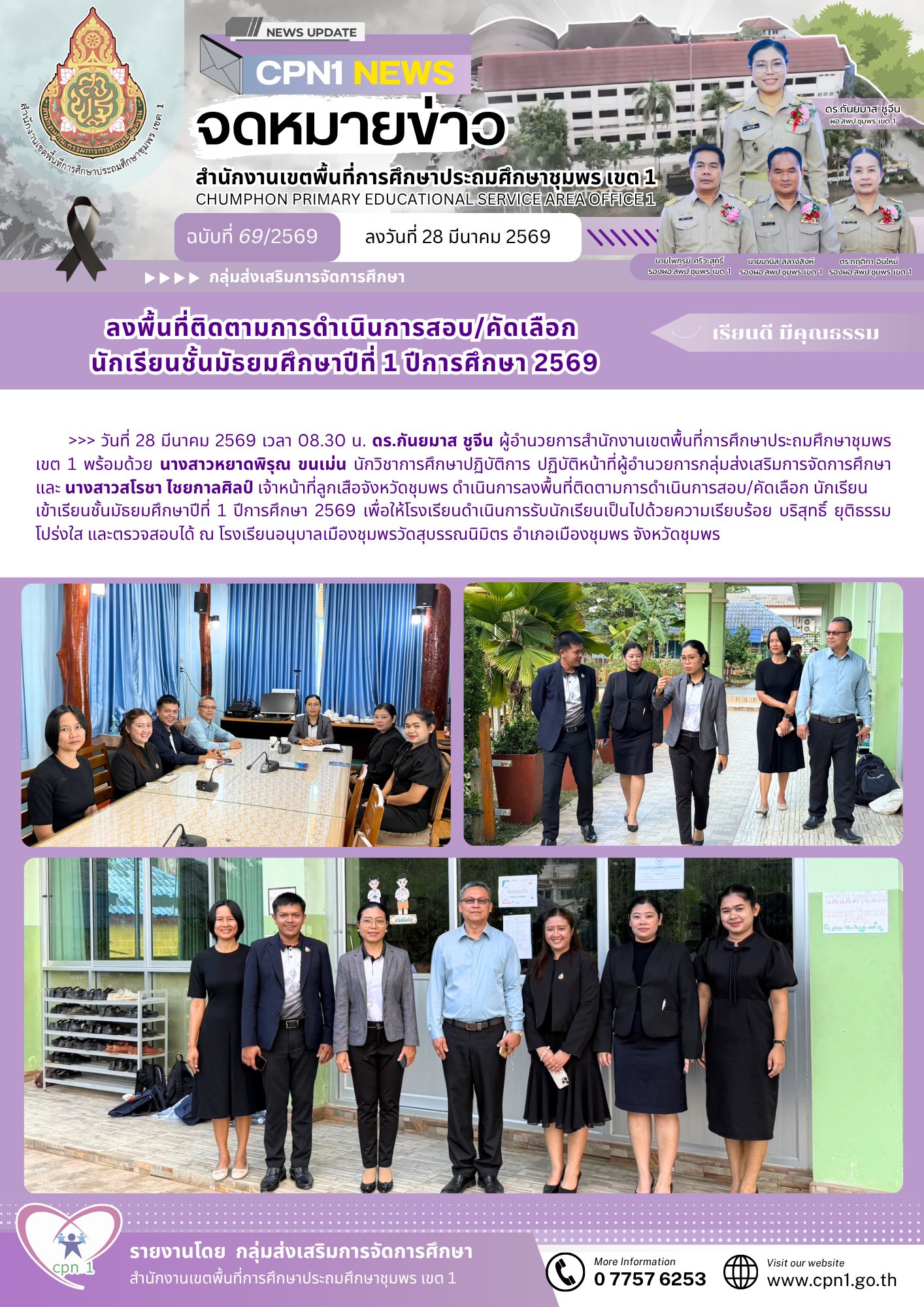 >> วันที่ 28 มีนาคม 2569 เวลา 08.30 น. ดร.กันยมาส ชูจีน ผู้อำนวยการสำนักงานเขตพื้นที่การศึกษาประถมศึกษาชุมพร เขต 1 พร้อมด้วย นางสาวหยาดพิรุณ ขนเม่น นักวิชาการศึกษาปฏิบัติการ ปฏิบัติหน้าที่ผู้อำนวยการกลุ่มส่งเสริมการจัดการศึกษา และ นางสาวสโรชา ไชยกาลศิลป์ เจ้าหน้าที่ลูกเสือจังหวัดชุมพร ดำเนินการลงพื้นที่ติดตามการดำเนินการสอบ/คัดเลือก นักเรียนเข้าเรียนชั้นมัธยมศึกษาปีที่ 1 ปีการศึกษา 2569 เพื่อให้โรงเรียนดำเนินการรับนักเรียนเป็นไปด้วยความเรียบร้อย บริสุทธิ์ ยุติธรรม โปร่งใส และตรวจสอบได้ ณ โรงเรียนอนุบาลเมืองชุมพรวัดสุบรรณนิมิตร อำเภอเมืองชุมพร จังหวัดชุมพร